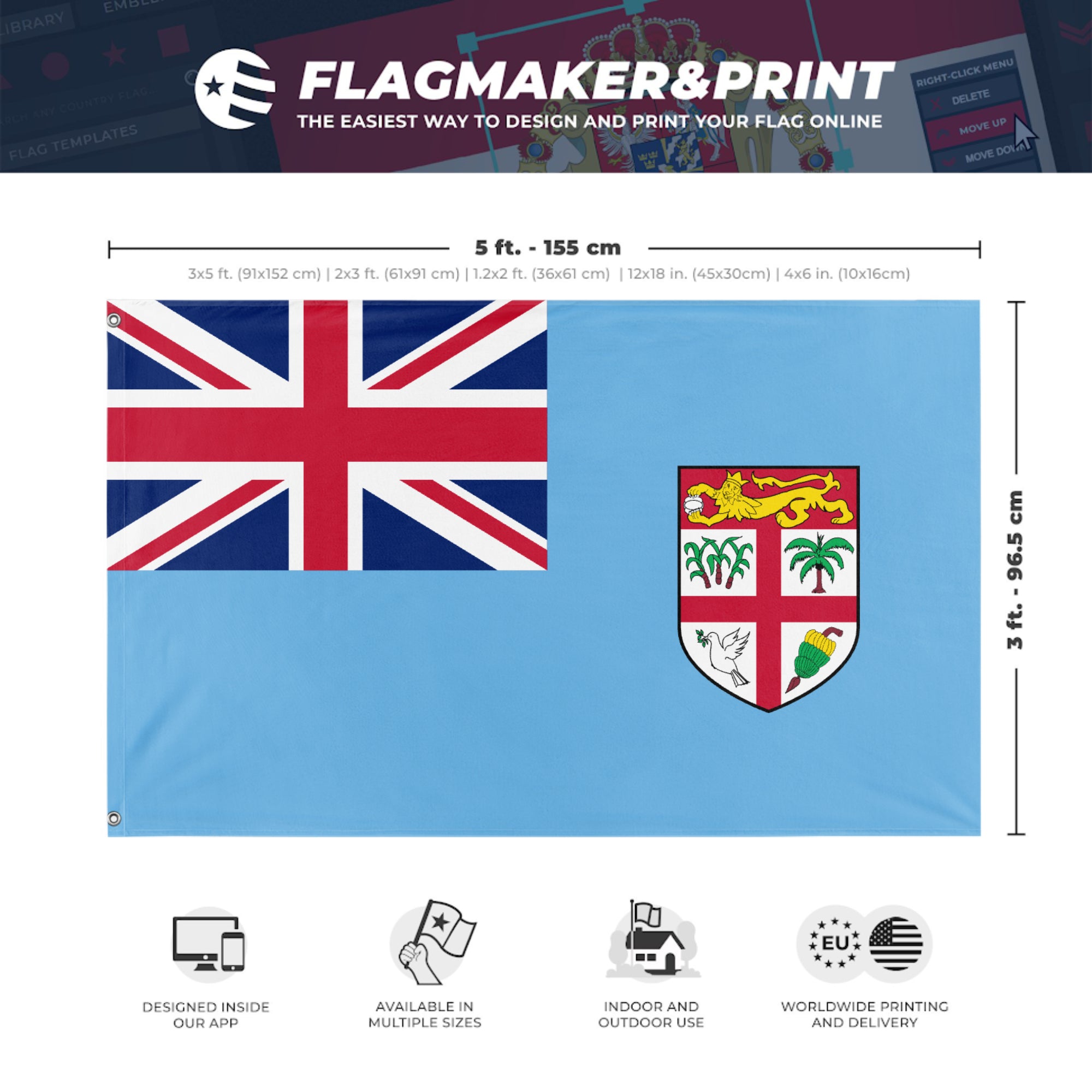 ✒️ The flag of Fiji features a light blue field with the Union Jack in the upper hoist-side quadrant, symbolizing the country’s historical ties to the United Kingdom. On the fly side is the shield from the national coat of arms, which depicts a red cross on a white background with images representing agriculture, including a sugar cane, coconut palm, bananas, and a dove of peace. The light blue color represents the Pacific Ocean surrounding the islands. Officially adopted on October 10, 1970, upon independence, the flag reflects Fiji’s colonial heritage, natural environment, and national identity.