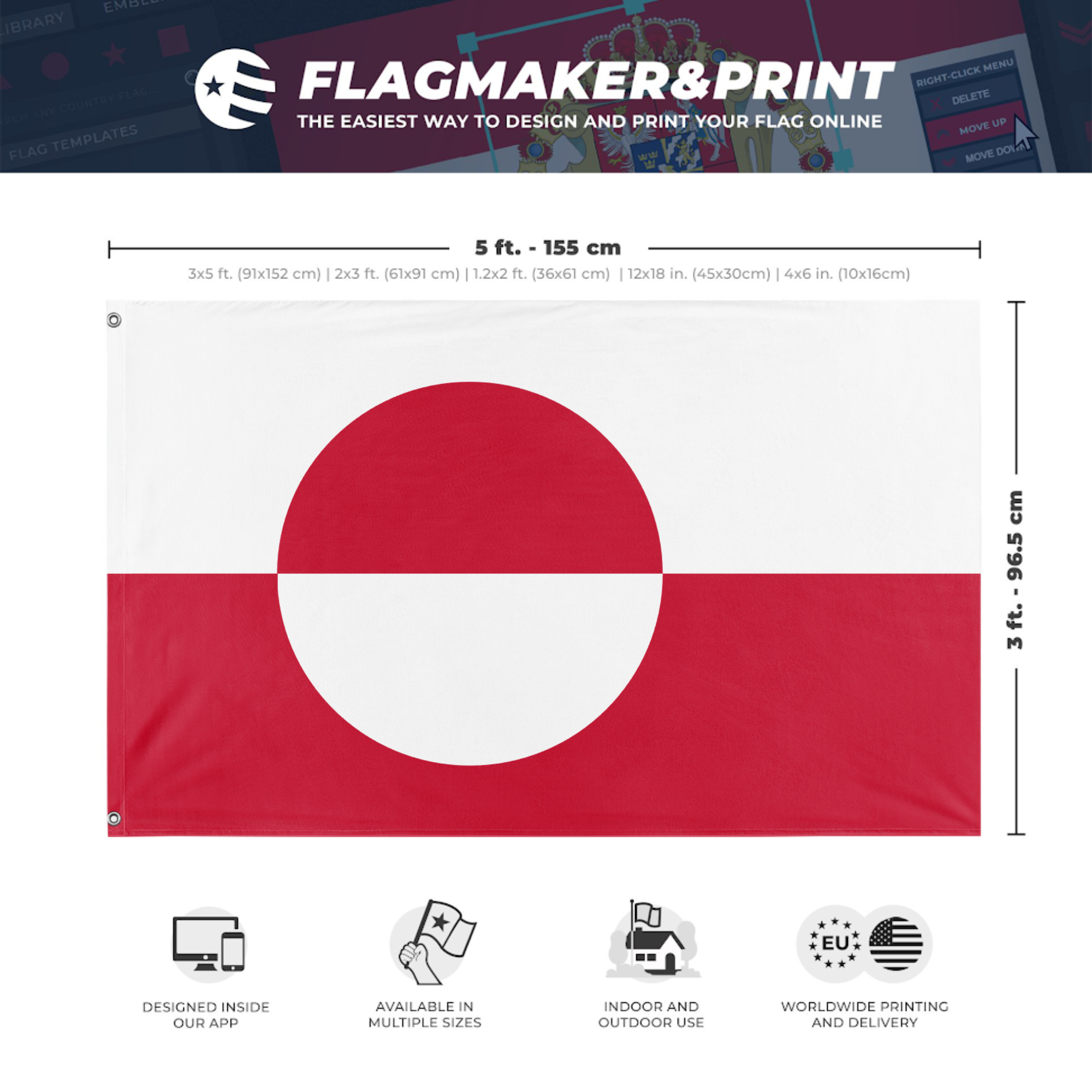 Our integrated flag maker app allows anyone to design and print their own flag. After finishing your design, you can print your flag in three easy steps.