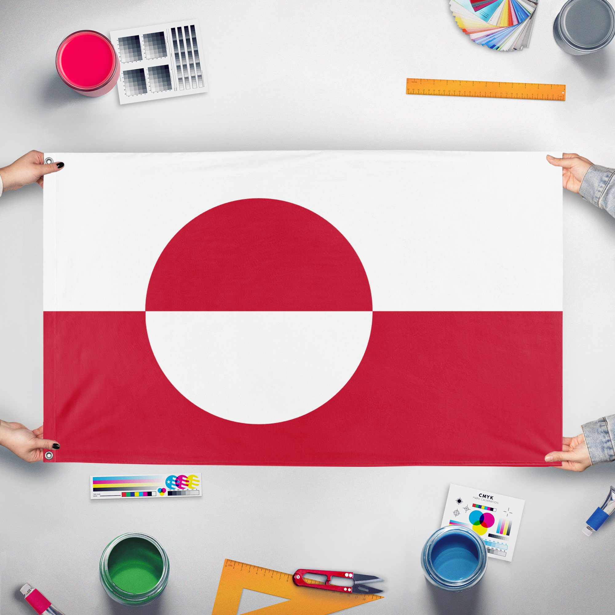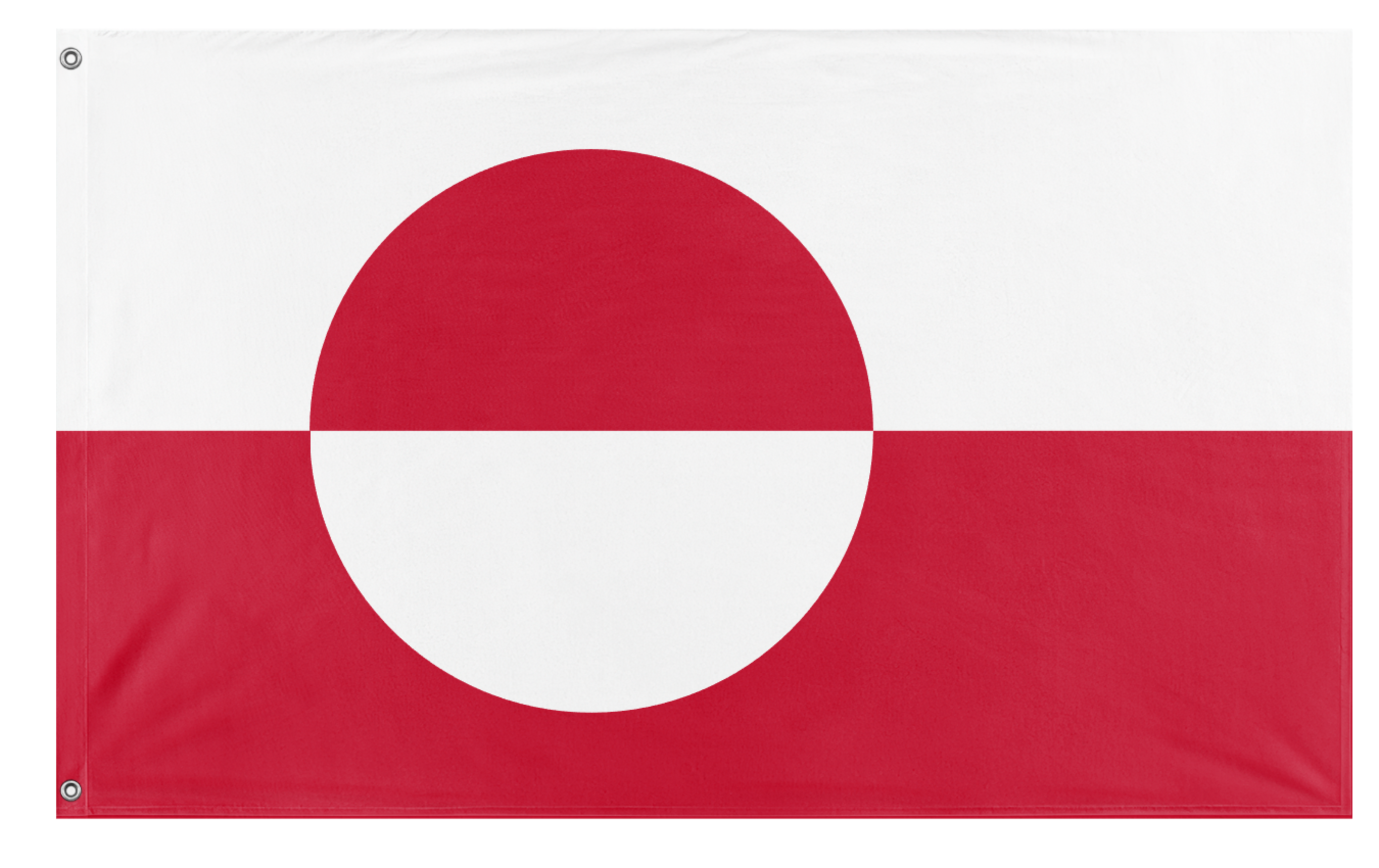 The flag of Greenland (Greenlandic: Erfalasorput, meaning “our flag”) consists of two equal horizontal bands of white (top) and red (bottom), with a large circle slightly offset toward the hoist. The circle is divided horizontally, with red on the upper half and white on the lower half, mirroring the background colors. The white field represents Greenland’s ice cap and snow-covered landscape, while the red symbolizes the surrounding ocean and the sun as it touches the horizon. The circular emblem evokes both the sun and an iceberg floating at sea, making the design a stylized representation of Greenland’s Arctic environment and maritime identity.