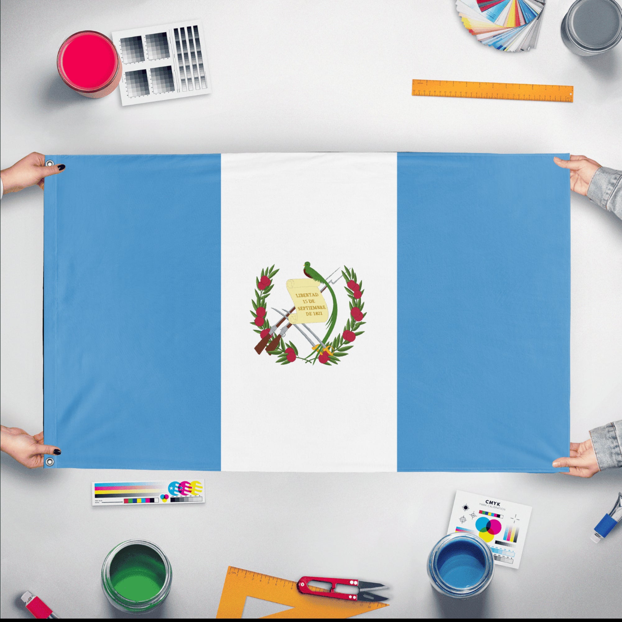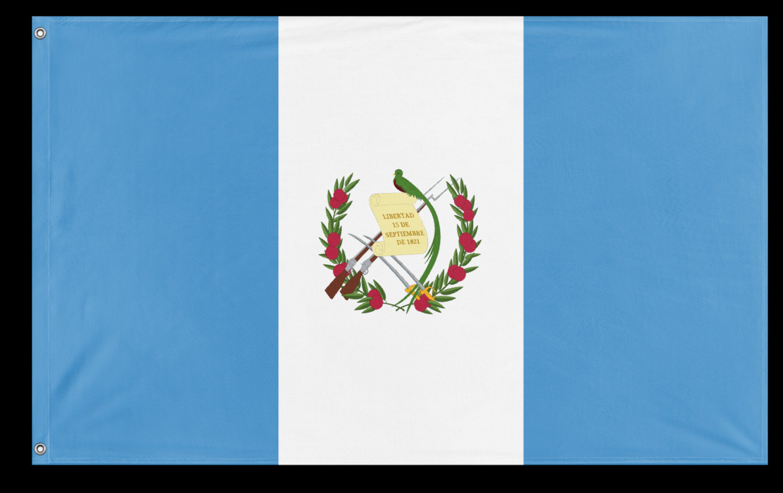 ✒️ The flag of Guatemala features three vertical stripes of light blue, white, and light blue, with the national coat of arms centered on the white stripe. The blue stripes represent the Pacific Ocean and the Caribbean Sea, which border the country, while the white symbolizes peace and purity. The coat of arms includes a quetzal bird, symbolizing liberty, perched on a scroll bearing the date of Central American independence, along with crossed rifles and swords, signifying Guatemala’s readiness to defend itself. Officially adopted on August 17, 1871, the flag embodies Guatemala’s sovereignty, history, and values.