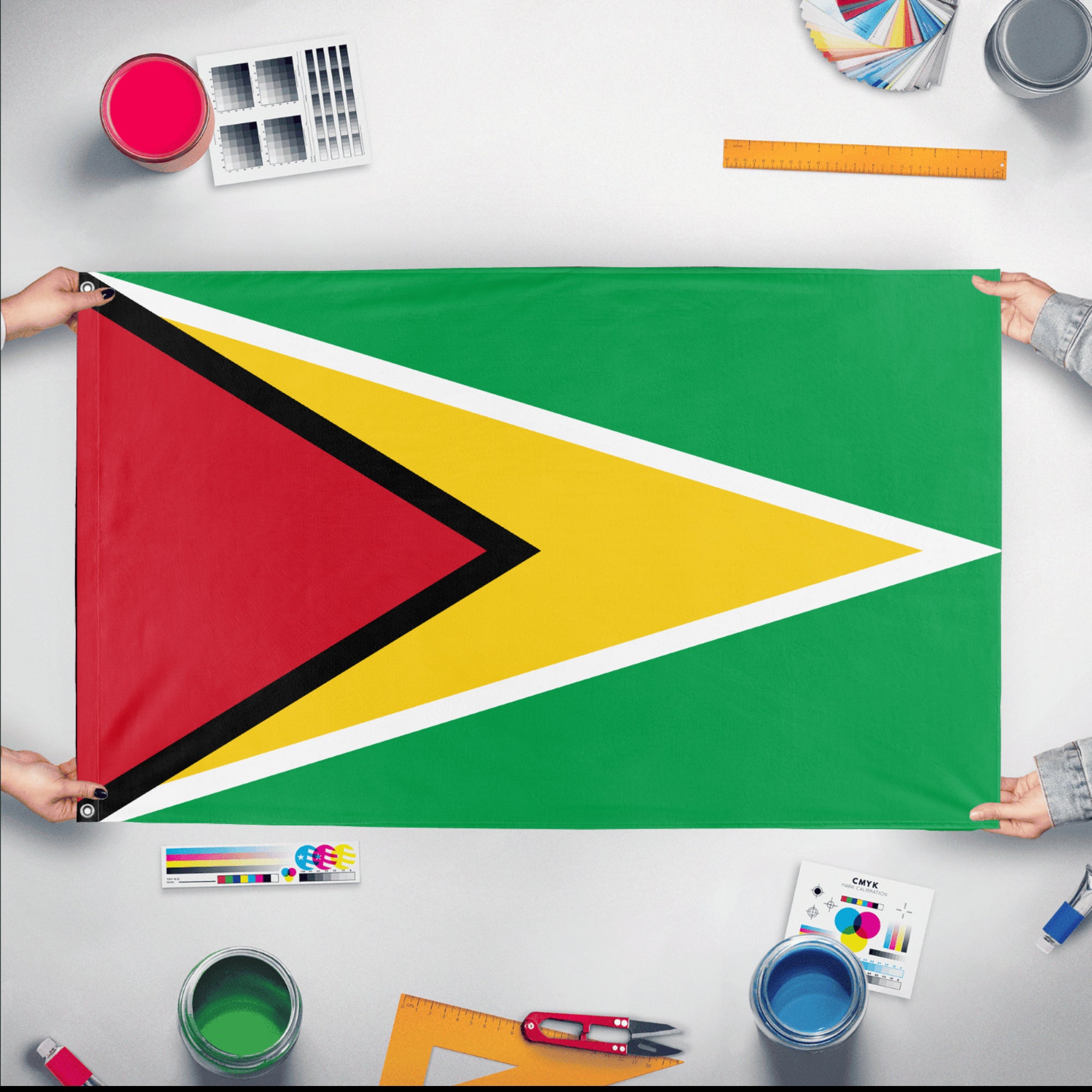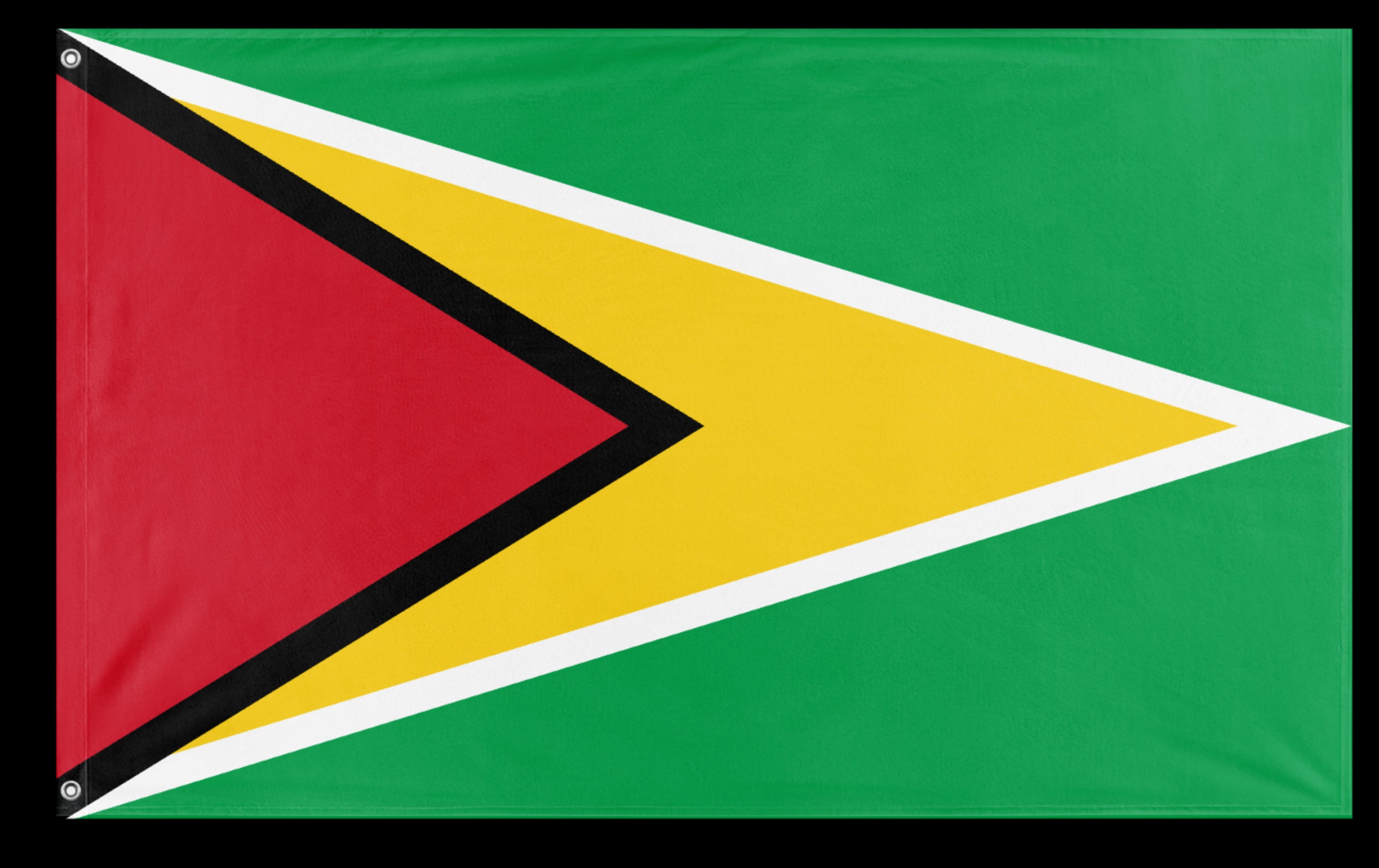 ✒️ The flag of Guyana, known as "The Golden Arrowhead," features a green field with a large, golden-yellow isosceles triangle outlined in white, superimposed on a red equilateral triangle outlined in black at the hoist. The green symbolizes the country's forests and agriculture, the gold represents mineral wealth, the red stands for the zeal and dynamic nature of the nation, the white signifies rivers and water, and the black outlines reflect endurance. Officially adopted on May 26, 1966, upon independence from the United Kingdom, the flag embodies Guyana’s natural resources, history, and aspirations for progress.