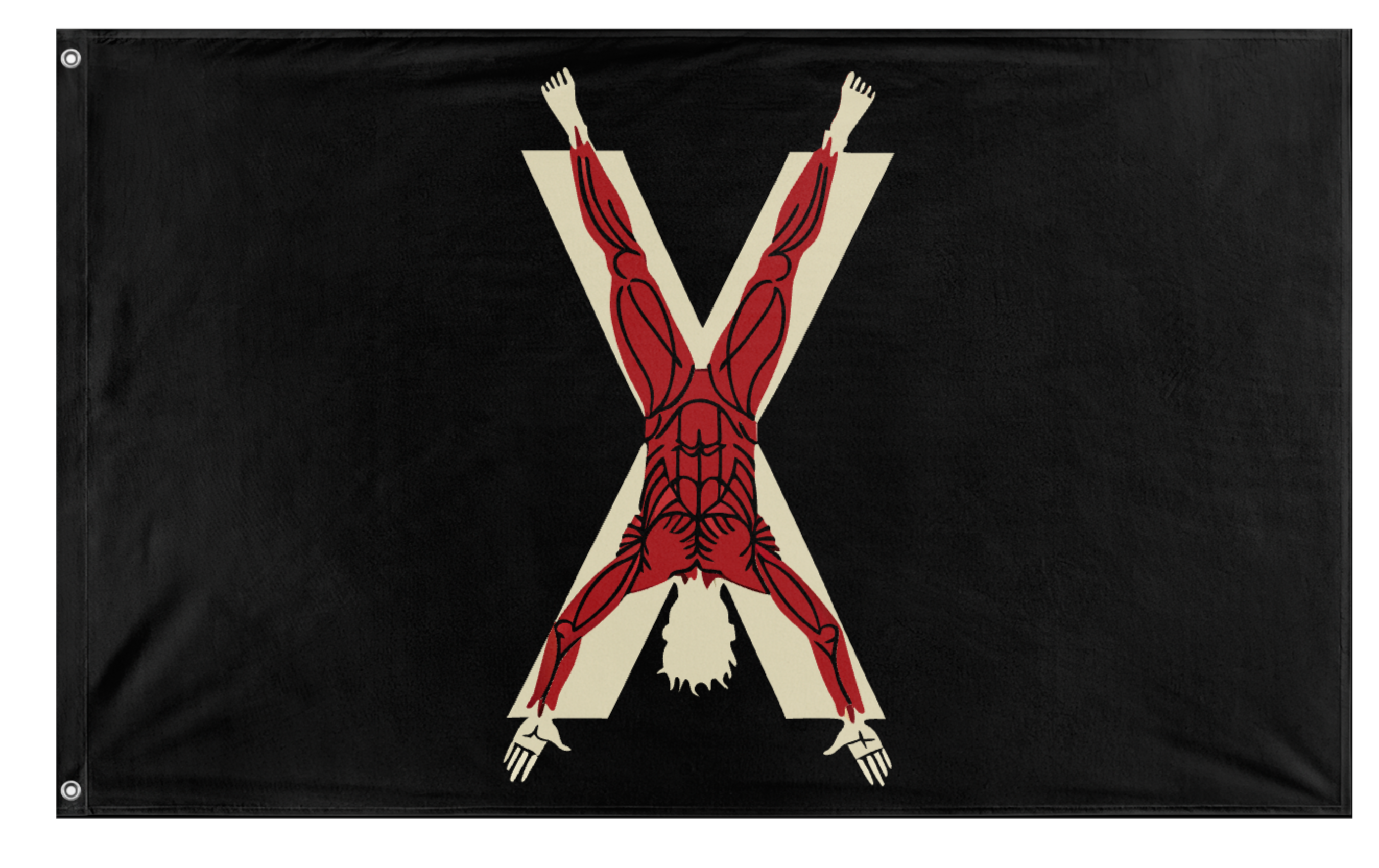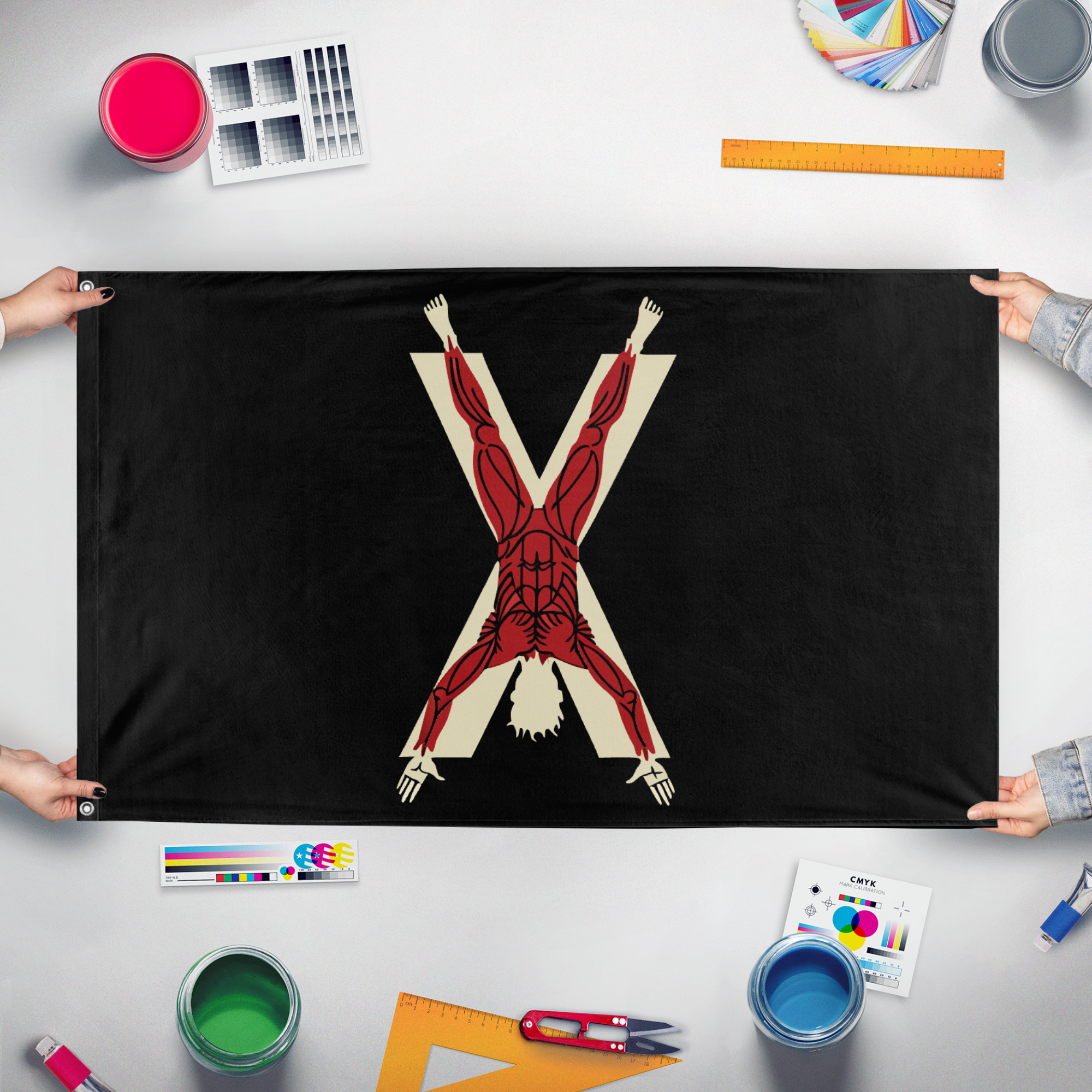 The Flag of House Bolt is a fictional heraldic banner from the Game of Thrones universe. It depicts a stark black field charged with a pale, diagonal saltire (X-shaped cross), overlaid by a red, cruciform human figure stretched along the arms of the saltire. The figure is stylized and anatomical, emphasizing exposed musculature and outstretched limbs, creating a visually arresting and severe composition. The high-contrast palette of black, white, and red reinforces themes of violence, punishment, and dominance commonly associated with brutal or feared noble houses in Westerosi heraldry.