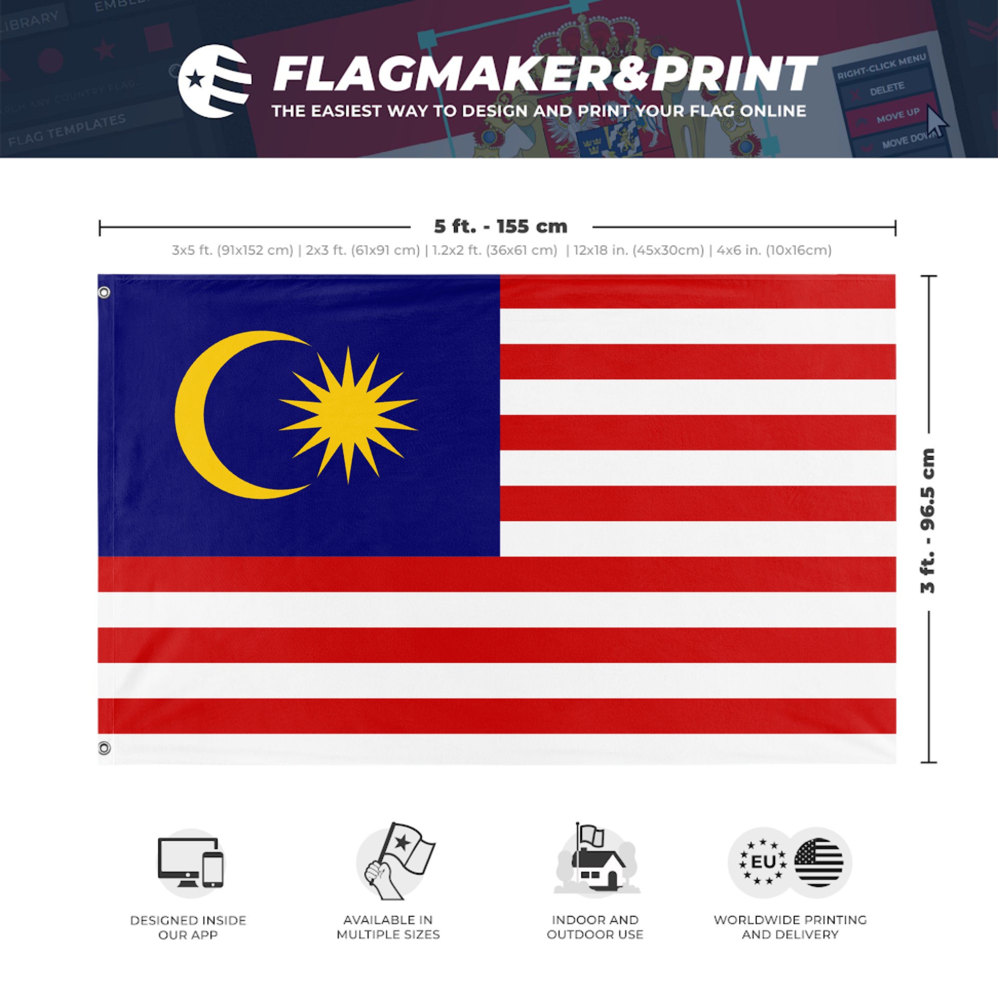 ✒️ The flag of Malaysia, known as the Jalur Gemilang, features fourteen alternating red and white horizontal stripes representing the equal status of the thirteen member states and the federal government. In the canton, a blue field bears a yellow crescent and a fourteen-pointed star, symbolizing Islam as the official religion and the unity of the states, respectively. The blue signifies the unity of the Malaysian people, while the yellow color represents the royal color of the Malay rulers. Adopted on September 16, 1963, the flag embodies Malaysia’s federal structure, cultural diversity, and Islamic heritage.