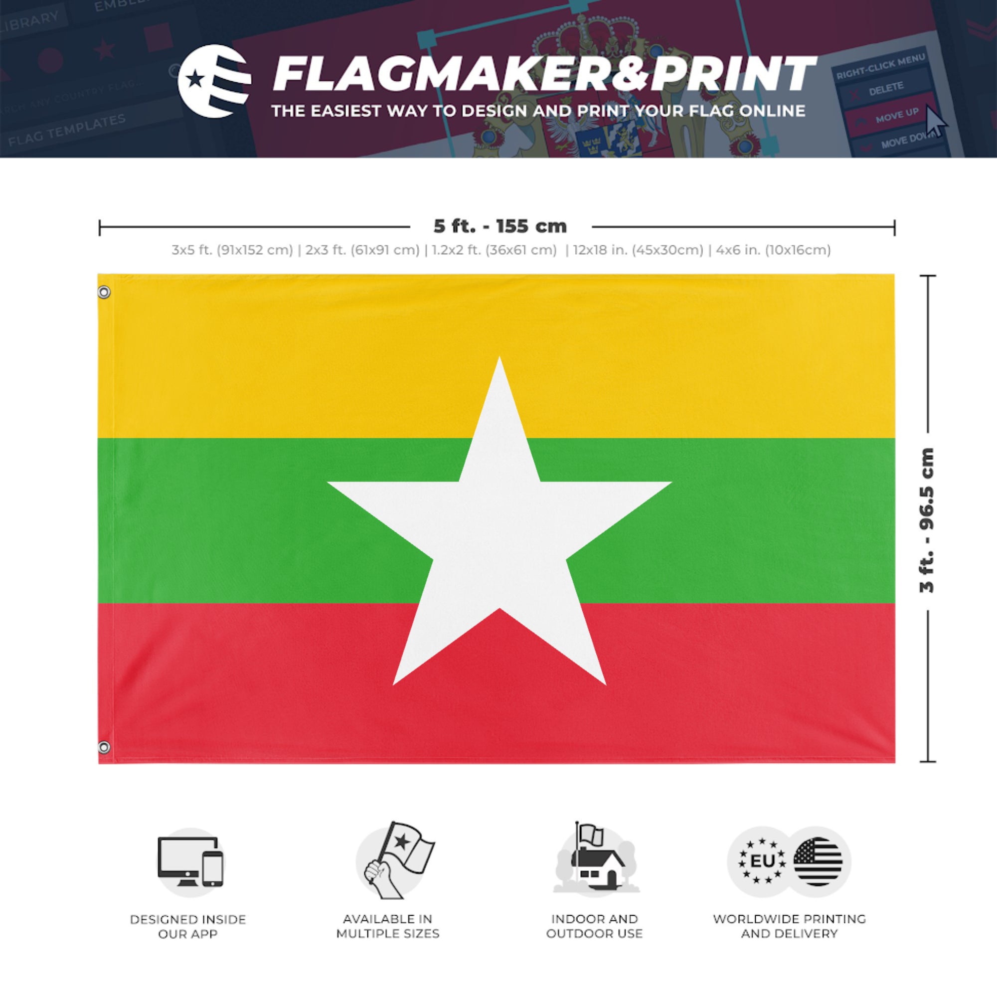 ✒️ The flag of Myanmar consists of three horizontal stripes of yellow, green, and red, with a large white five-pointed star centered on the green stripe. The yellow represents solidarity, the green symbolizes peace and environmental richness, and the red stands for courage and determination. The white star signifies the enduring unity of the country’s diverse ethnic groups. The flag was officially adopted on October 21, 2010, replacing the former socialist-era design, as part of the country's transition toward a new constitutional framework.