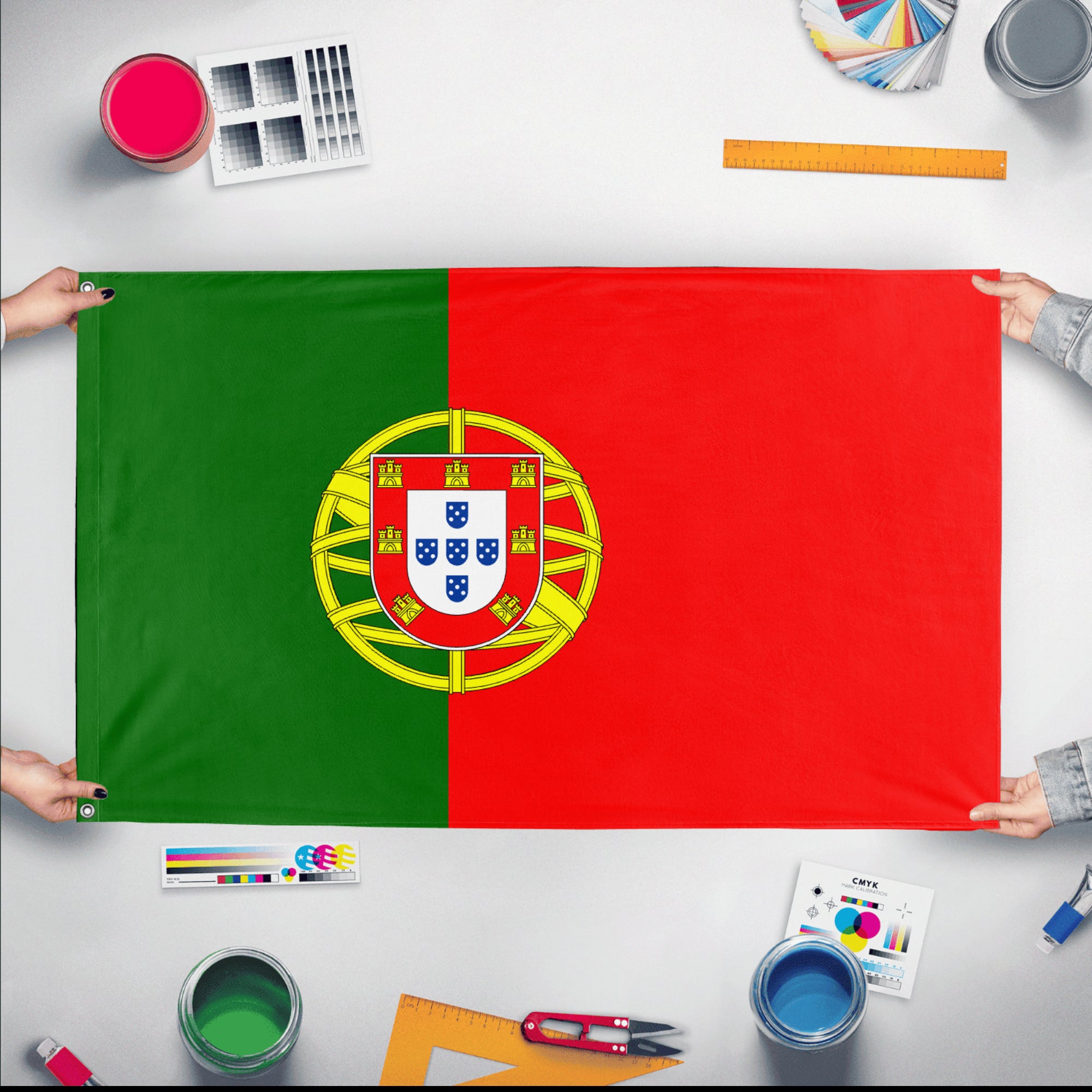 ✒️ The flag of Portugal features a vertical bicolor design of green and red, with the green occupying two-fifths of the hoist side and the red covering the remaining three-fifths. Centered over the boundary of the two colors is the national coat of arms, which consists of a complex shield containing five smaller blue shields arranged in a cross, each bearing five white dots, and bordered by a red shield with seven gold castles. Behind the shield lies a complex armillary sphere, symbolizing Portugal’s maritime history during the Age of Discoveries. Officially adopted on June 30, 1911, the flag reflects the nation’s republican values and historical legacy.