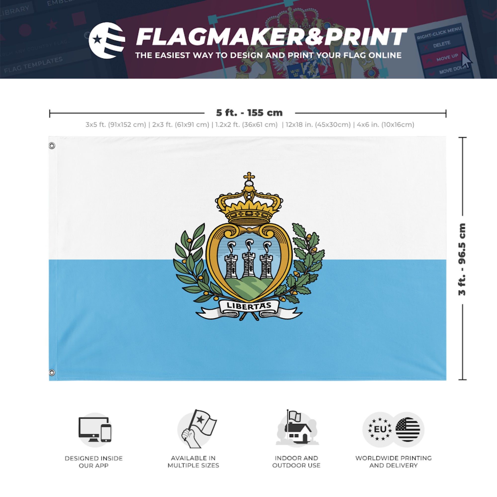 ✒️ The flag of San Marino consists of two equal horizontal bands of white on the top and light blue on the bottom, with the national coat of arms centered. Officially adopted on April 6, 1862, the flag reflects the values and identity of the Republic. The white symbolizes peace, while the light blue represents liberty. The coat of arms features a shield with three towers on three peaks, a closed crown symbolizing sovereignty, and a wreath of oak and laurel branches, along with a banner bearing the word Libertas, emphasizing the country’s historic commitment to freedom and independence.