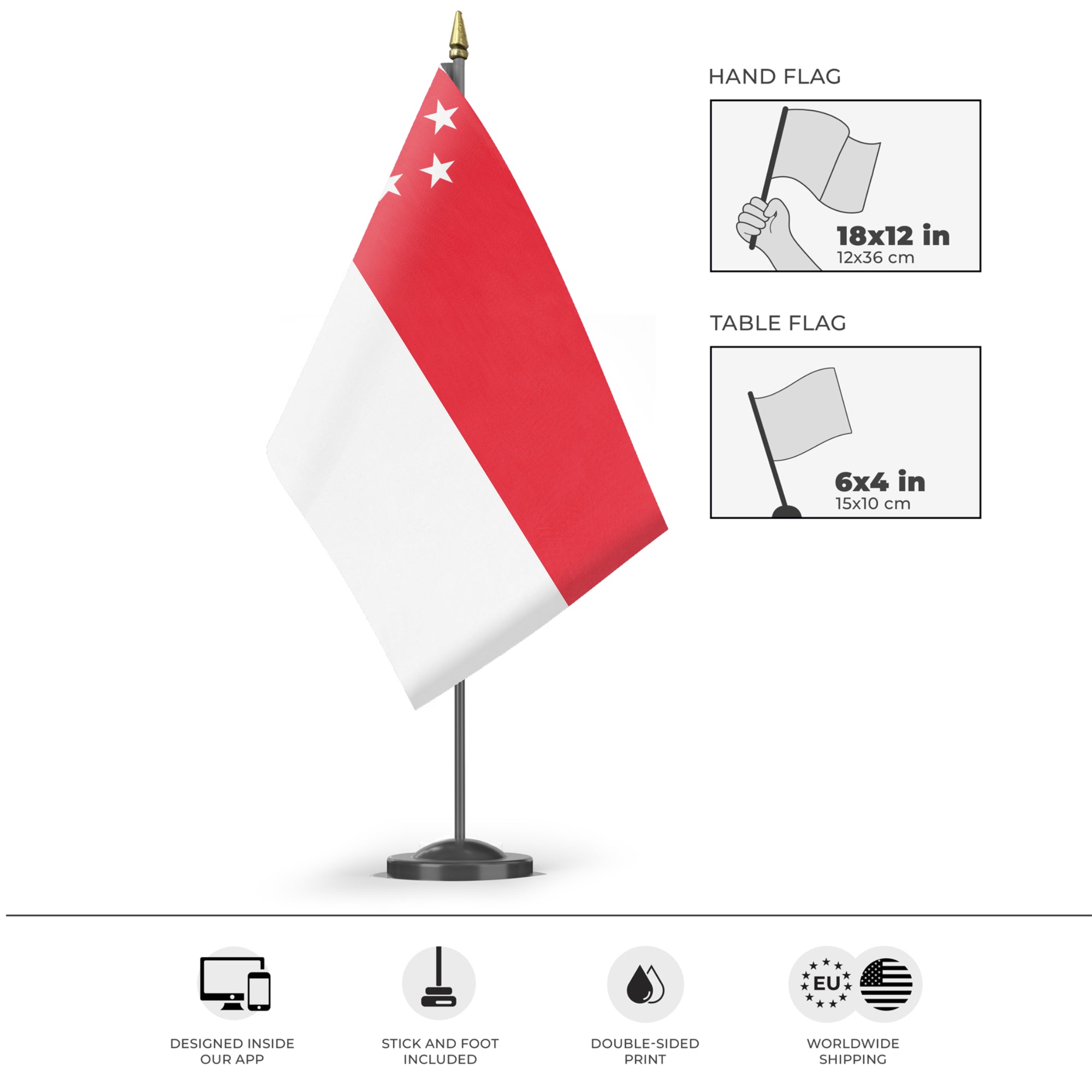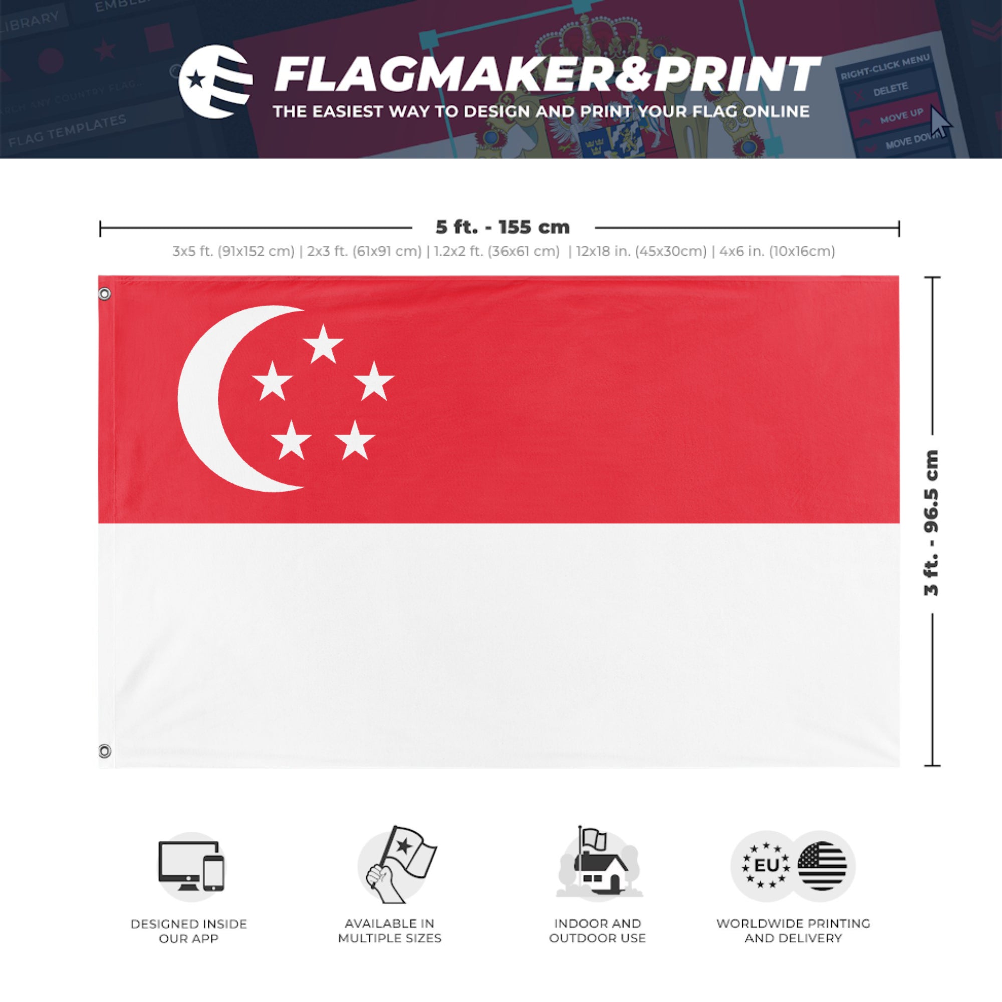 ✒️ The flag of Singapore features two horizontal bands of red over white, with a white crescent moon and five white five-pointed stars arranged in a circle located in the upper hoist-side corner. Officially adopted on December 3, 1959, the red symbolizes universal brotherhood and equality, while the white represents purity and virtue. The crescent moon signifies a young nation on the rise, and the five stars stand for the nation’s ideals of democracy, peace, progress, justice, and equality. The flag embodies Singapore’s values and aspirations as a sovereign city-state.