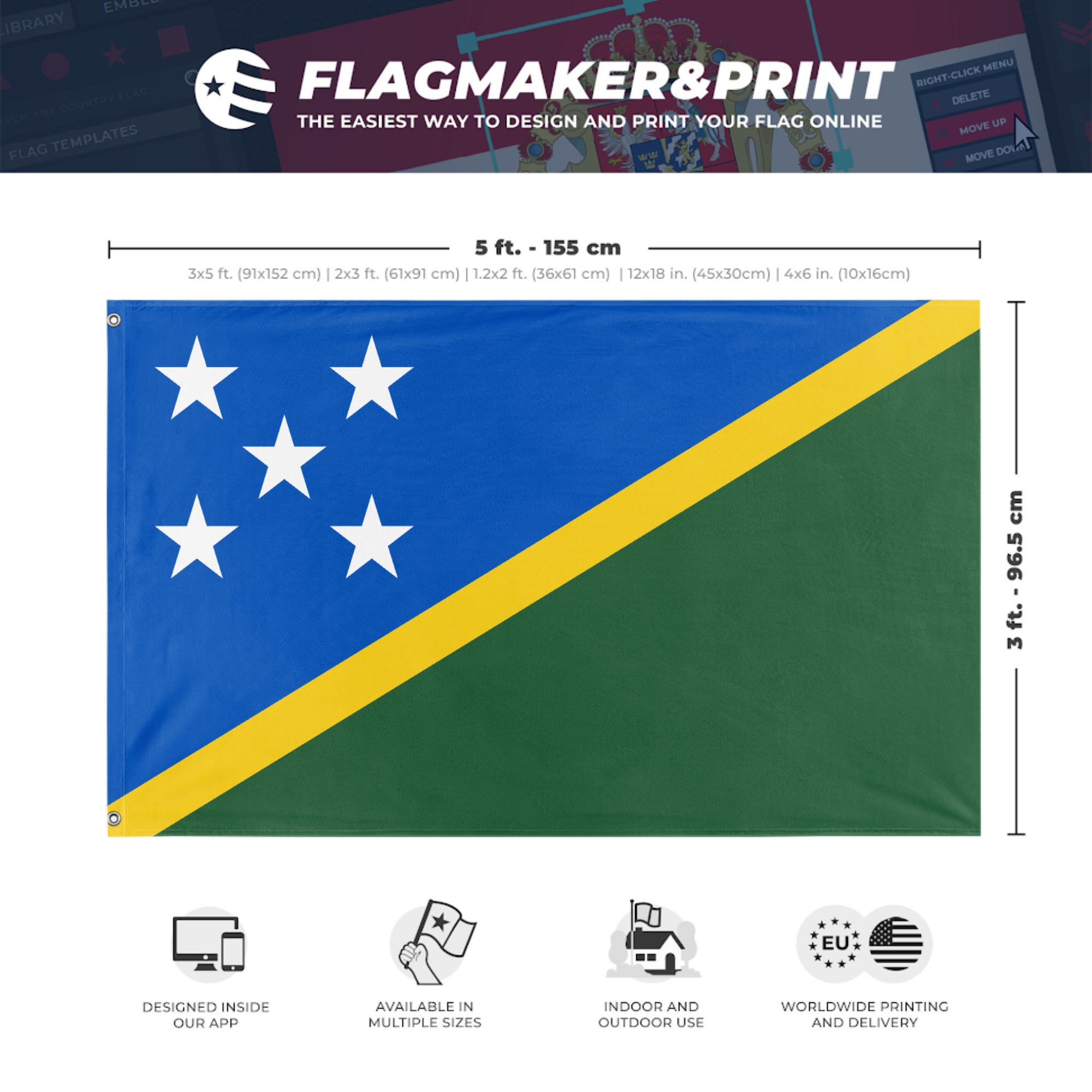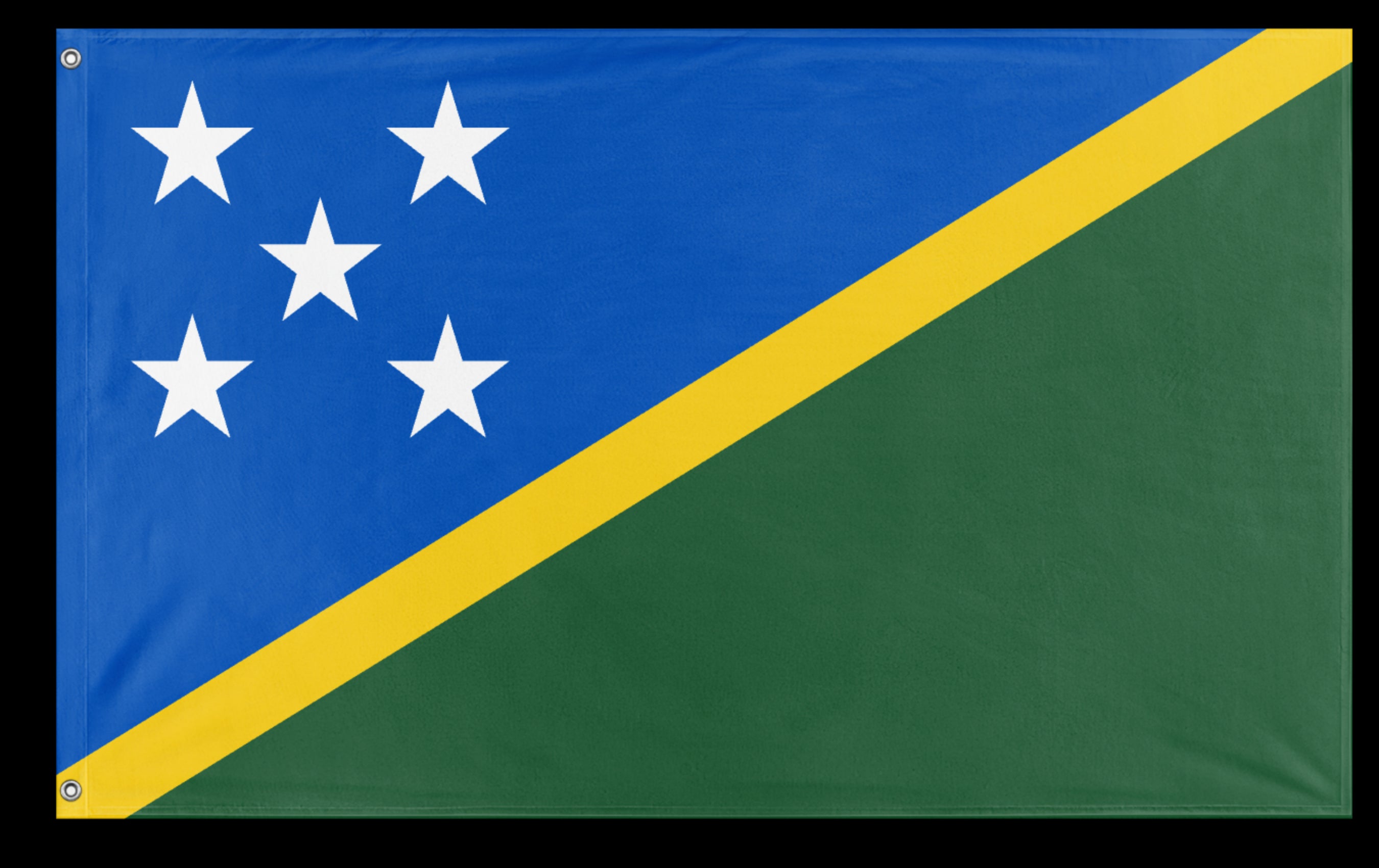 ✒️ The flag of the Solomon Islands features a diagonal yellow stripe dividing the field into two triangles: the upper triangle is blue with five white five-pointed stars arranged in an X pattern, and the lower triangle is green. Officially adopted on November 18, 1977, the flag’s colors and symbols represent the nation’s geography and cultural heritage. The blue symbolizes the surrounding ocean, the green represents the land and forests, the yellow stripe stands for the sun, and the five stars signify the five main island groups of the country.