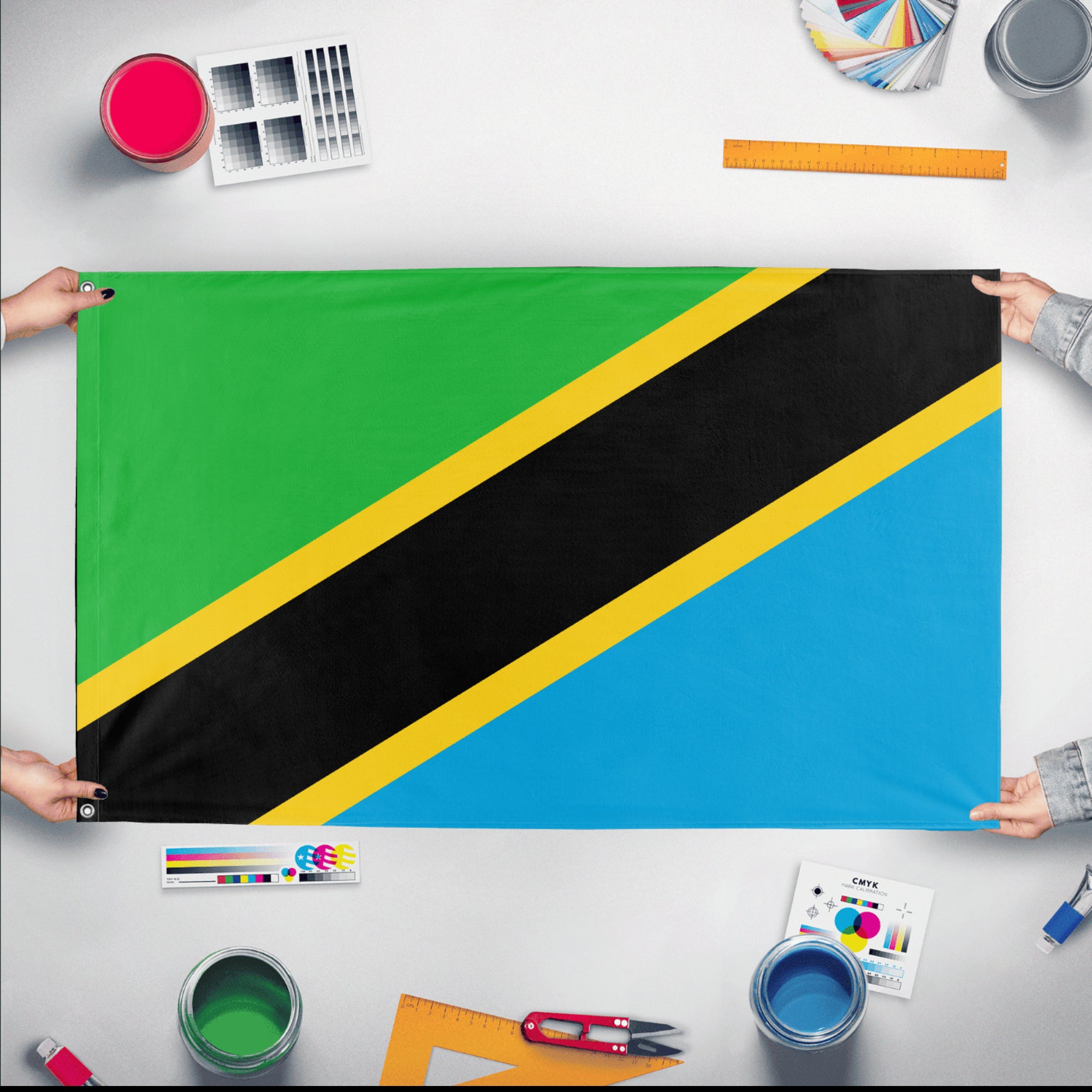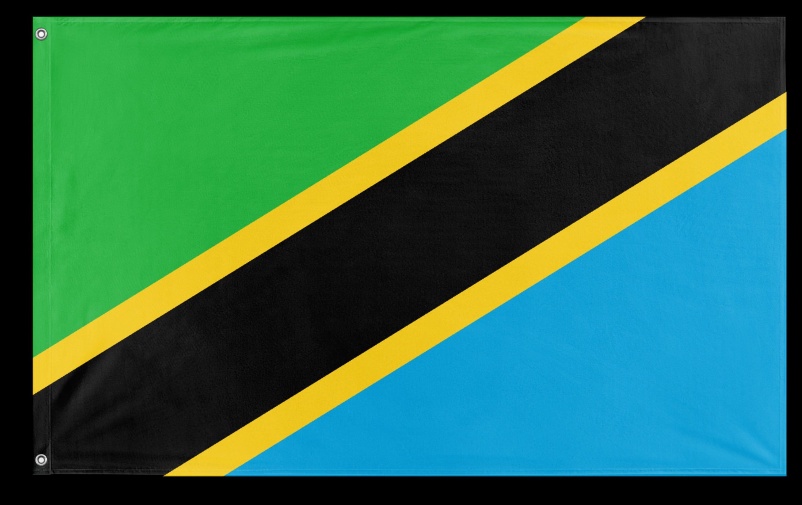 ✒️ The flag of Tanzania consists of a diagonal yellow-edged black band dividing the field into two triangles: the upper triangle is green and the lower triangle is blue. Officially adopted on June 30, 1964, following the union of Tanganyika and Zanzibar, the flag’s colors symbolize the country’s natural resources and heritage. The green represents the rich agricultural land, the blue stands for the Indian Ocean and the nation’s lakes, the black symbolizes the people of Tanzania, and the yellow stripes represent the country’s mineral wealth. The design reflects national unity and the diversity of Tanzania’s landscape and culture.