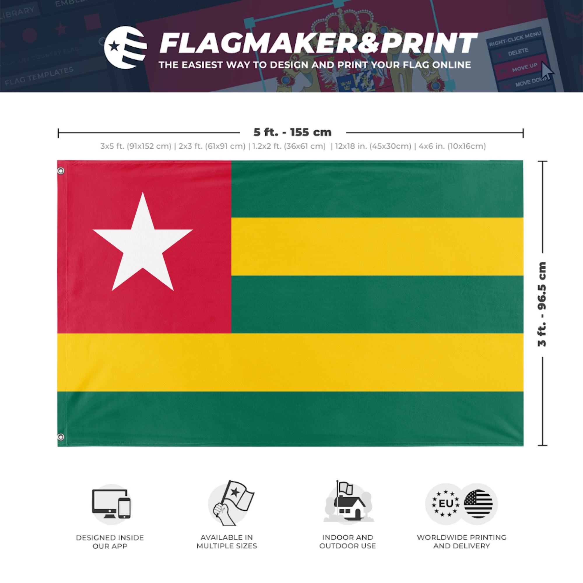 Our integrated flag maker app allows anyone to design and print their own flag. After finishing your design, you can print your flag in three easy steps.