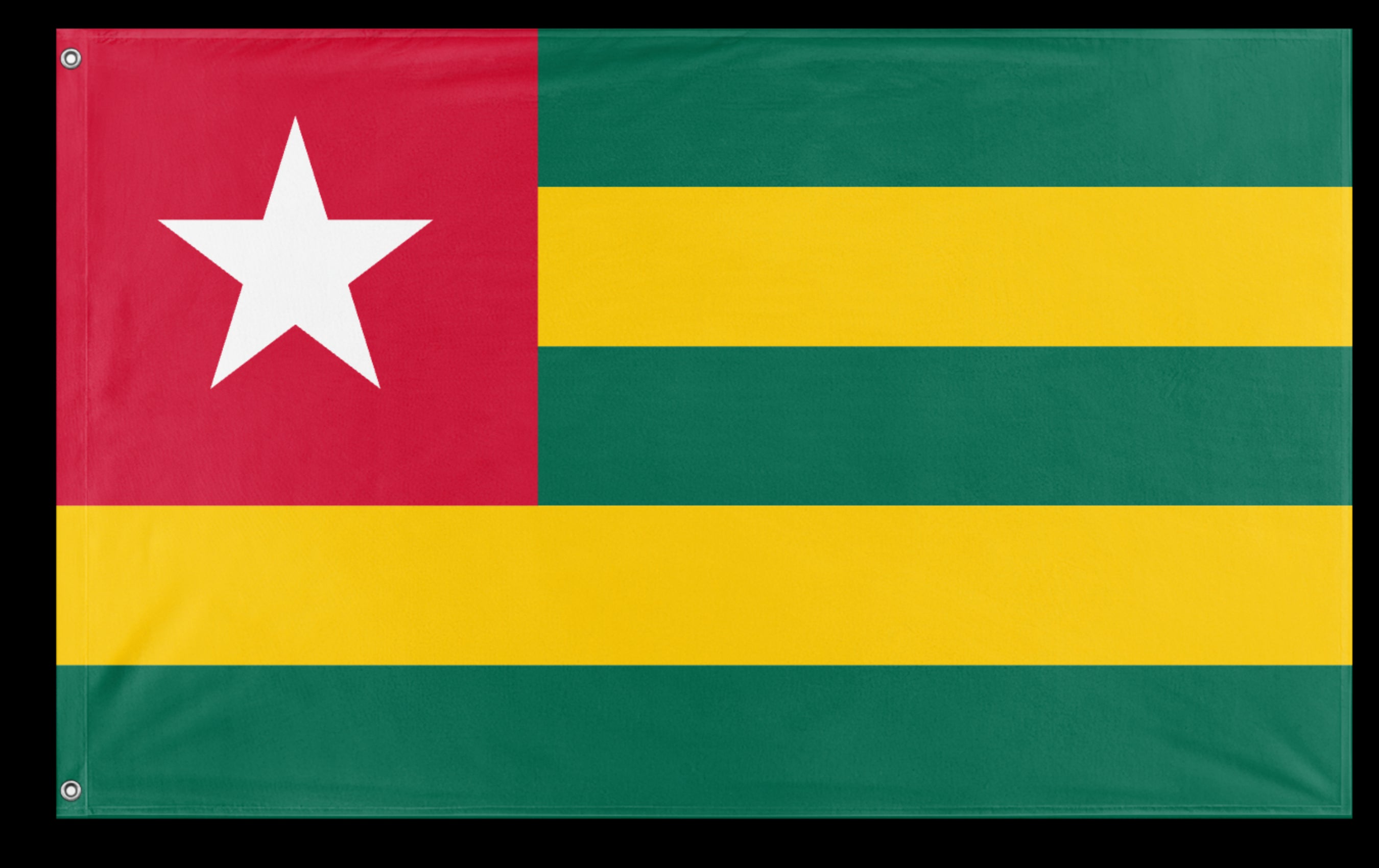 ✒️ The flag of Togo consists of five horizontal stripes alternating green and yellow, with a red square bearing a white five-pointed star in the upper hoist-side corner. Officially adopted on April 27, 1960, the flag’s colors and symbols reflect Pan-African ideals and national identity. The green represents agriculture and hope, the yellow symbolizes natural resources and faith, and the red stands for the blood shed for independence. The white star represents purity, life, and the guiding light for the nation’s progress.