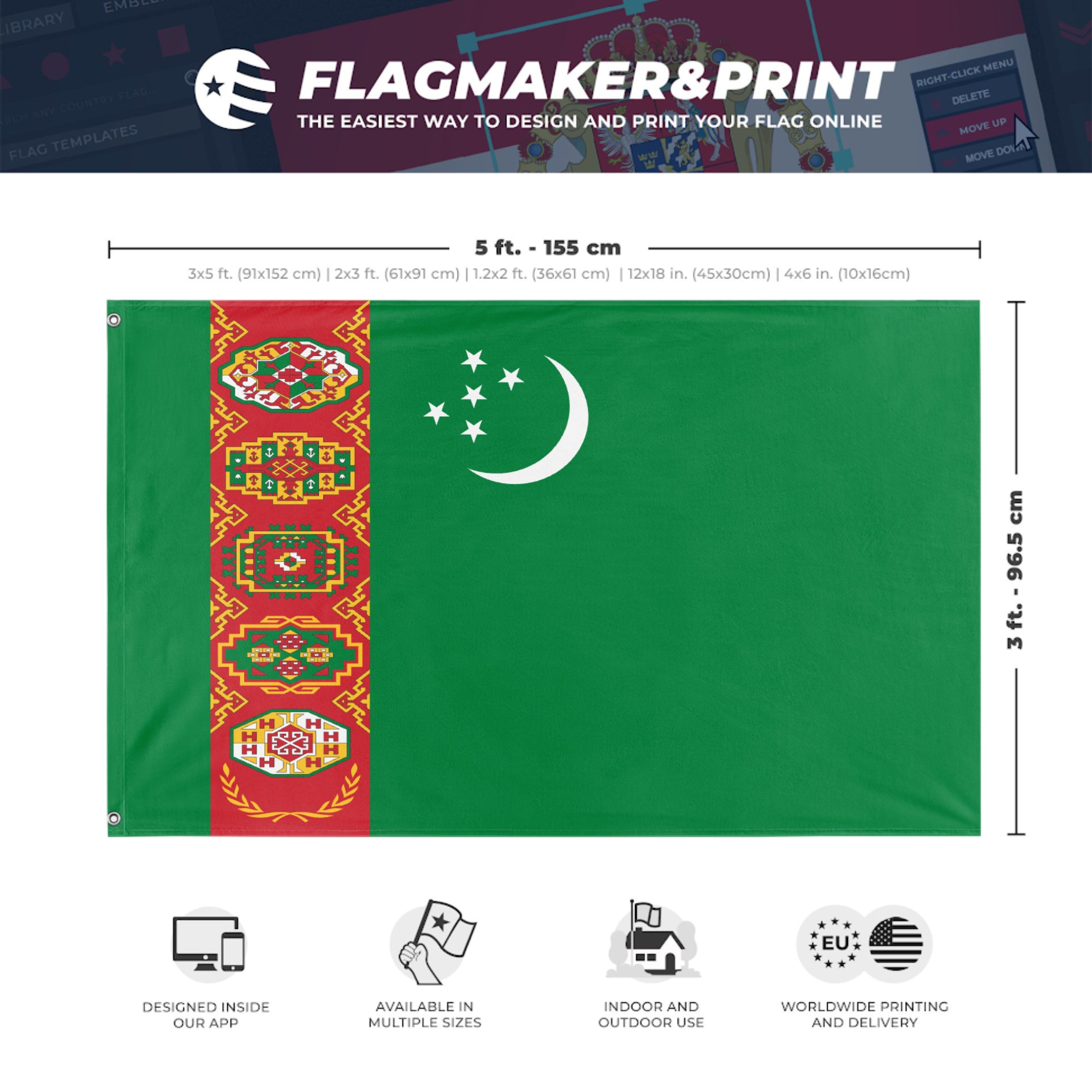 ✒️ The flag of Turkmenistan features a green field with a vertical red stripe near the hoist side, adorned with five traditional carpet guls stacked vertically, and a white waxing crescent moon with five white five-pointed stars to the right of the stripe. Officially adopted on February 19, 1992, the flag’s design reflects the country’s cultural heritage and Islamic faith. The green symbolizes Islam and fertility, the red stripe with carpet motifs represents Turkmenistan’s rich tradition of carpet weaving, while the crescent moon and stars symbolize hope, sovereignty, and the five regions of the country.
