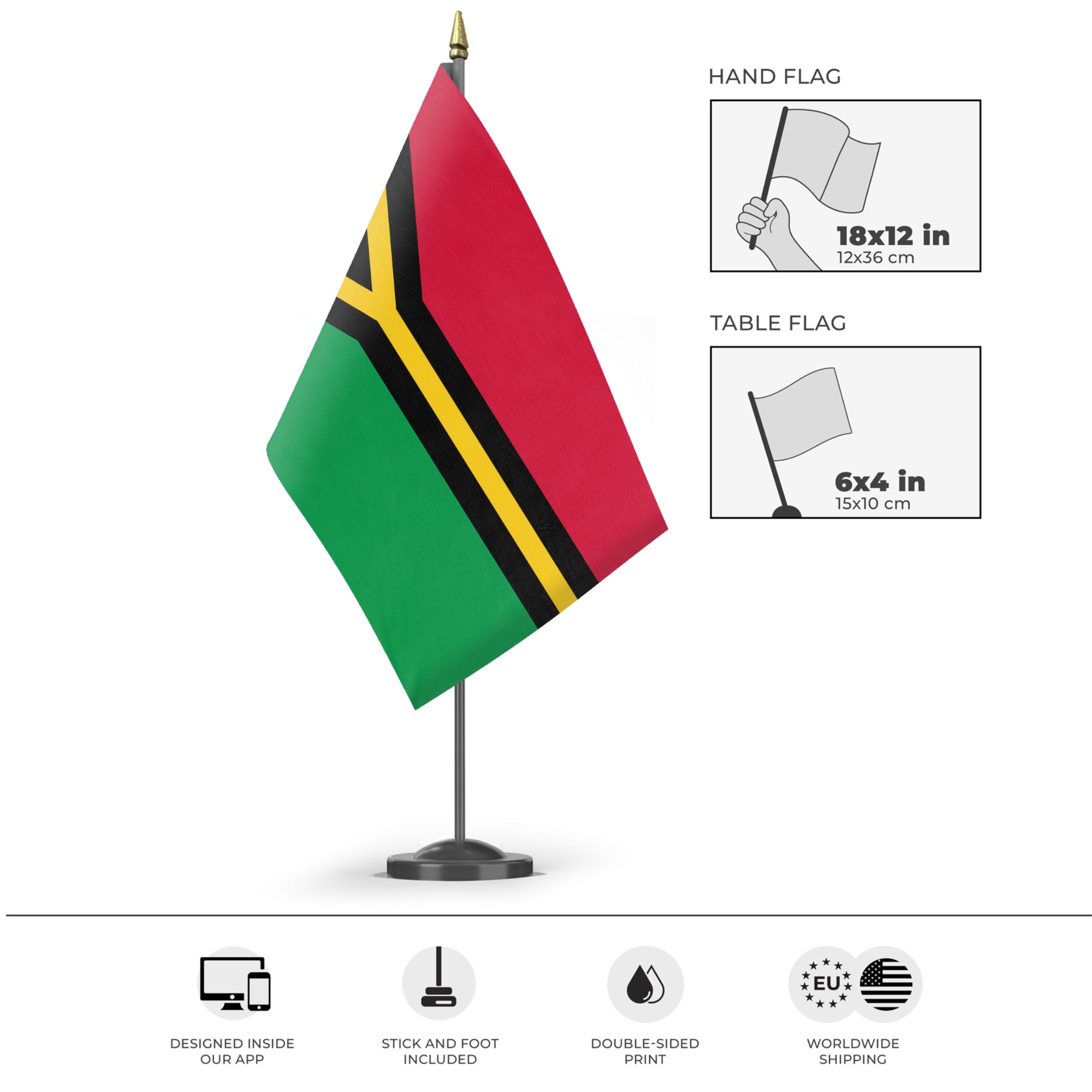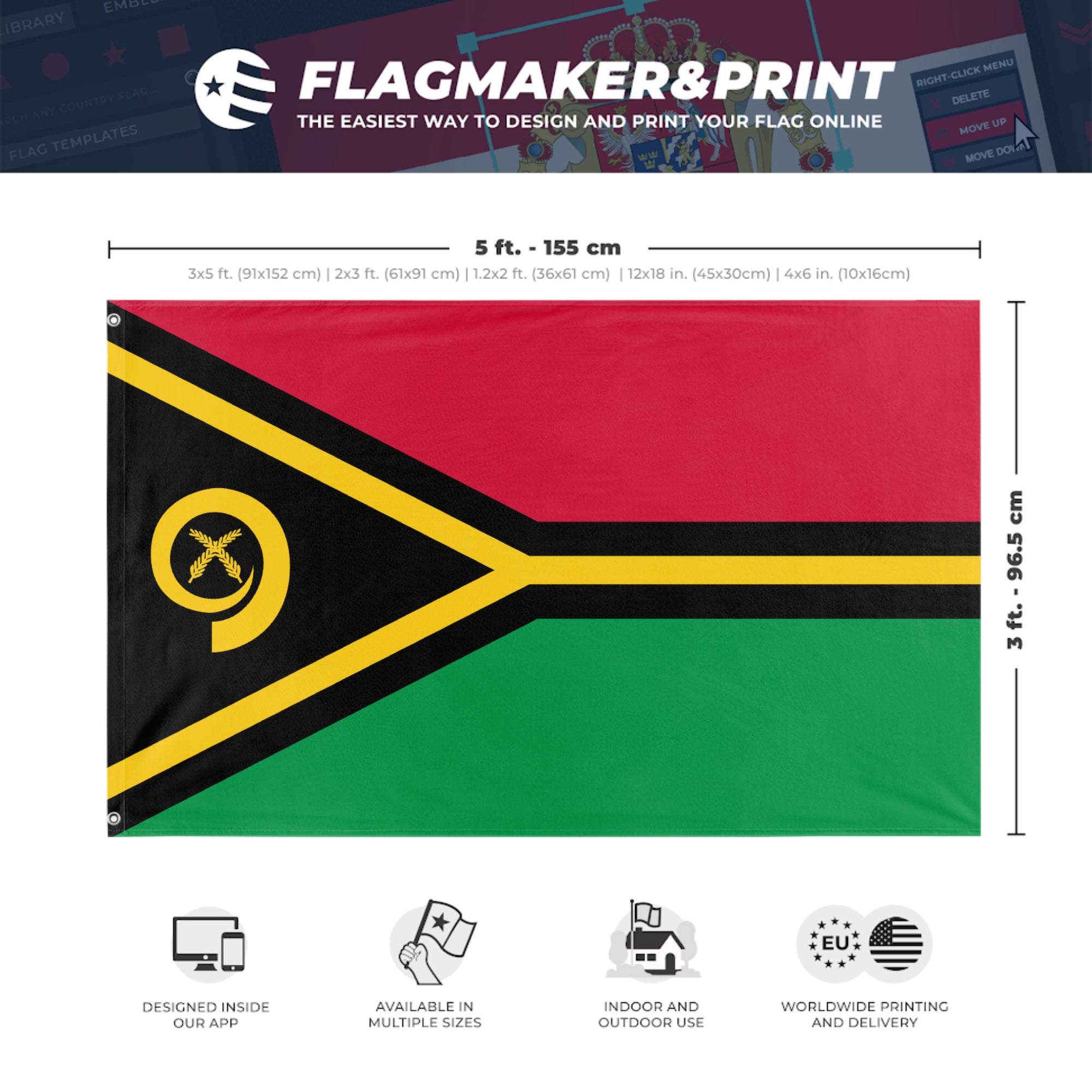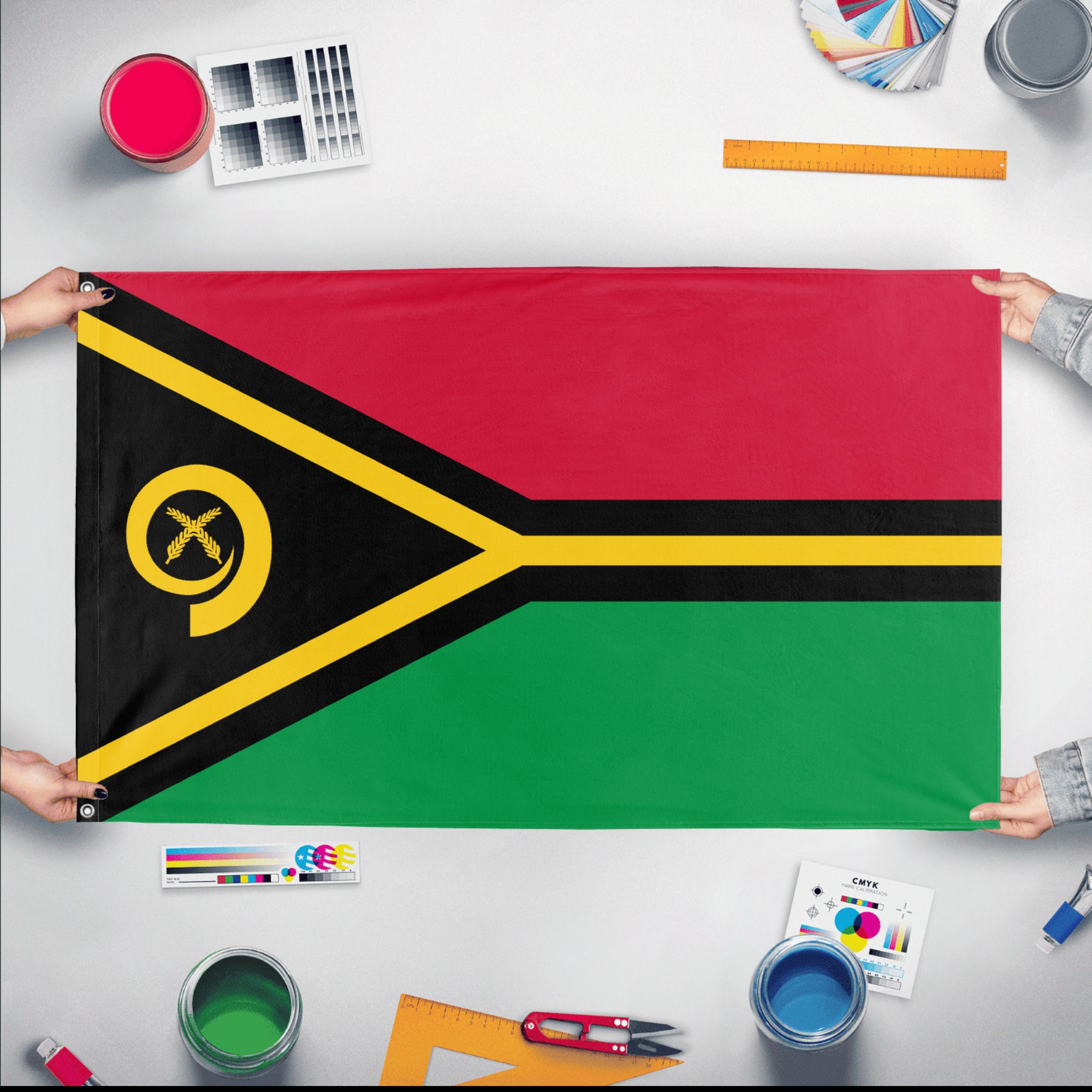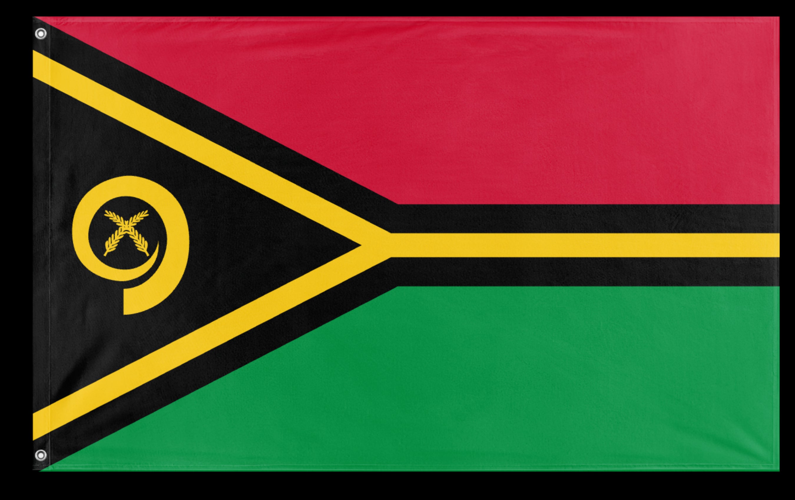 ✒️ The flag of Vanuatu consists of two horizontal bands of red and green divided by a black-edged yellow Y-shape, with a black triangle at the hoist bearing a yellow boar's tusk encircling two crossed namele leaves. Officially adopted on February 18, 1980, upon independence, the flag’s colors and symbols hold significant cultural and national meaning. The red represents the blood of boars and men, symbolizing strength and unity, the green stands for the islands’ rich vegetation, and the black signifies the Melanesian people. The yellow Y-shape reflects the pattern of the islands across the Pacific Ocean, while the boar's tusk and namele leaves are traditional emblems of peace and prosperity.