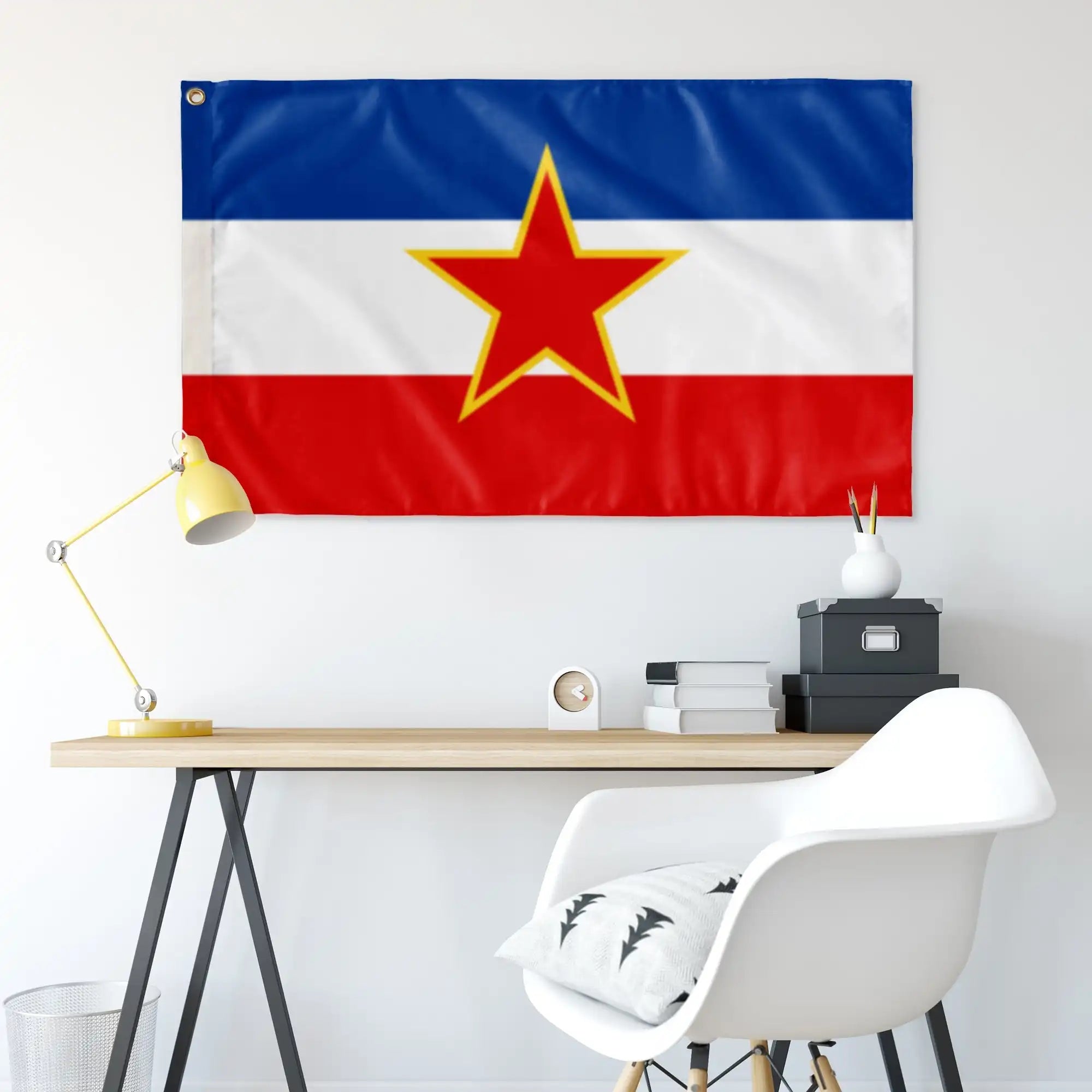 This 36”x60” wall flag is made of 100% polyester knit; equipped with grommets for an authentic look and feel. The flag is a one sided semitransparent print perfect for indoor applications.