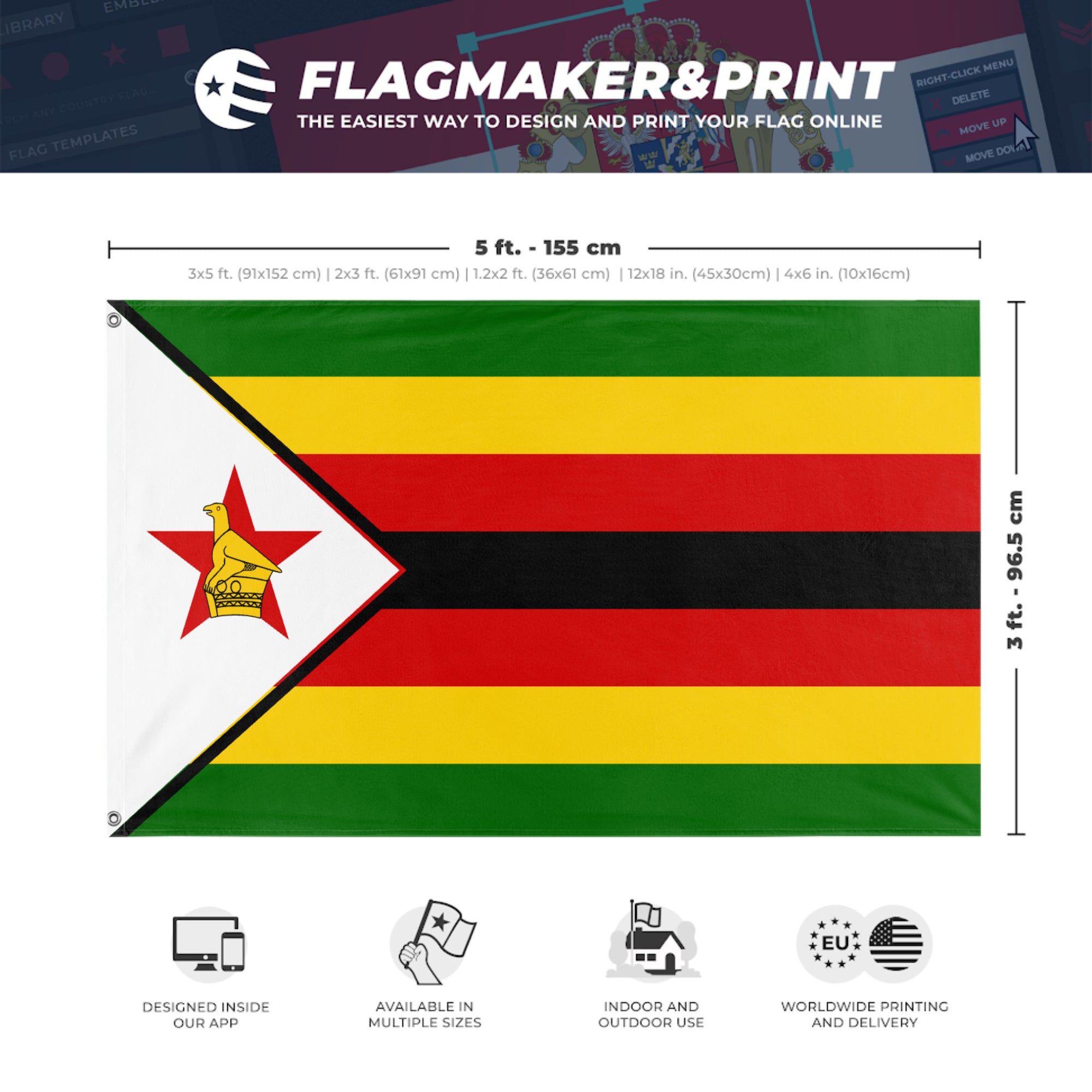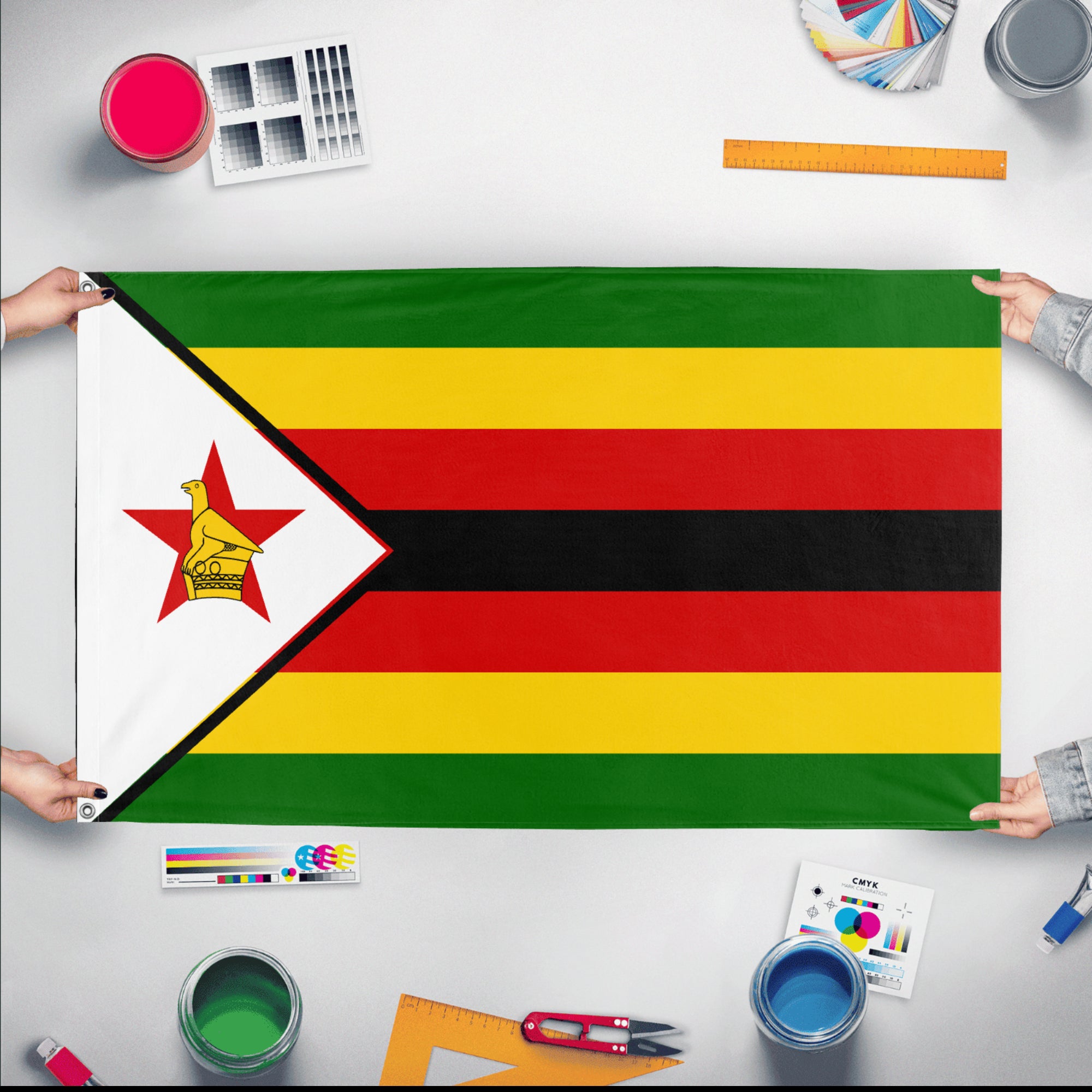 ✒️ The flag of Zimbabwe consists of seven horizontal stripes of green, gold, red, and black with a white triangle on the hoist side, containing a red five-pointed star behind a yellow Zimbabwe Bird. Officially adopted on April 18, 1980, upon independence, the flag’s colors and symbols reflect the country’s history, heritage, and aspirations. Green represents agriculture and rural life, gold symbolizes the nation’s mineral wealth, red stands for the blood shed during the liberation struggle, and black signifies the heritage and ethnicity of the people. The white triangle denotes peace, the red star represents internationalism and the aspirations of the nation, and the Zimbabwe Bird is a national emblem derived from ancient stone carvings at Great Zimbabwe.