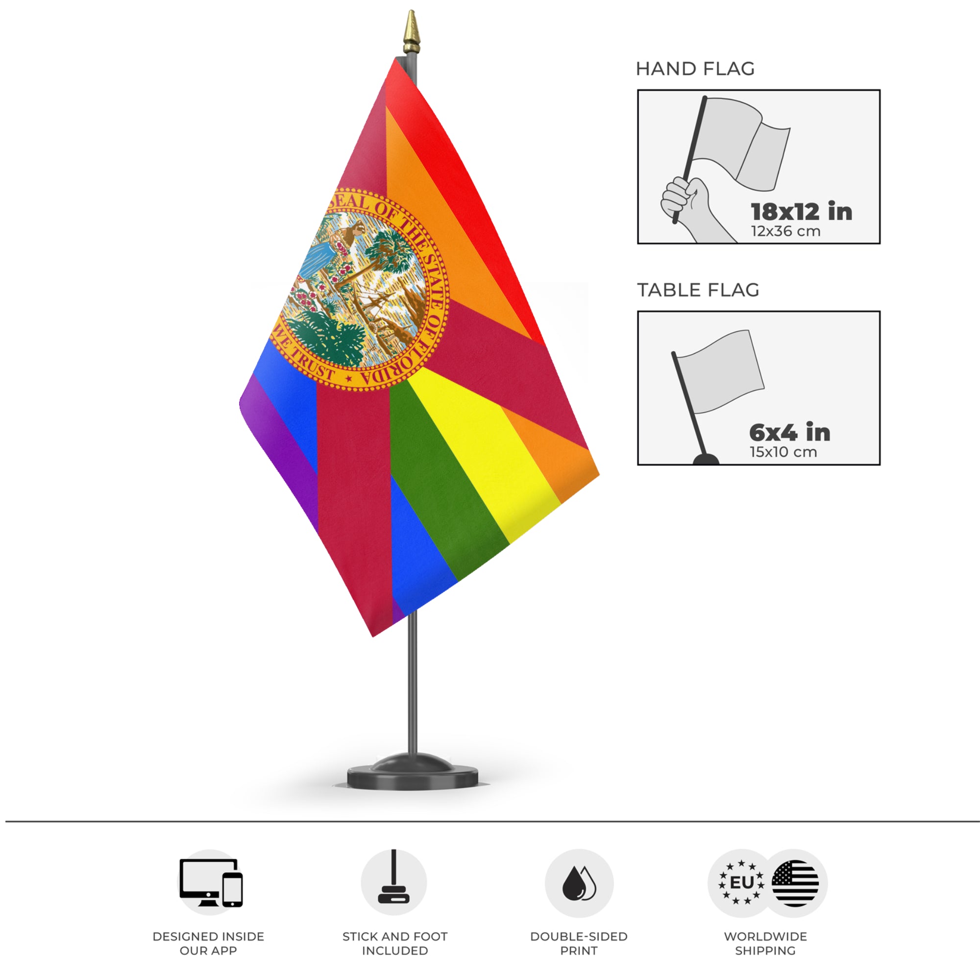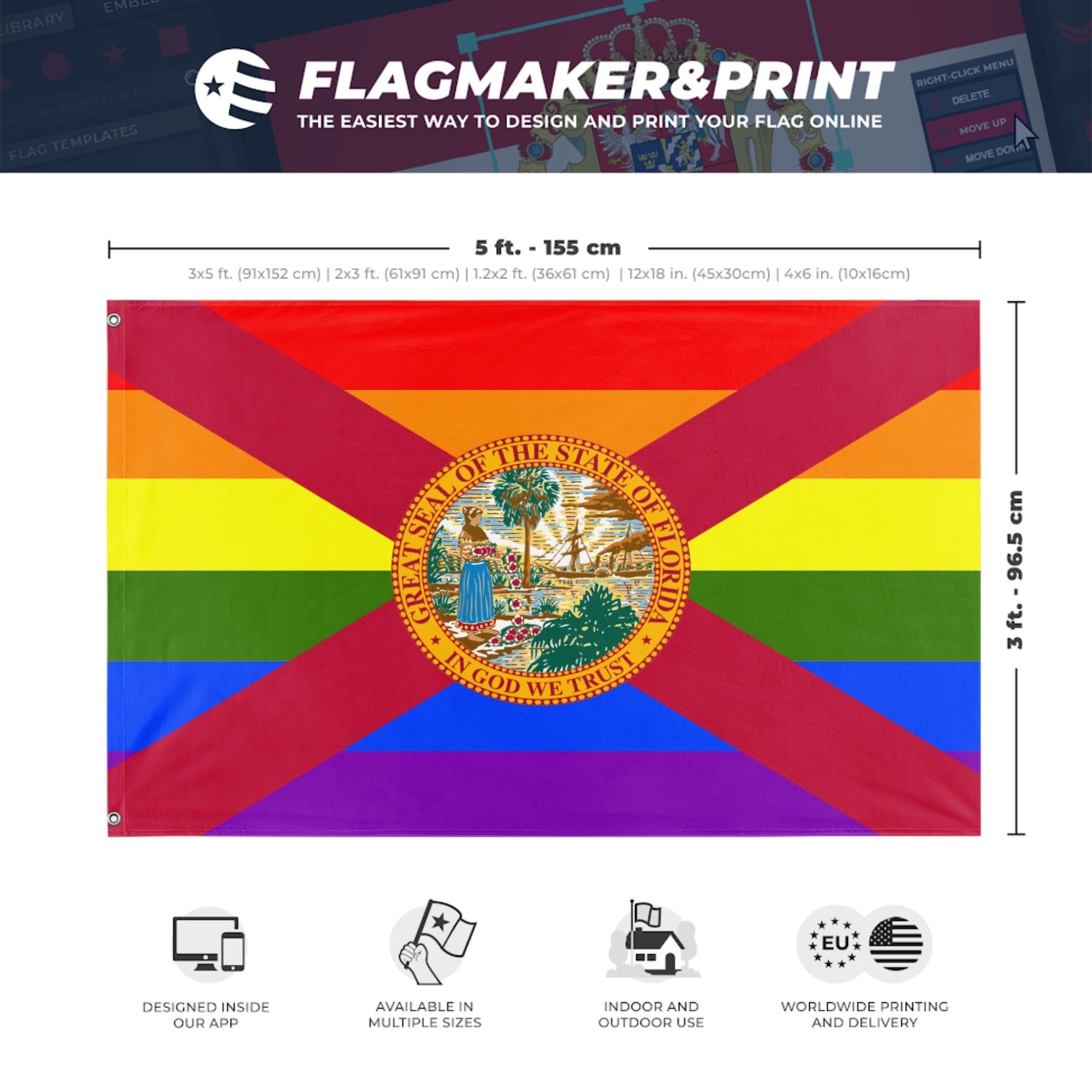 ✒️ The Florida Pride Flag is a regional adaptation of the LGBTQ+ Pride flag that integrates visual elements from Florida’s state flag with the symbolic colors of the rainbow or Progress Pride flag. Commonly featuring the red saltire and elements of the state seal, the flag reflects both the cultural identity of Florida and its diverse, resilient LGBTQ+ communities. Used in pride parades, advocacy campaigns, and public events, the Florida Pride Flag represents a commitment to equality, visibility, and inclusion in a state marked by both vibrant LGBTQ+ activism and ongoing social challenges.