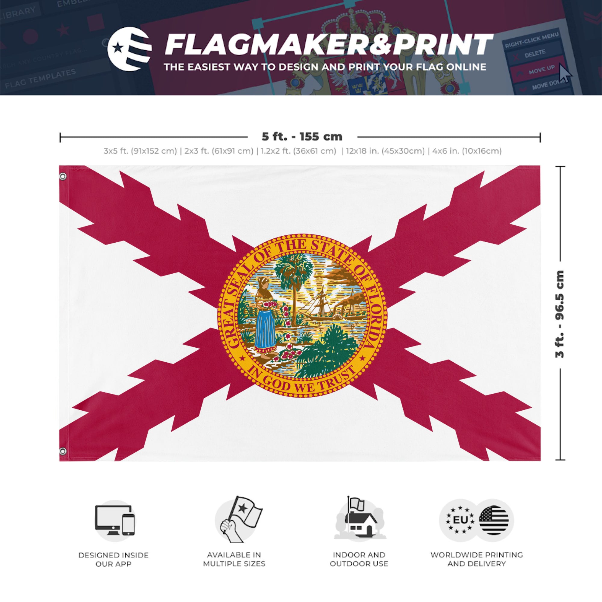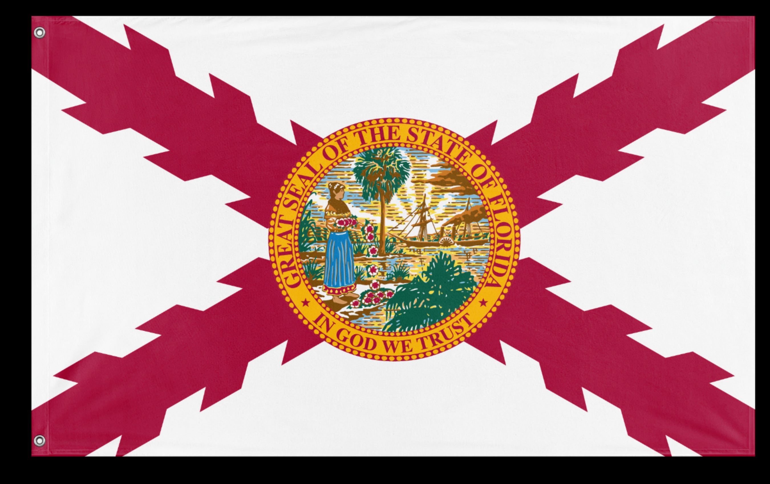✒️ The Florida State Flag – Spanish Florida design features the Great Seal of the State of Florida centered upon a crimson saltire inspired by the historical Cross of Burgundy, long associated with Spanish colonial rule. The red saltire appears in a jagged, serrated form, echoing early Spanish military banners used throughout the Americas. Behind the seal’s depiction of a Seminole woman, sabal palms, and a coastal sunrise, the white field preserves continuity with the modern Florida state flag while emphasizing the colonial-era symbolism of Spain’s presence in the region.