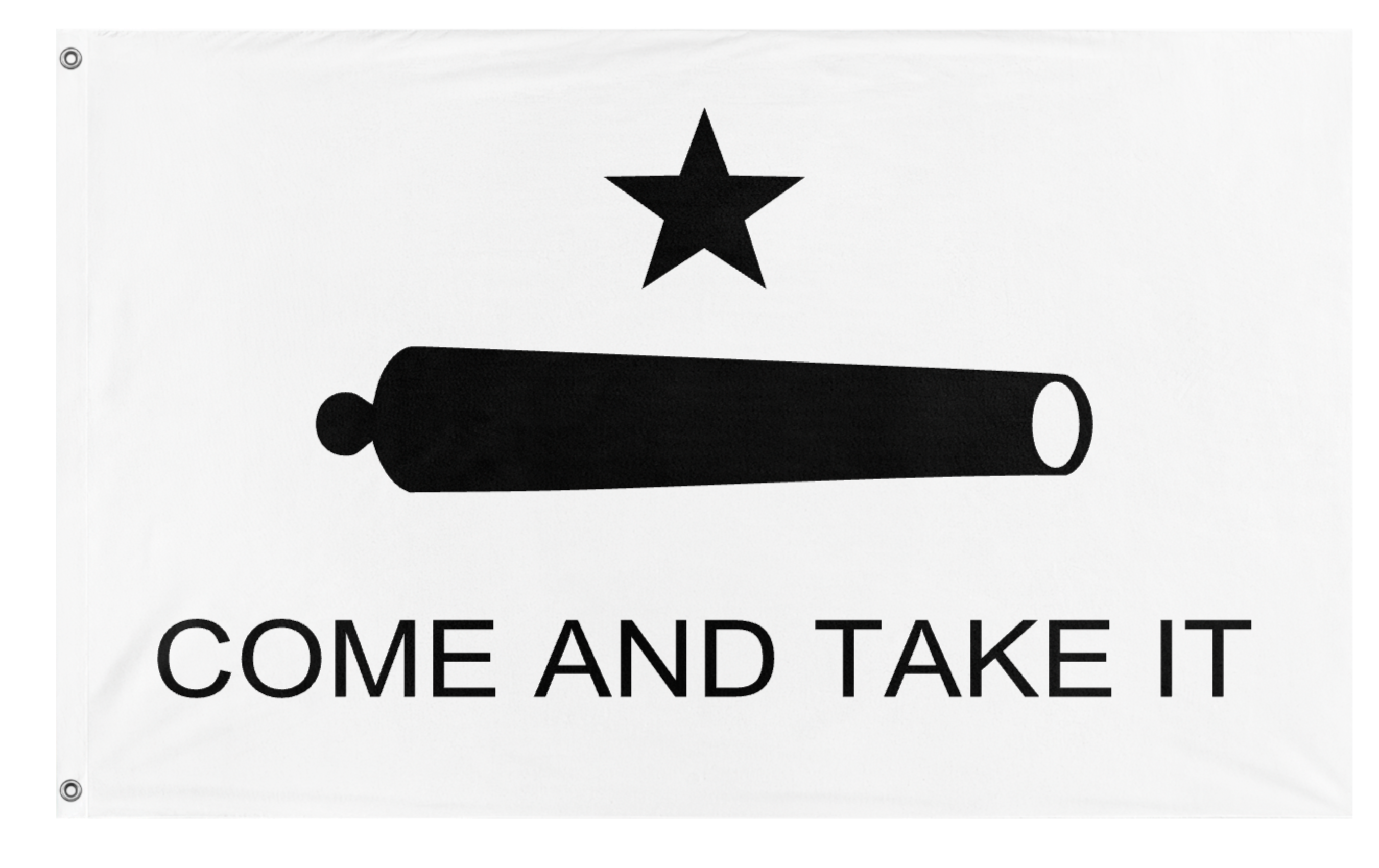 ✒️ The Gonzales "Come and Take It" flag is a historic symbol of Texan defiance during the early stages of the Texas Revolution. First flown in October 1835 at the Battle of Gonzales, the flag features a black cannon centered on a white field with a lone star above and the bold phrase "Come and Take It" beneath. It was created by Texian settlers in response to Mexican authorities' demand to return a small cannon previously given for defense against Native American raids. The flag has since become an enduring emblem of resistance, independence, and the spirit of the Texas Revolution.