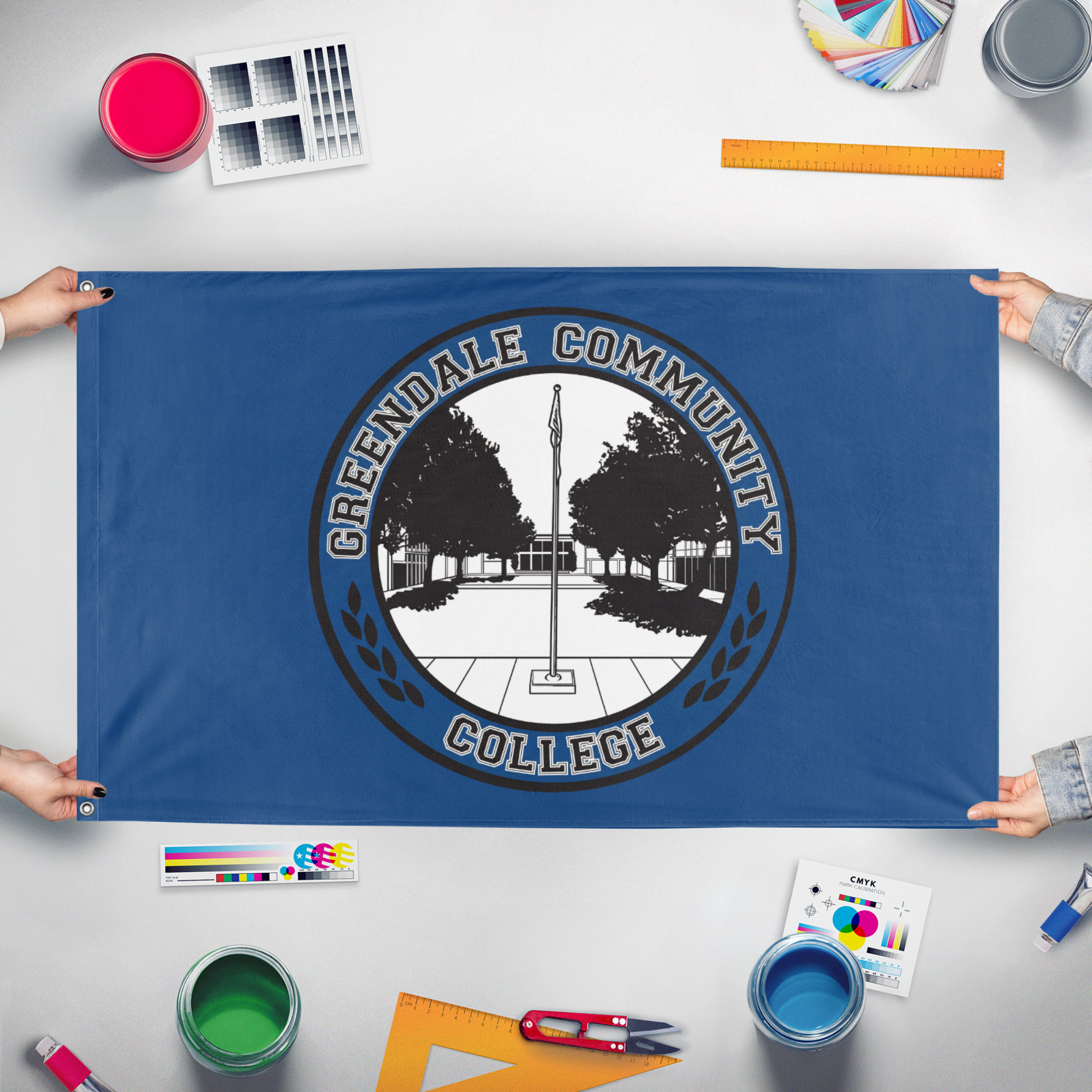 The Greendale Community College flag is a fictional institutional banner featured in the NBC sitcom Community (2009–2015), created by Dan Harmon and starring Joel McHale, Gillian Jacobs, Danny Pudi, Alison Brie, Yvette Nicole Brown, Donald Glover, Chevy Chase, and Ken Jeong. The flag displays a medium blue field charged with a circular academic seal bearing the words “GREENDALE COMMUNITY COLLEGE.” Within the seal is a stylized black-and-white illustration of the Greendale campus quad, framed by symmetrical trees and centered on a flagpole, symbolizing traditional collegiate imagery and civic pride. Laurel branches flank the lower portion of the seal, reinforcing the academic heraldry motif. The design reflects a conventional American community college emblem, employing a sober palette and institutional typography to evoke legitimacy and tradition.