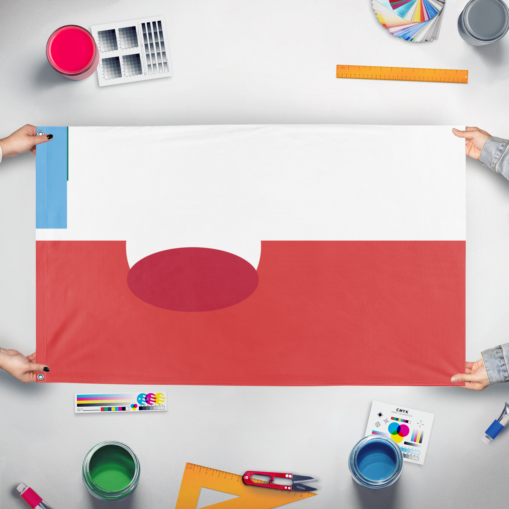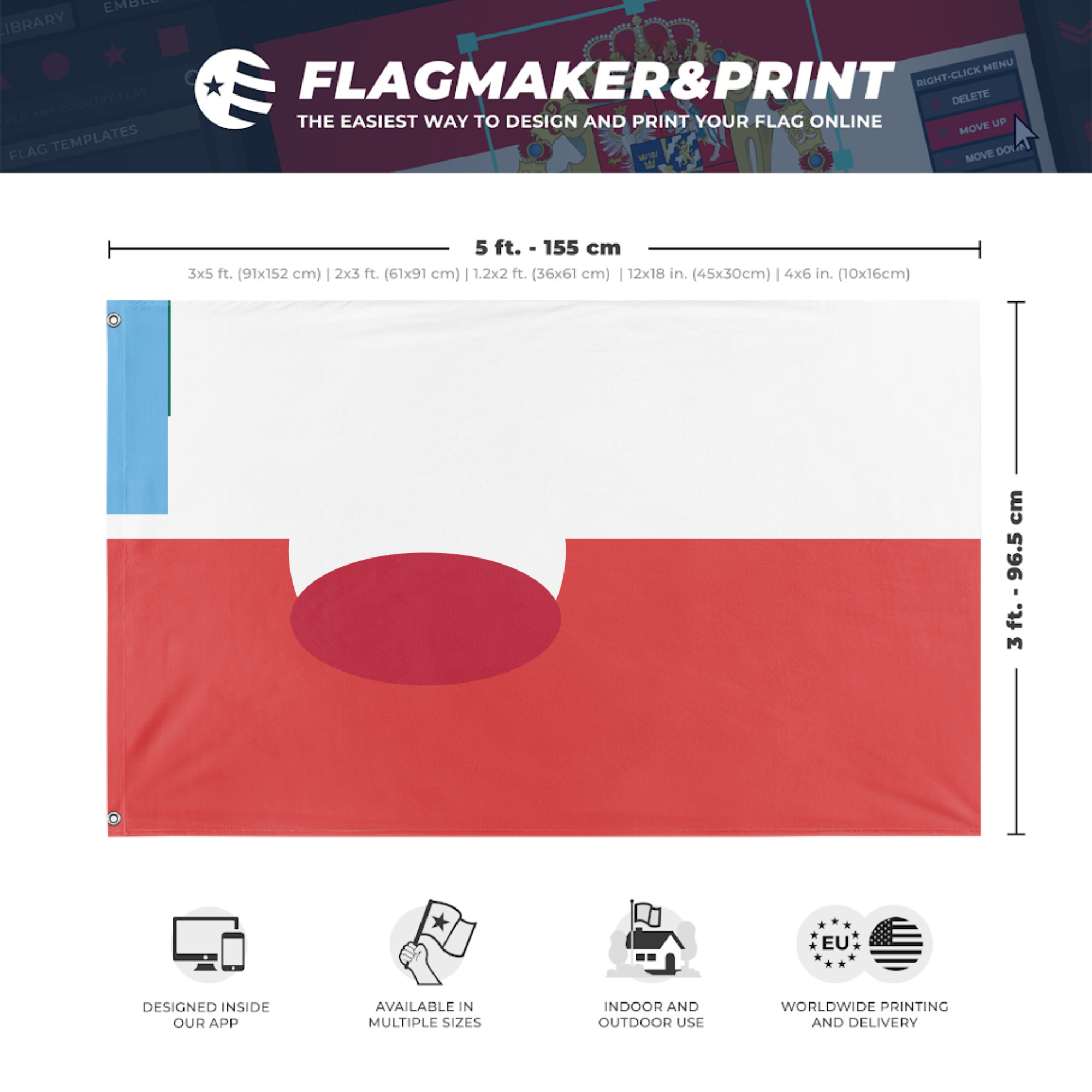 Our integrated flag maker app allows anyone to design and print their own flag. After finishing your design, you can print your flag in three easy steps.