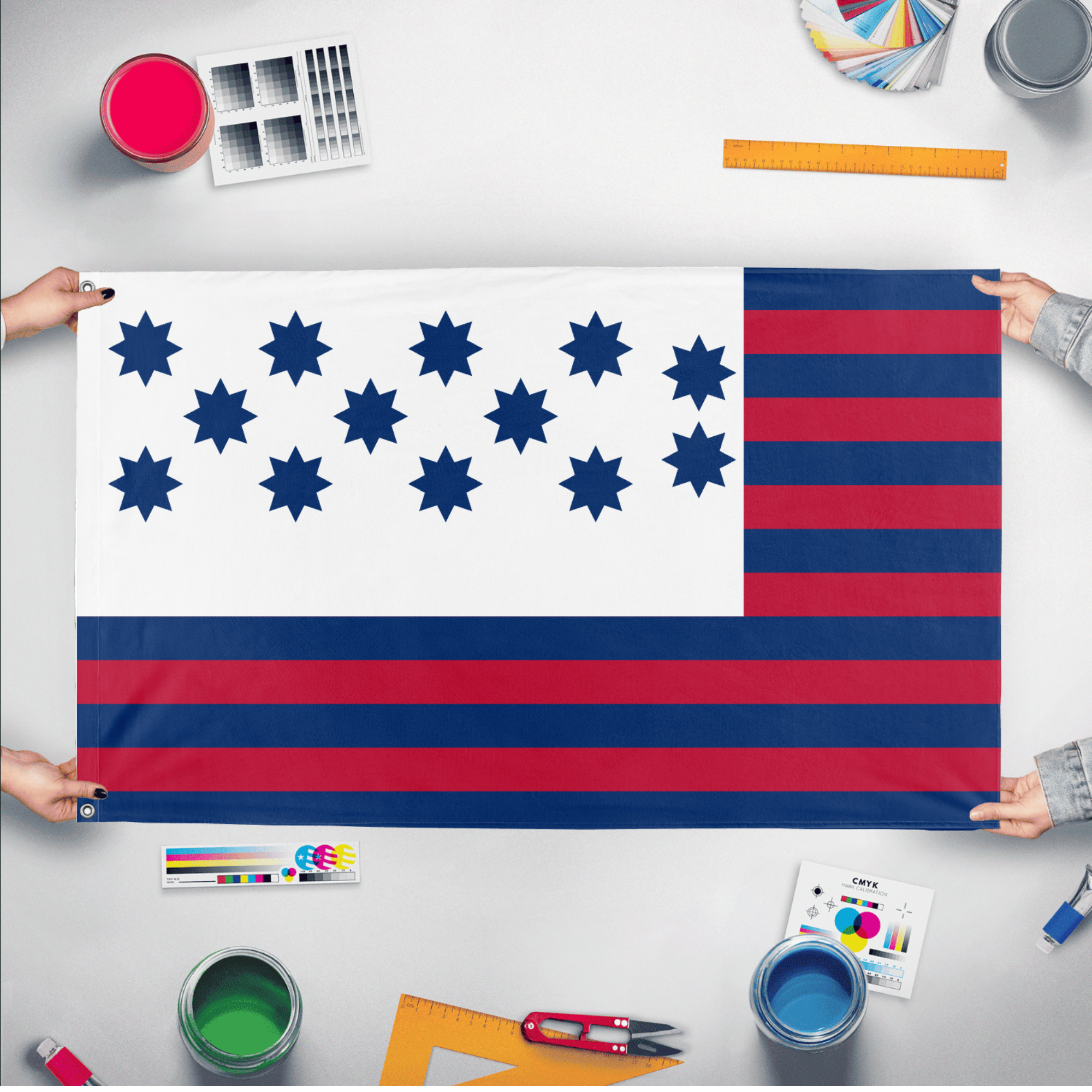Our integrated flag maker app allows anyone to design and print their own flag. After finishing your design, you can print your flag in three easy steps.