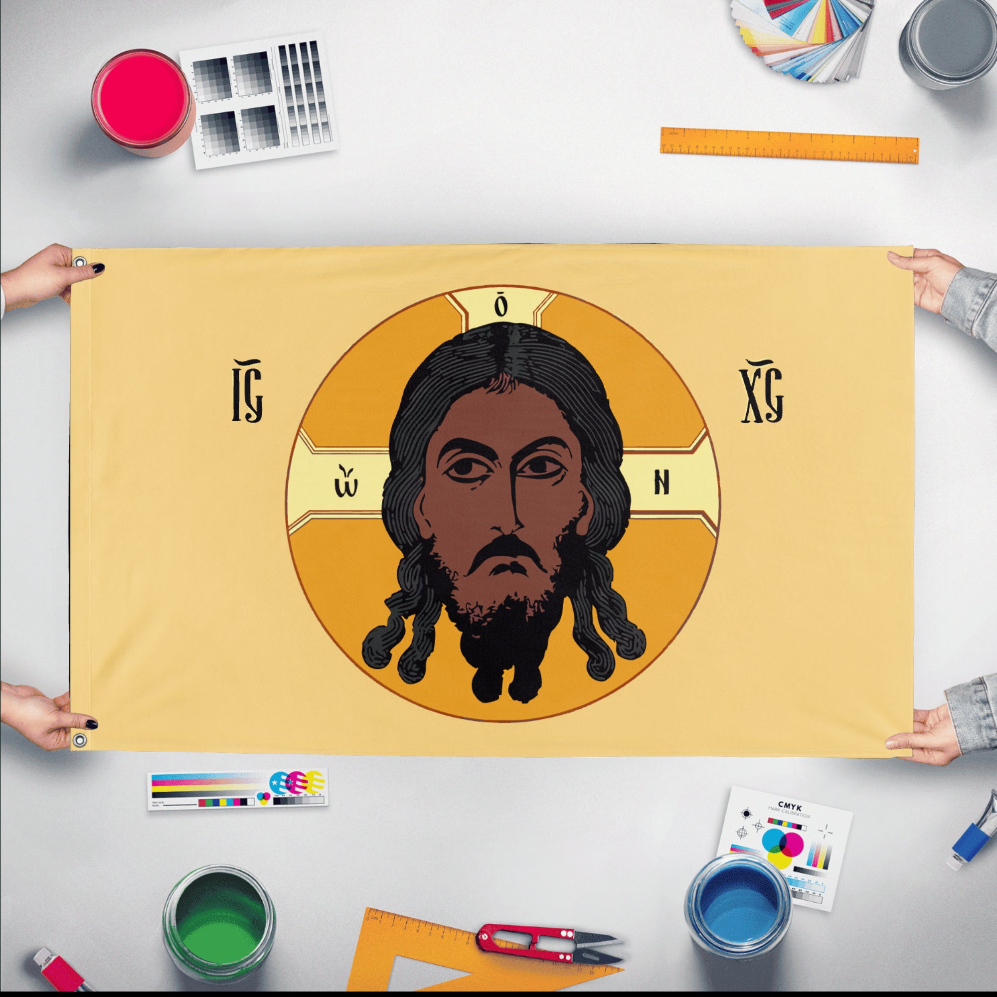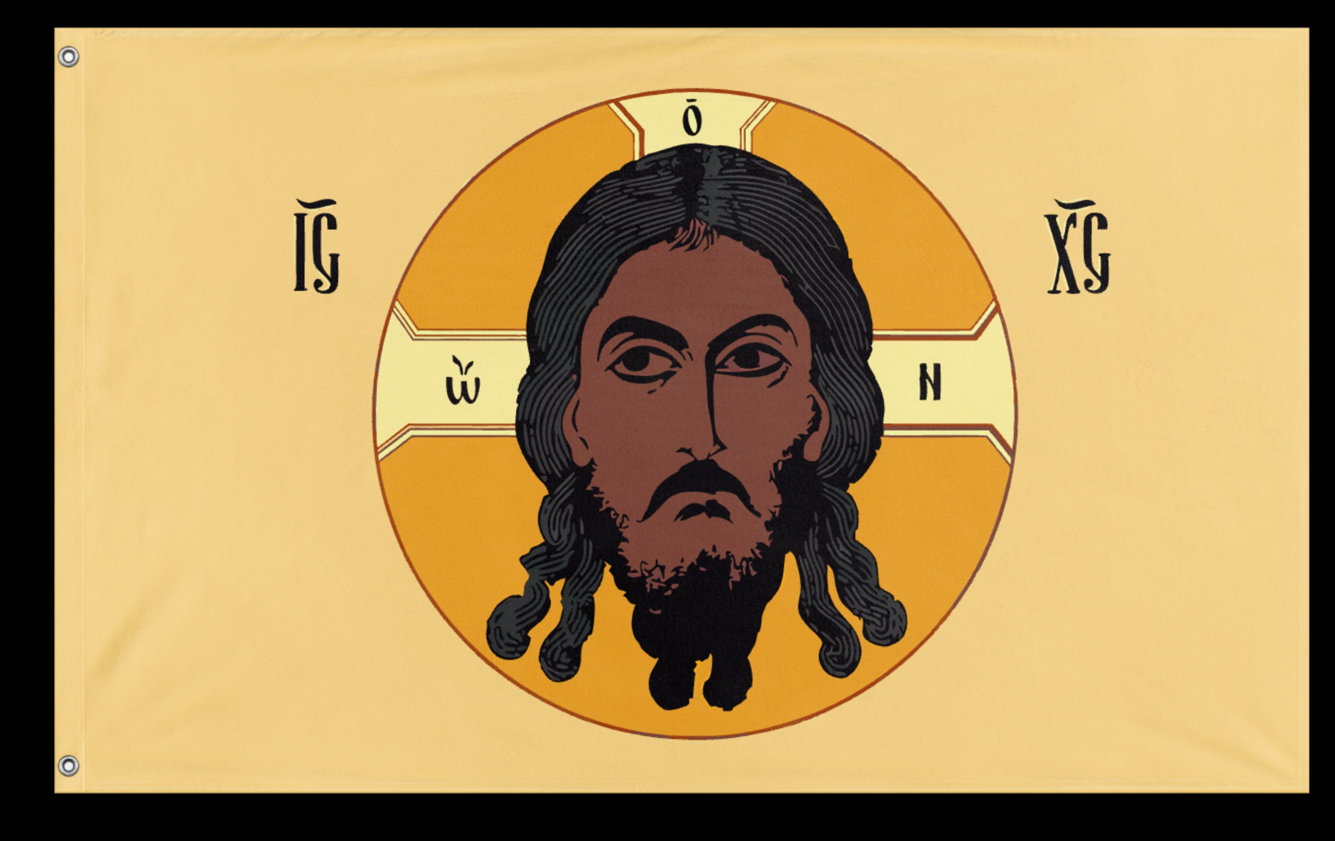 ✒️ The Holy Face of Christ Flag – Yellow is a Christian devotional banner that features the image of the Holy Face of Jesus Christ, typically inspired by traditional depictions such as the Veil of Veronica or the Shroud of Turin, set against a yellow or gold background. The yellow color symbolizes divinity, light, and the glory of the Resurrection, highlighting Christ’s divine nature and victorious triumph over death. This flag is often displayed in churches, homes, or religious events as a symbol of veneration, hope, and spiritual illumination, serving as a visual reminder of Christ’s presence and the promise of eternal life.