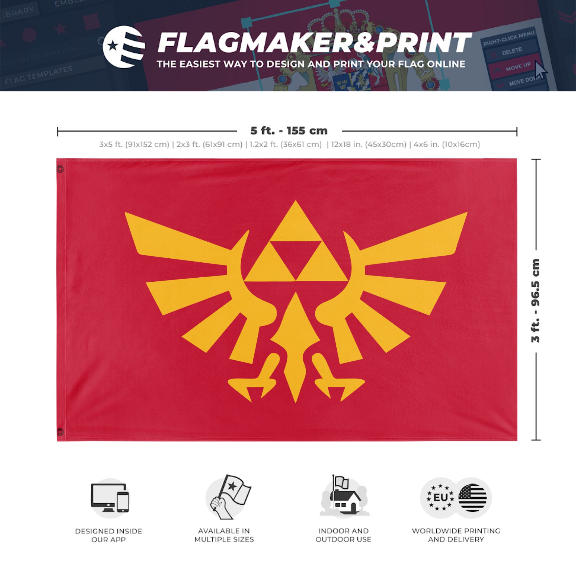 ✒️ This flag is a reproduction of the Royal Crest of Hyrule, a fictional emblem representing the kingdom of Hyrule in Nintendo's popular The Legend of Zelda video game series. The crest is a prominent symbol within the franchise, often seen on banners, shields, and various royal artifacts throughout the games. This flag features a golden Triforce, a sacred relic of immense power, positioned above a stylized Loftwing, a majestic bird-like creature. This design is set against a solid red field, a common color scheme associated with the royal family of Hyrule. The symbol's design elements are deeply rooted in the lore of the series, with the Triforce representing the virtues of Power, Wisdom, and Courage, and the Loftwing being a key figure in the history of the kingdom. The Royal Crest of Hyrule is one of the most recognizable icons in video game culture, synonymous with the adventures of the hero Link and Princess Zelda. Its widespread use in the games, from Ocarina of Time to Tears of the Kingdom, has solidified its status as a core part of the franchise's identity. The emblem has been adopted by fans worldwide, appearing on merchandise, fan art, and cosplay items. While not a real-world national flag, its cultural significance within the gaming community is substantial, representing the rich lore, epic quests, and memorable characters of the Zelda universe. It serves as a powerful symbol of the series' enduring legacy and its impact on the gaming industry.