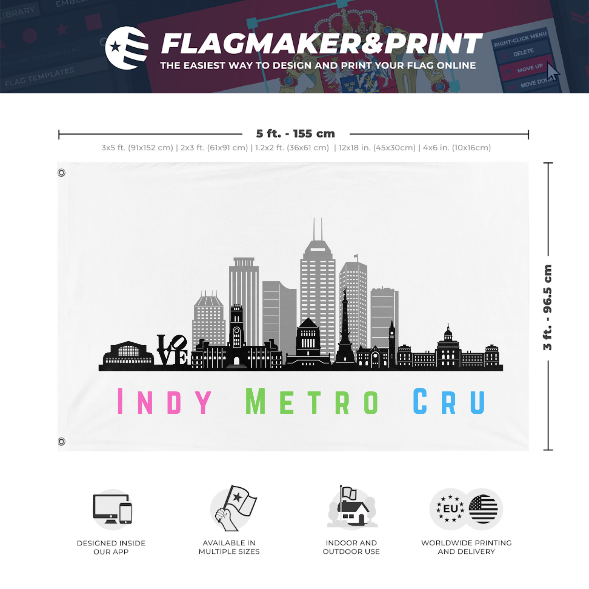 Our integrated flag maker app allows anyone to design and print their own flag. After finishing your design, you can print your flag in three easy steps.