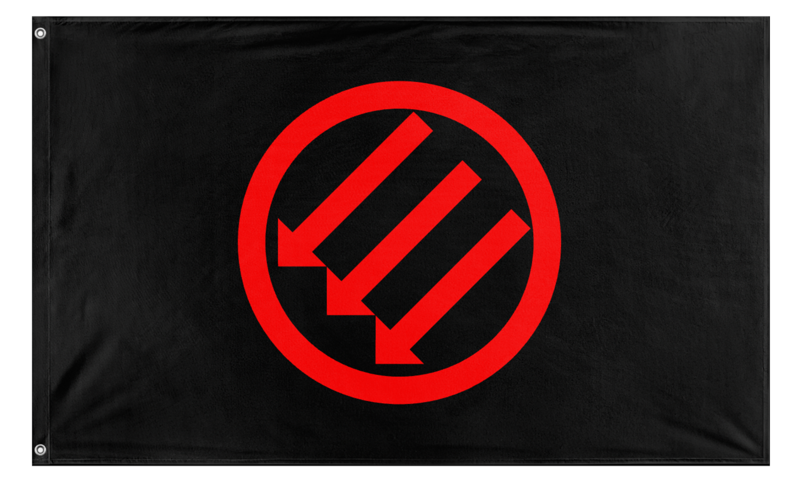 The Iron Front Red on Black Flag is a modern rendering of the historic Iron Front emblem, featuring three red arrows enclosed within a red circular ring set against a solid black field. The design originates from the Eiserne Front (Iron Front), a German anti-fascist organization founded in 1931 during the final years of the Weimar Republic. The three arrows symbolized opposition to three perceived threats to democratic socialism at the time: fascism, monarchism, and communism aligned with Stalinism. The stark red-on-black composition draws from the broader visual tradition of European left-wing political symbolism, emphasizing militancy, solidarity, and resistance.