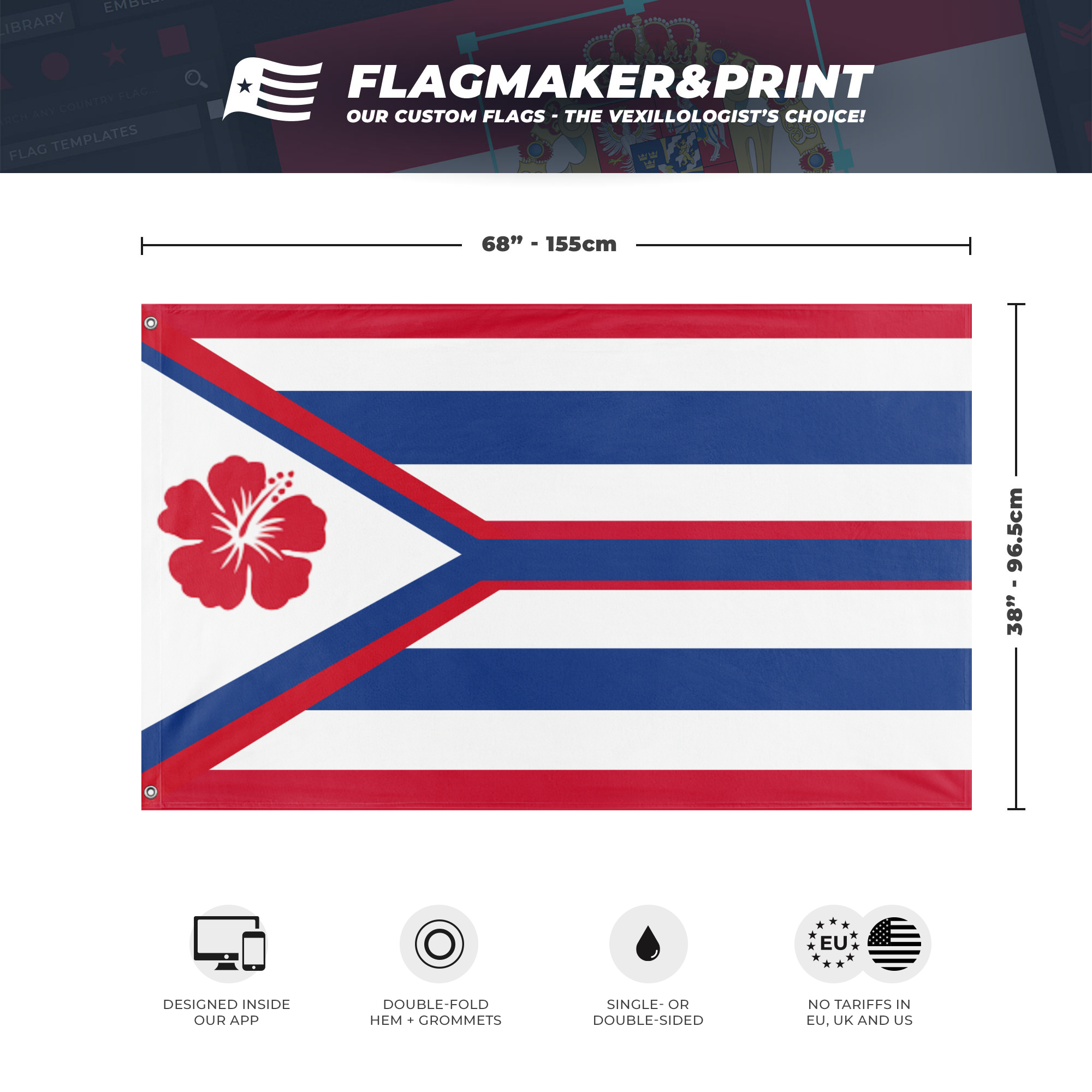 Our integrated flag maker app allows anyone to design and print their own flag. After finishing your design, you can print your flag in three easy steps.