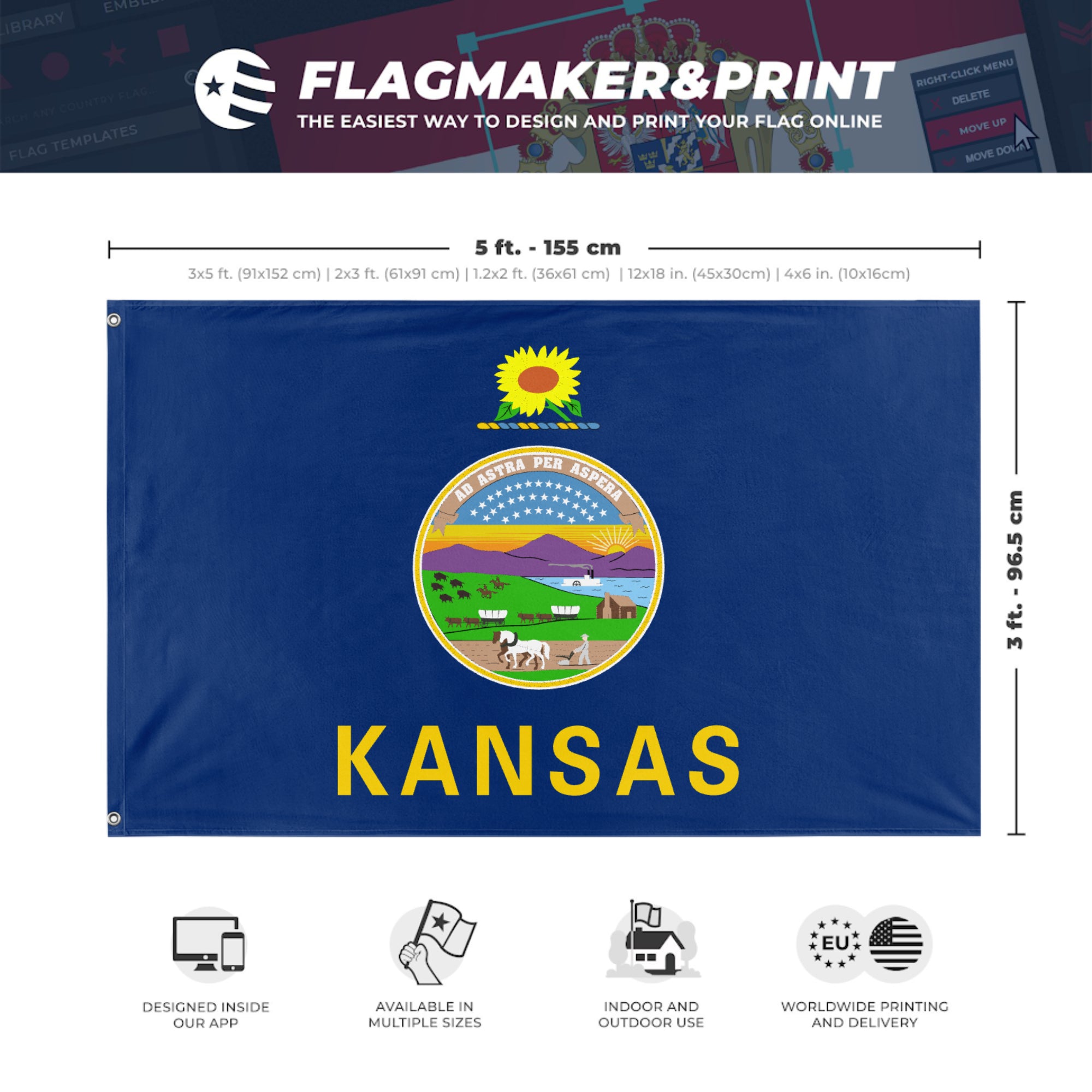 Our integrated flag maker app allows anyone to design and print their own flag. After finishing your design, you can print your flag in three easy steps.