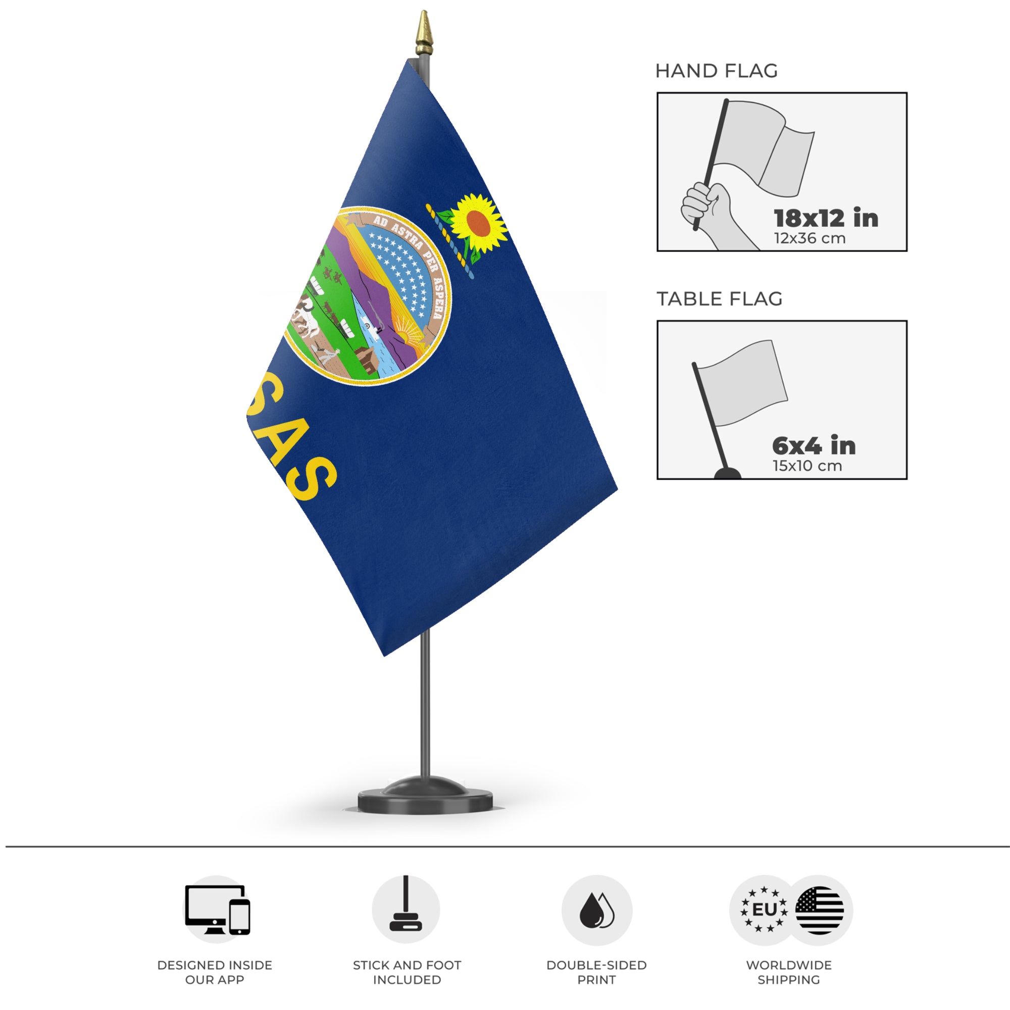 ✒️ The state flag of Kansas features a dark blue field with the state seal prominently displayed in the center. Above the seal is a sunflower, the state flower, symbolizing Kansas’s identity and natural beauty. The seal itself depicts a landscape with a rising sun, a river and steamboat, a settler’s cabin and wagon train, and Native Americans hunting bison, representing Kansas’s history, progress, and pioneer spirit. Below the seal is the word "Kansas" in gold letters. Officially adopted in 1927, the flag reflects the state’s rich heritage and the diversity of its natural and cultural resources.