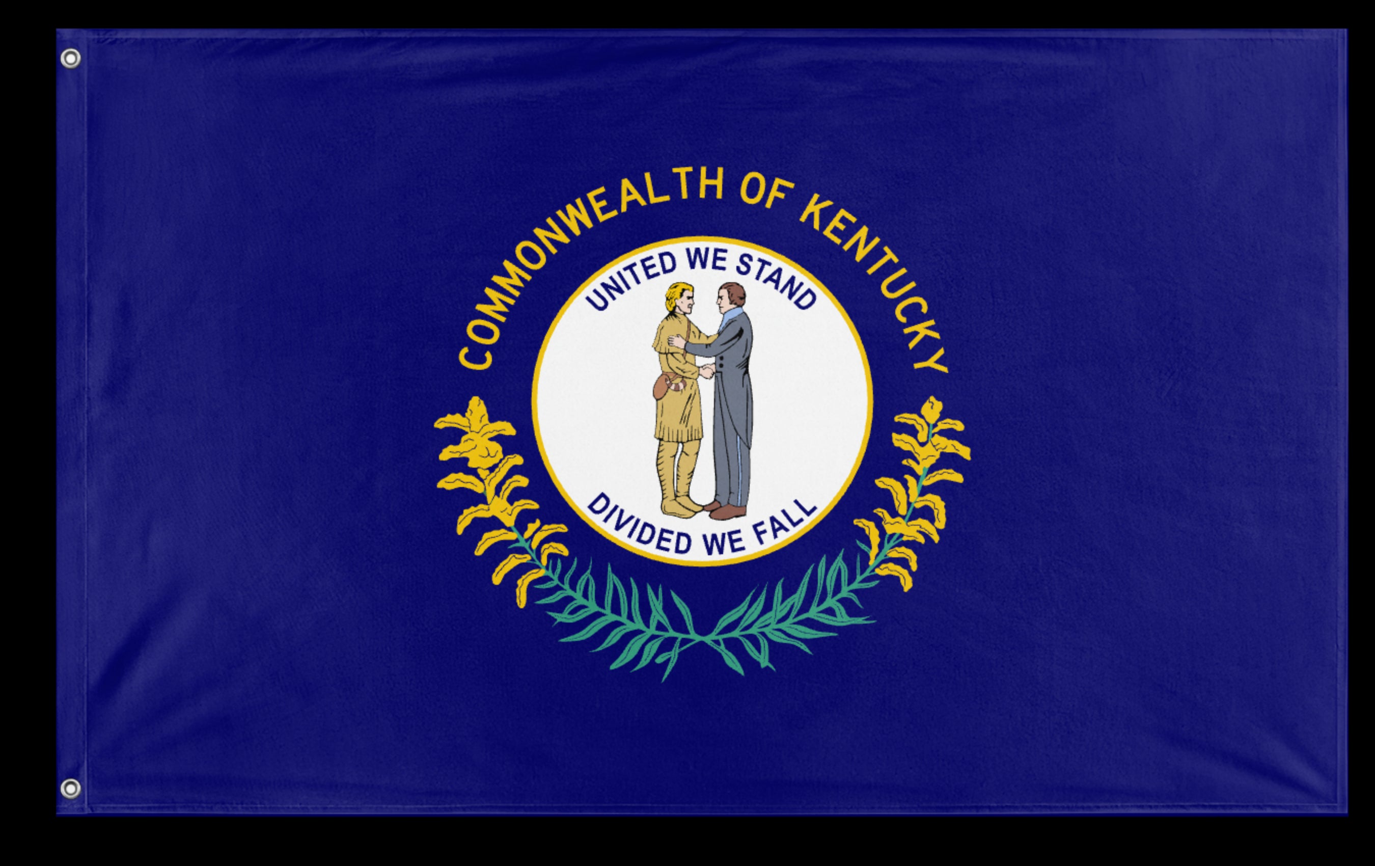✒️ The state flag of Kentucky features a deep blue field with the state seal centered, surrounded by the words "Commonwealth of Kentucky." The seal depicts two men—one dressed as a pioneer and the other as a statesman—embracing in a symbol of unity. Beneath them is the state motto, "United We Stand, Divided We Fall," reflecting Kentucky’s values of solidarity and cooperation. The flag’s design emphasizes the importance of friendship and unity among Kentuckians. Officially adopted in 1918, the flag highlights the state’s commitment to mutual support and shared strength.