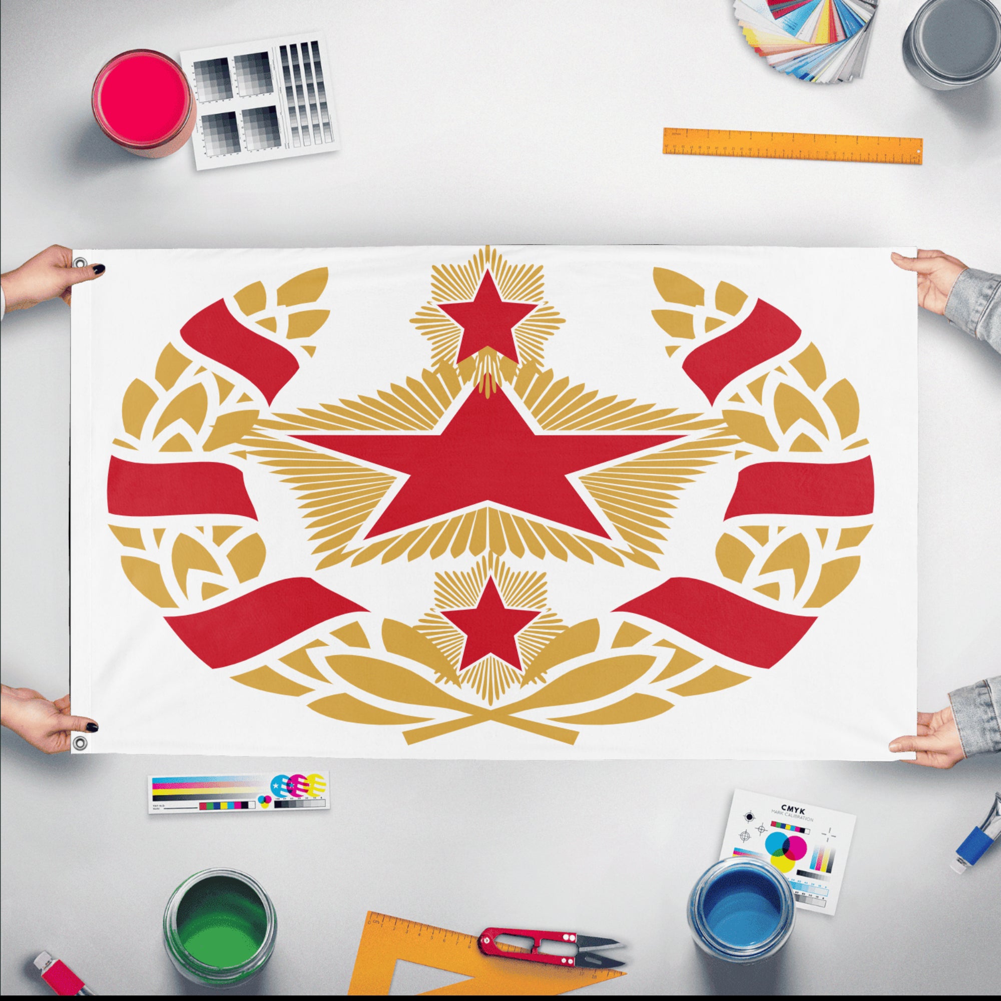 Our integrated flag maker app allows anyone to design and print their own flag. After finishing your design, you can print your flag in three easy steps.