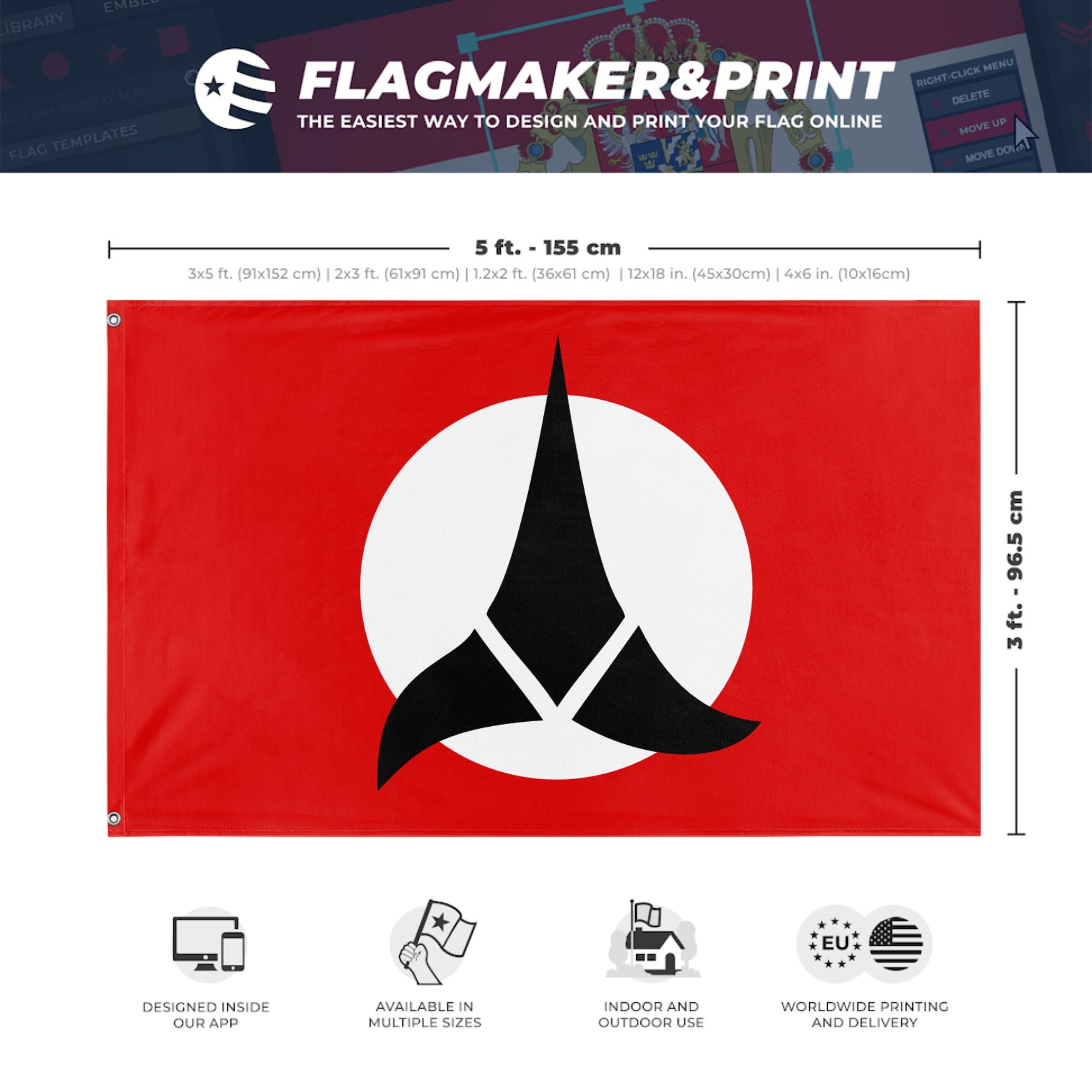 ✒️ The flag of the Klingon Empire is one of the most recognizable symbols in the Star Trek franchise, featuring a bold red field with a central white disc and the iconic black trefoil insignia. This emblem, often referred to simply as the Klingon symbol, represents the unified power of the Empire’s three great houses and is widely used across Klingon military, governmental, and ceremonial contexts. Its stark color palette – red for honor and battle, white for unity, and black for strength – reinforces the warrior culture central to Klingon identity. Introduced in Star Trek: The Motion Picture (1979) and refined throughout later series, the Klingon flag has become a defining icon of science-fiction heraldry. Its design reflects the Empire’s emphasis on martial prowess, ancestral lineage, and collective duty. Today, the Klingon Empire flag is frequently used by fans, costuming groups, and in officially licensed merchandise, making it a staple of Star Trek memorabilia, sci-fi flags, and fictional empire symbolism.