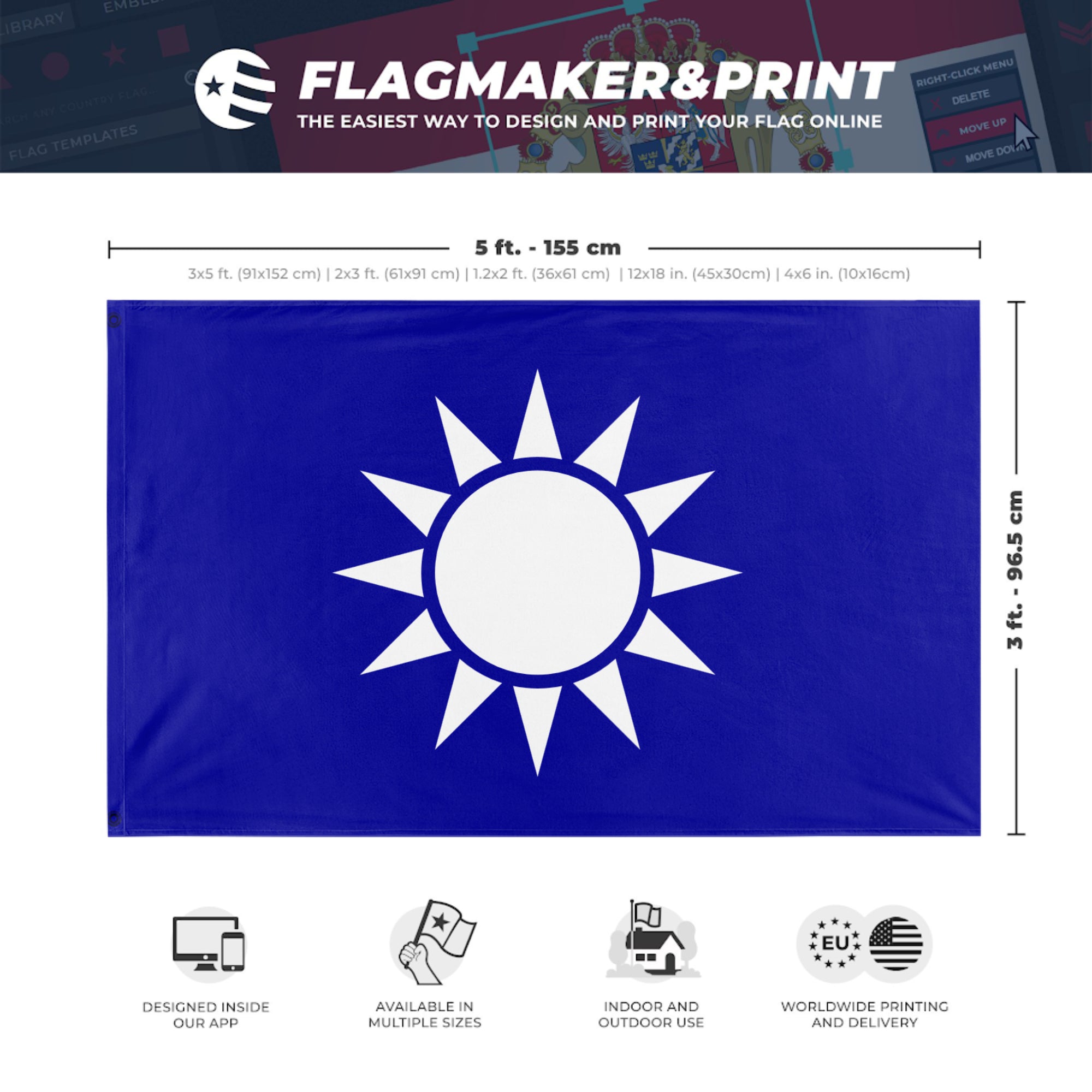 Our integrated flag maker app allows anyone to design and print their own flag. After finishing your design, you can print your flag in three easy steps.