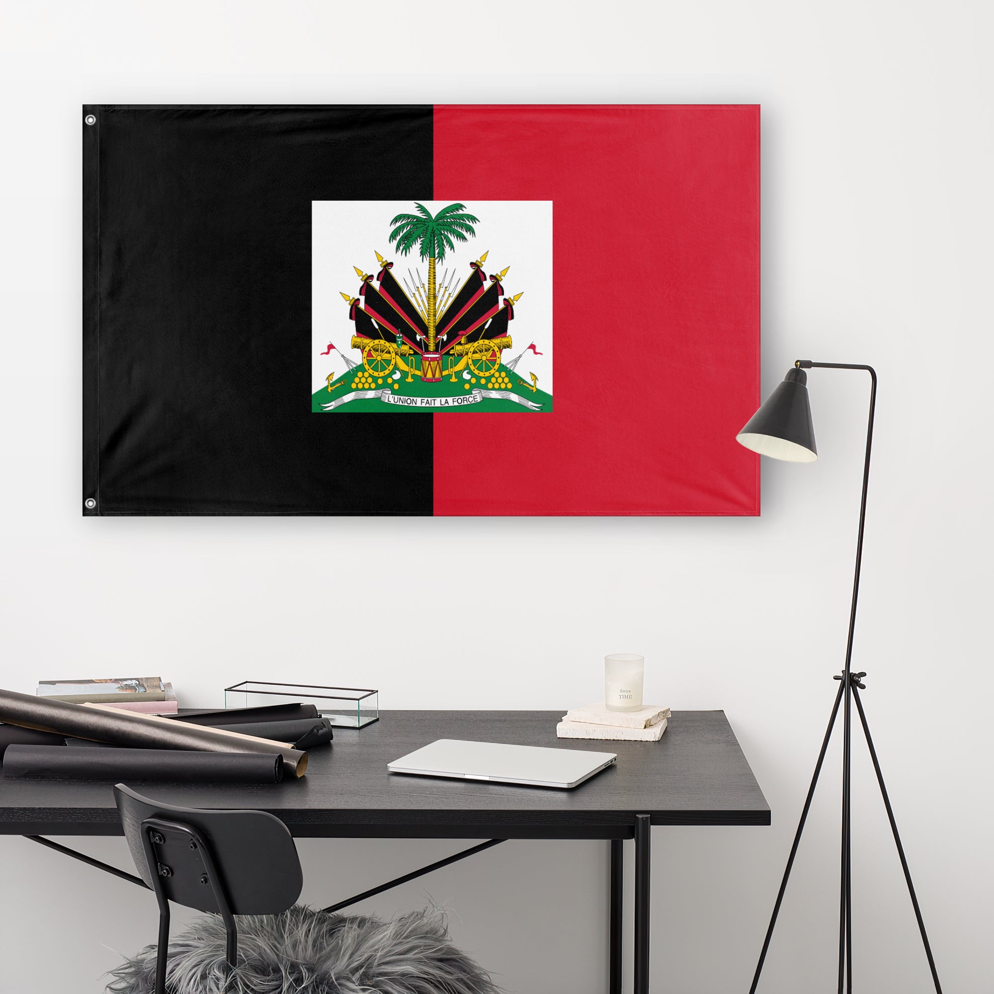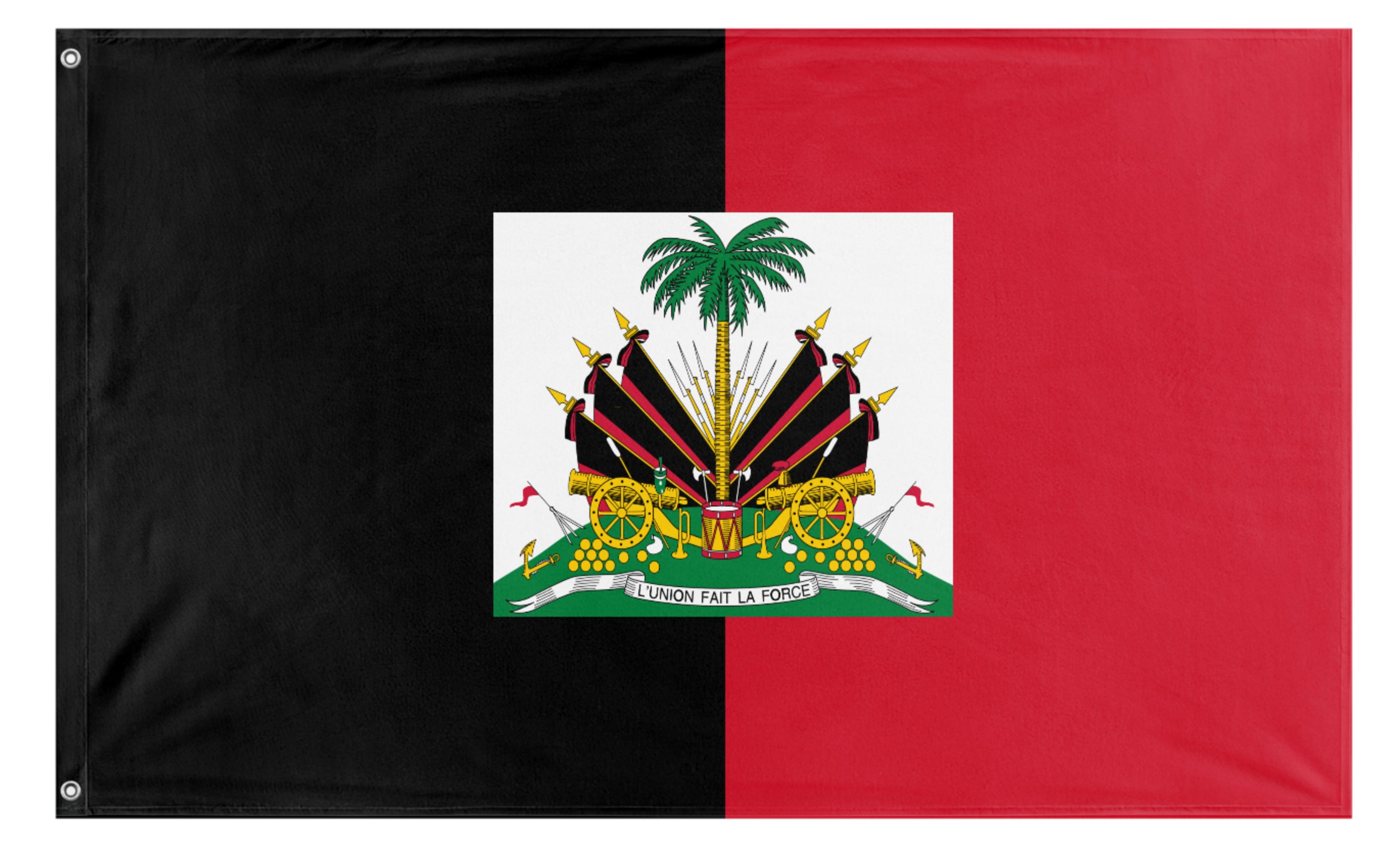 50 percent black on the left side and 50 percent red on the left side. With a national emblem in the middle.