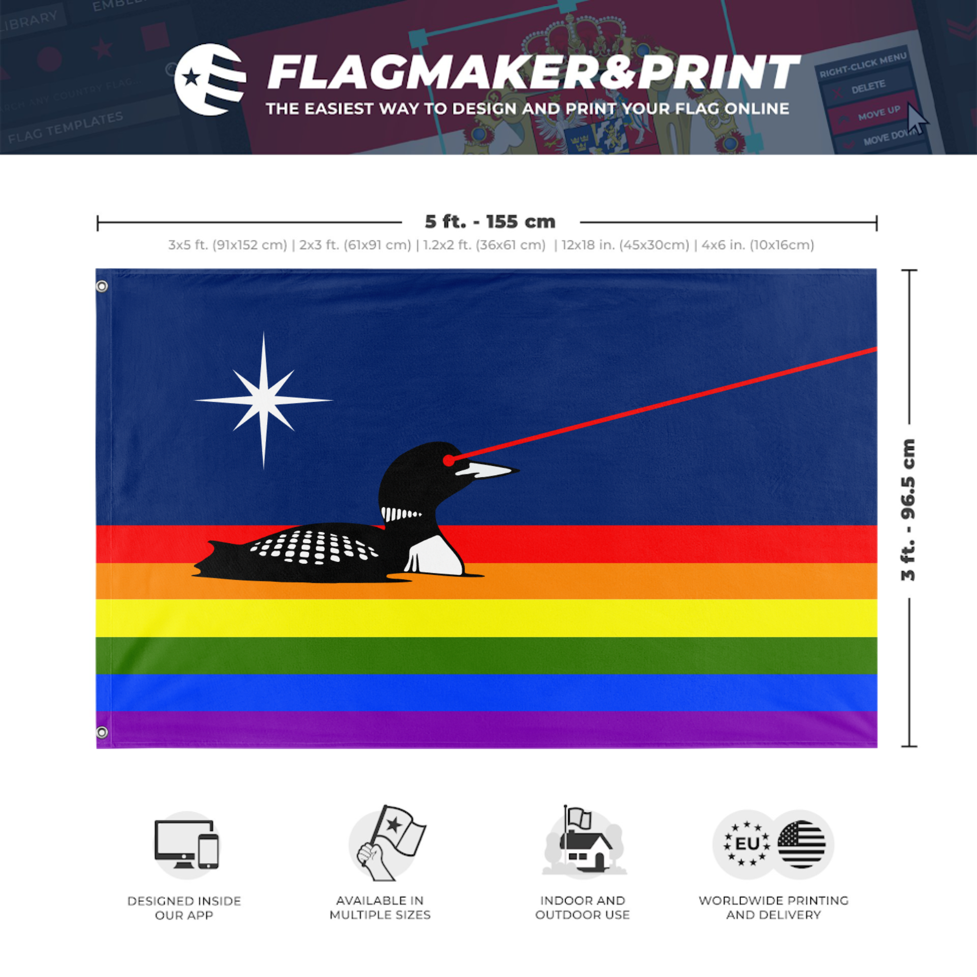 Our integrated flag maker app allows anyone to design and print their own flag. After finishing your design, you can print your flag in three easy steps.