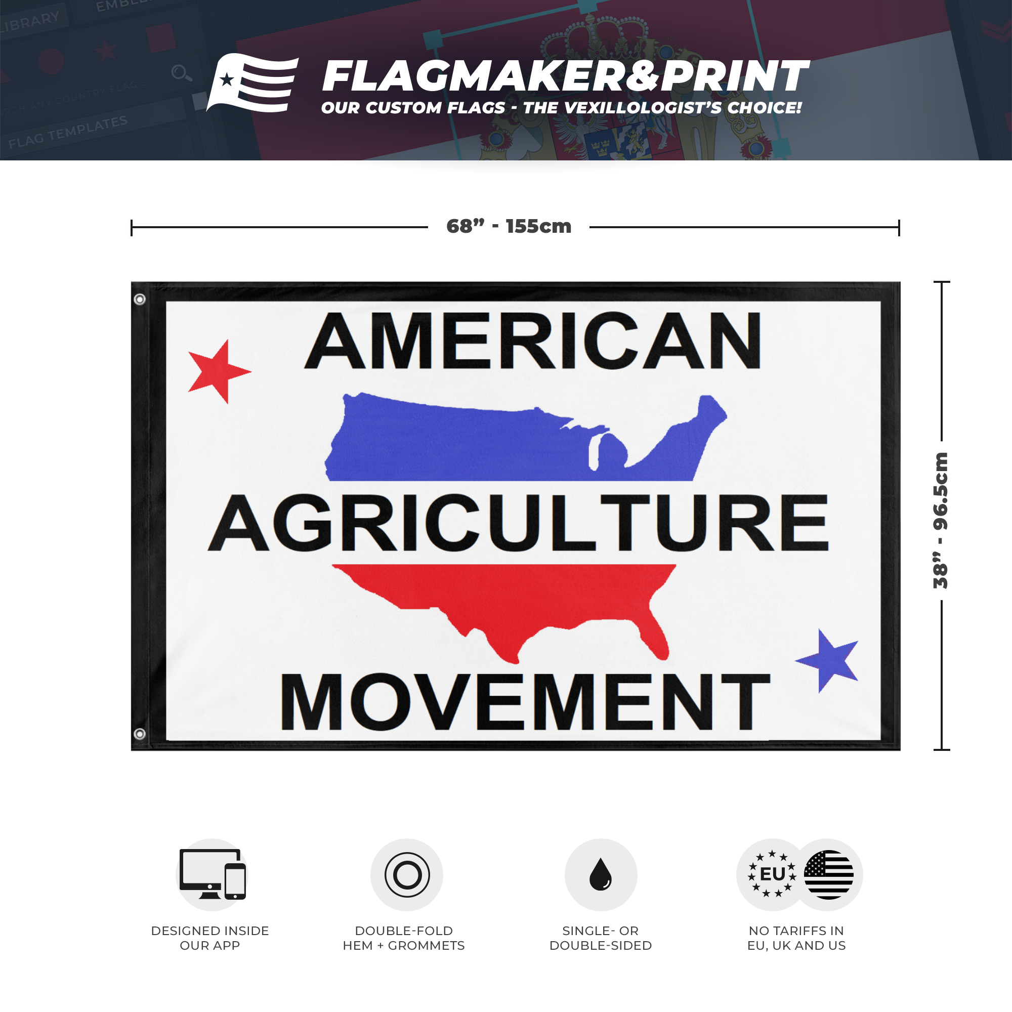 Our integrated flag maker app allows anyone to design and print their own flag. After finishing your design, you can print your flag in three easy steps.