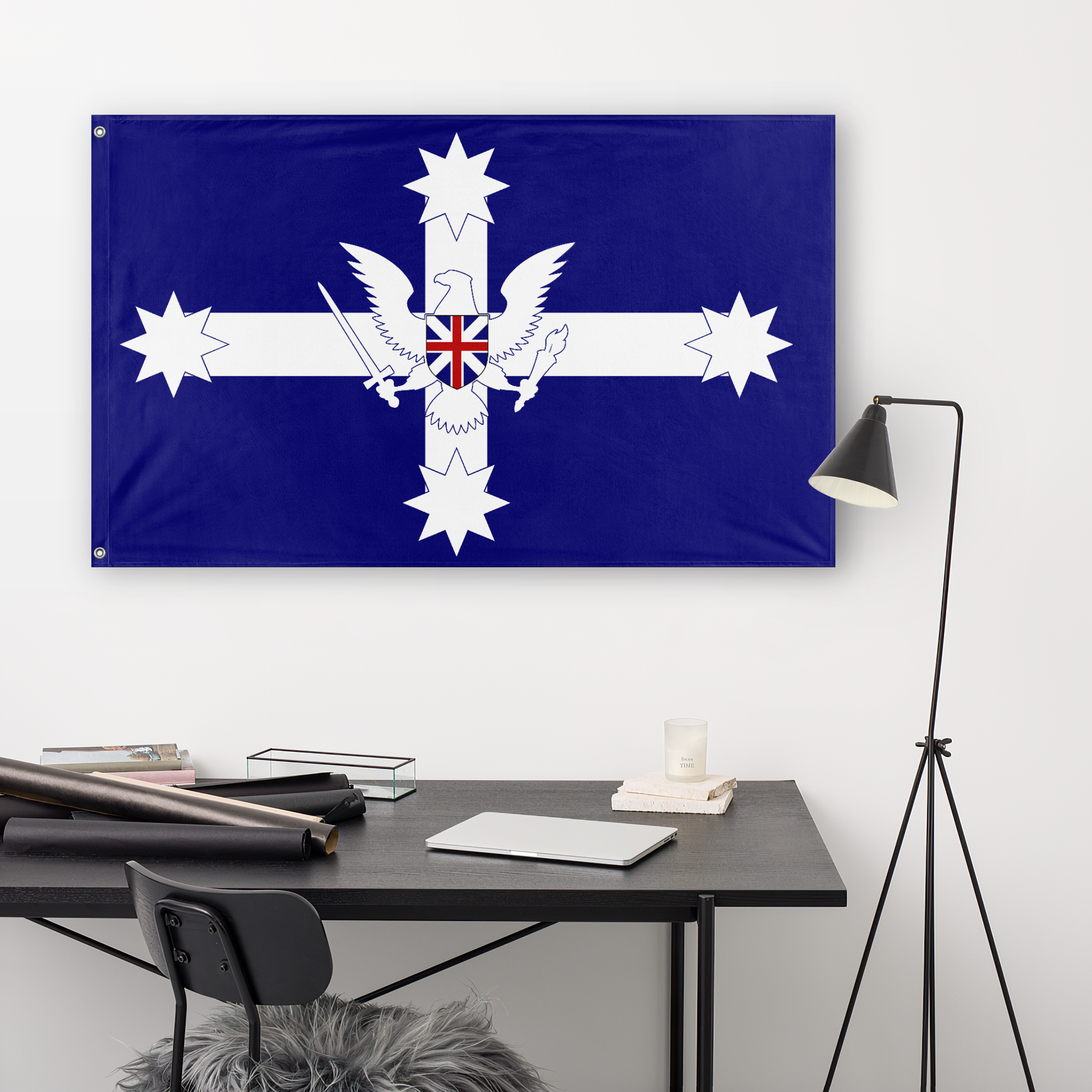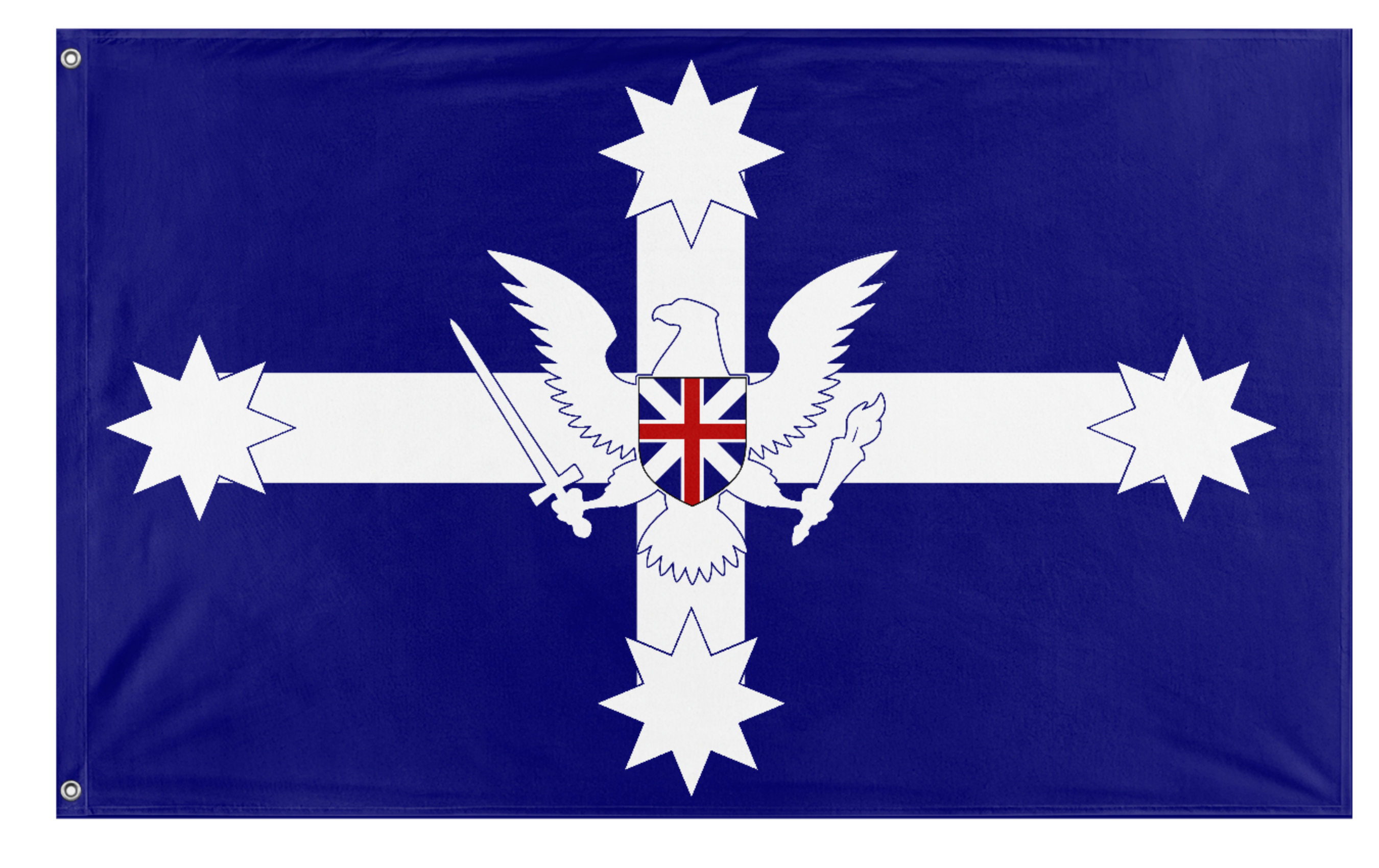 This is the Eureka flag with an eagle emblem replacing the center star. The symbolism for the base flag remains the same: the stars represent the southern cross and the lines connecting them represent Australian unity. I've put the eagle in the center. Eagles have been used throughout western history to symbolize either Freedom and/or Military prowess. In this case the eagle represents the Australian people and their willingness to take up arms to deafened the sacred flame of liberty. The Union jack is in there because 1. it looks good and 2. is to emphasize our connection to the motherland. The Eagle. I cut out the eagle from Huey Longs American Union flag using power point like 2 years ago, I then in paint.net I flattened out the colors to make it solid white and gave it a blue outline, I then played around with it to get some good designs, once I had the current design I saved it to my phone and did nothing with it for like a year and then two days ago I decided to do this. After uploading the Eagle emblem it gave me the pixel warning so I up sized it from about 1000x1000 to about 4000x4000 by Tracing it.
