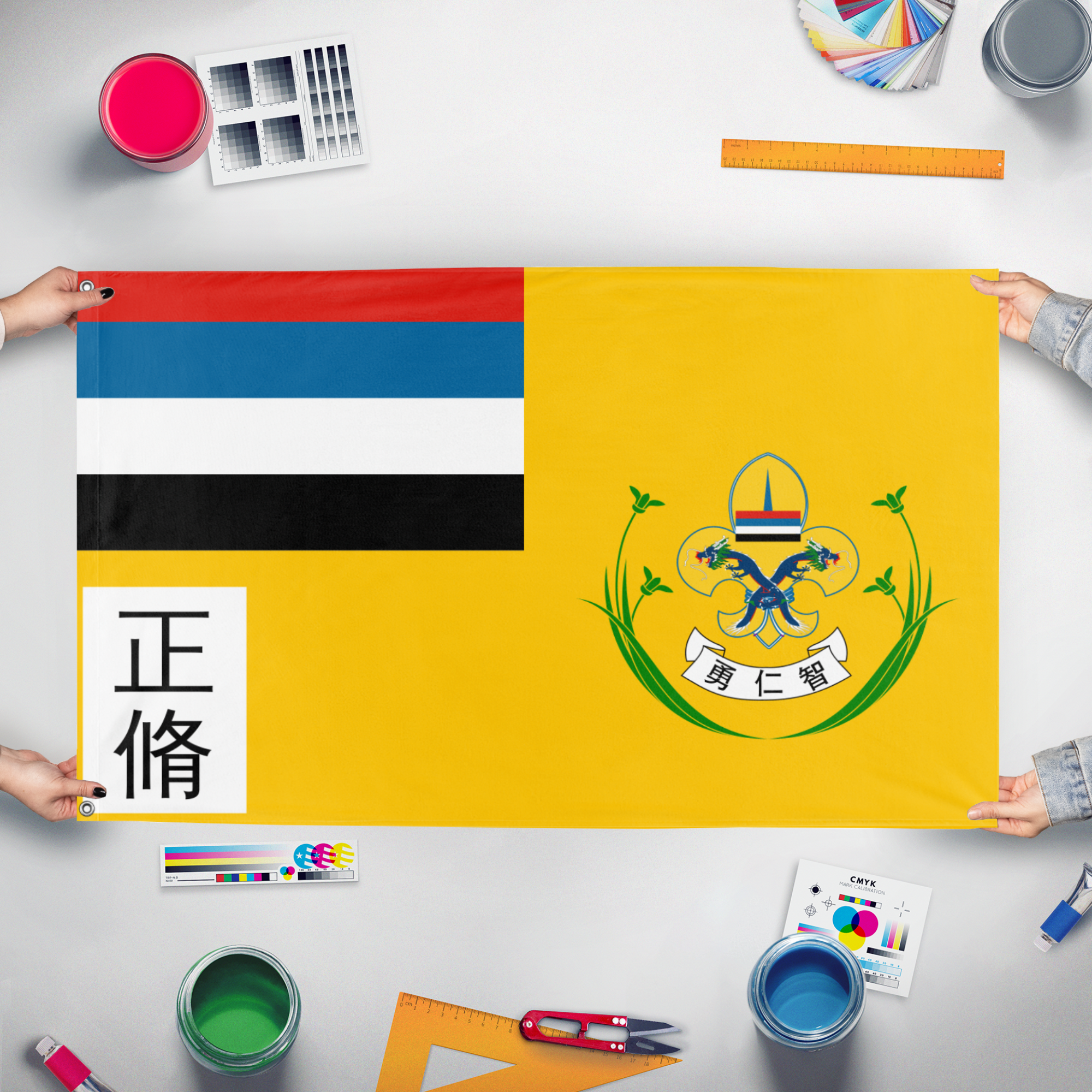 Our integrated flag maker app allows anyone to design and print their own flag. After finishing your design, you can print your flag in three easy steps.