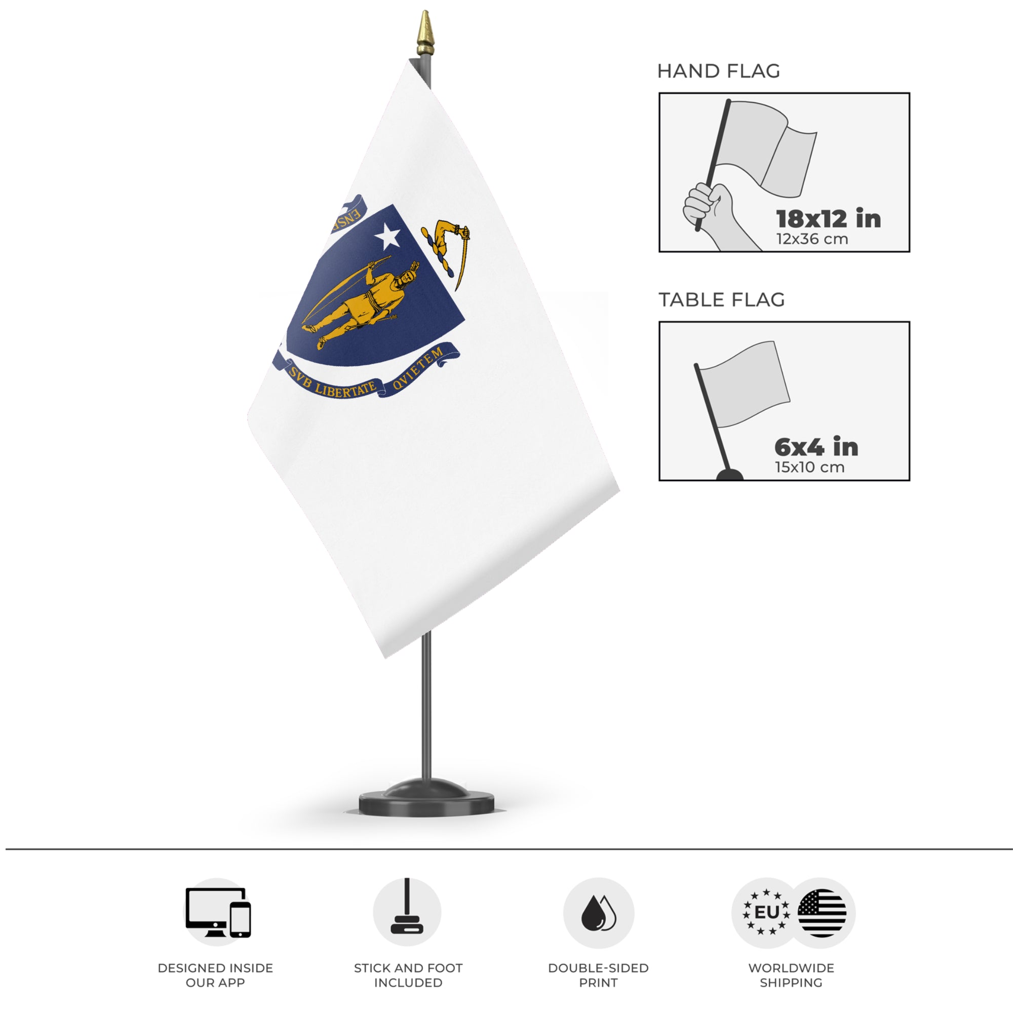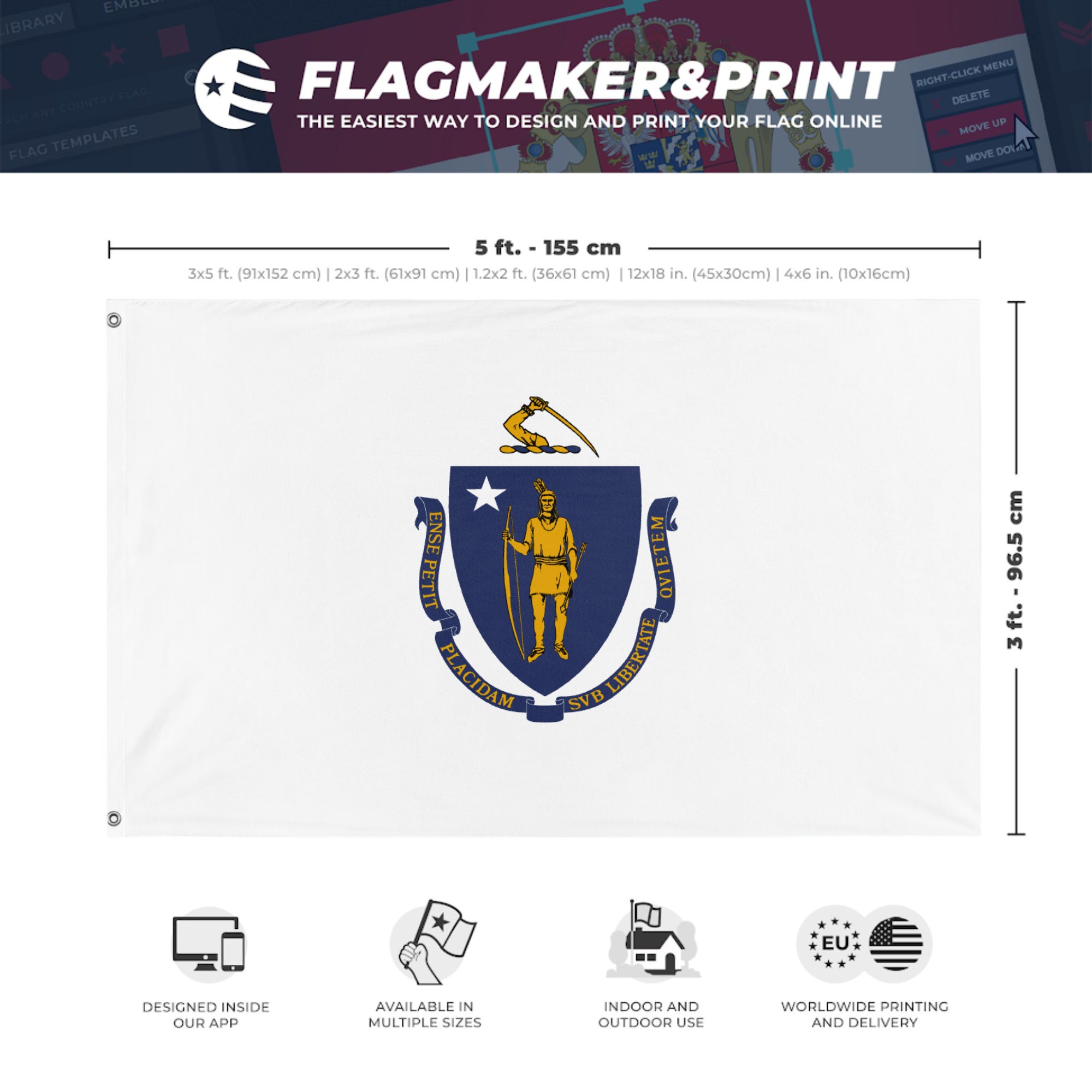 ✒️ The state flag of Massachusetts features a white field with the state coat of arms centered. The coat of arms depicts a Native American holding a bow and arrow, with the arrow pointed downward, symbolizing peace. Above the figure is a blue shield with a white star, representing Massachusetts as one of the original thirteen states. Above the shield is a bent arm holding a sword, symbolizing the fight for liberty. Beneath the shield is a ribbon bearing the state motto, "Ense Petit Placidam Sub Libertate Quietem," which translates to "By the sword we seek peace, but peace only under liberty." The flag was officially adopted in 1971, reflecting Massachusetts’s history and commitment to freedom.