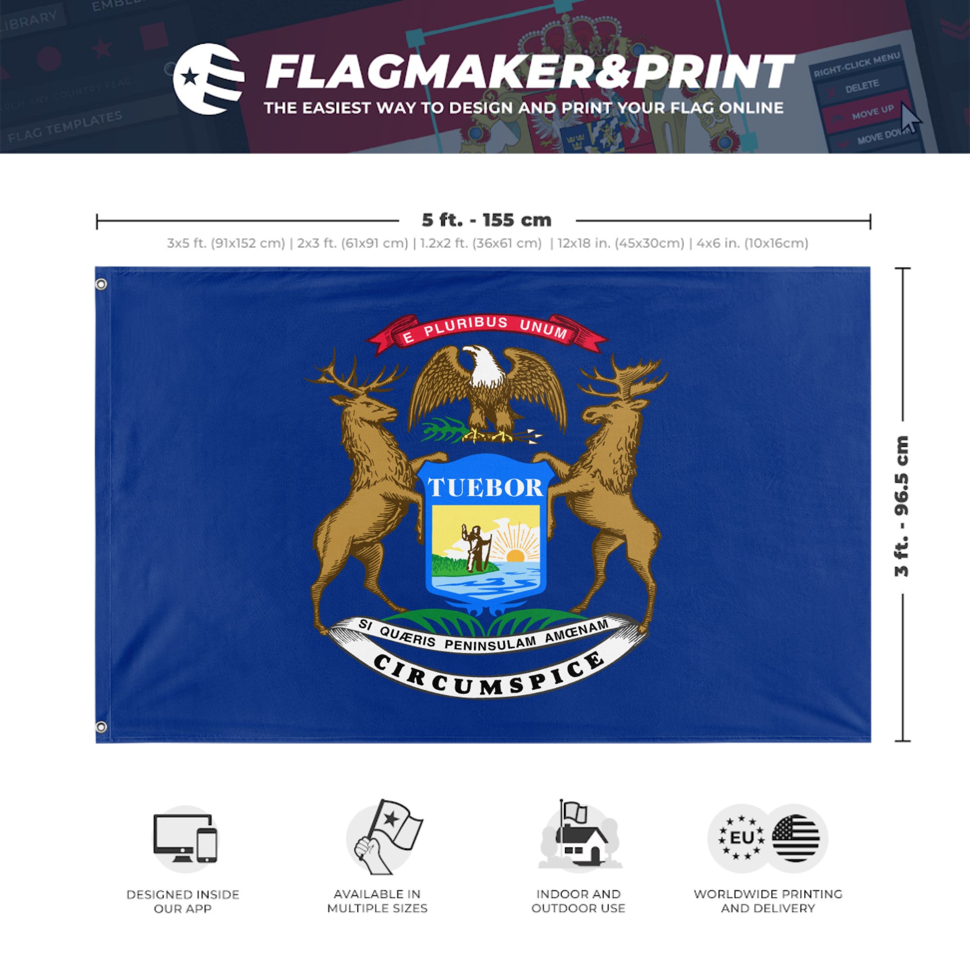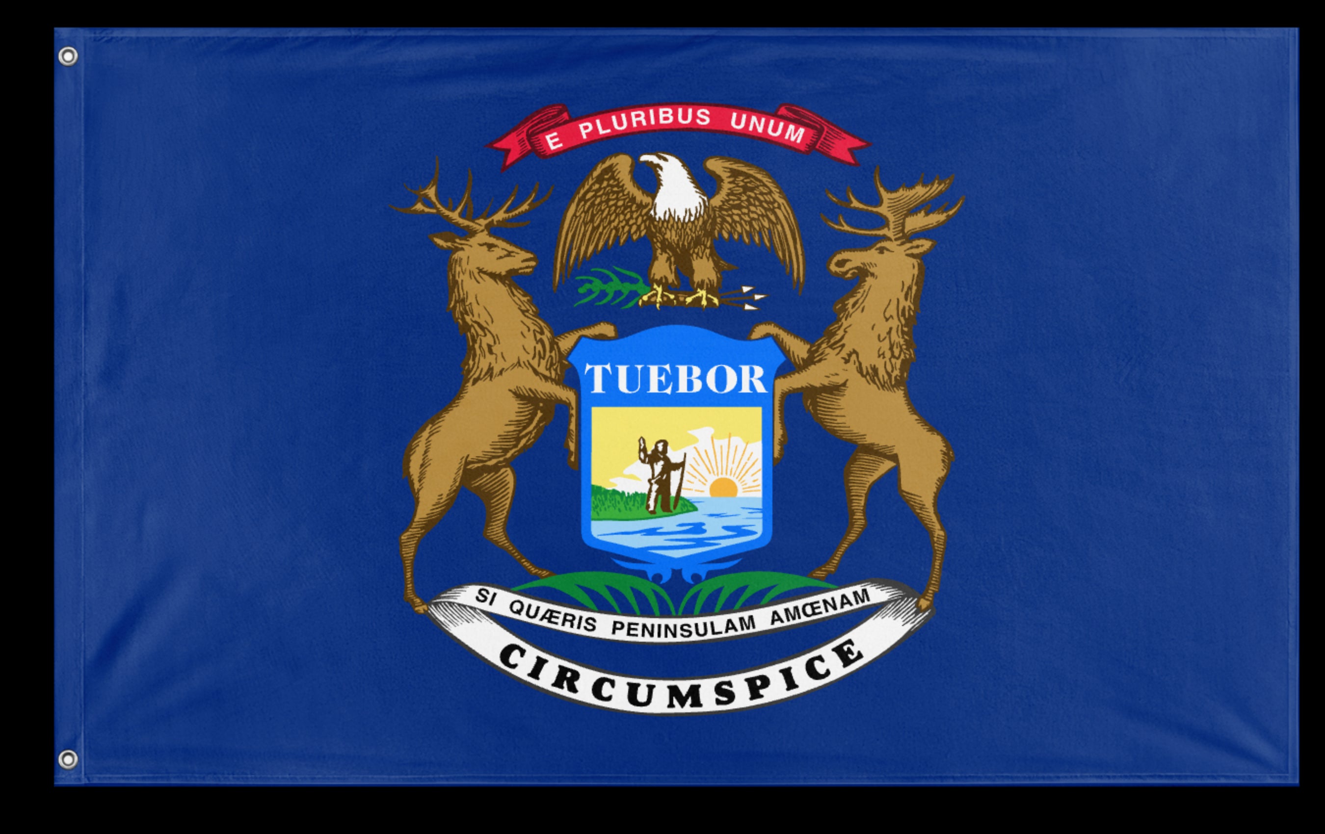 ✒️ The state flag of Michigan features a dark blue field displaying the state coat of arms at its center. The coat of arms includes a shield with a depiction of a lake and a peninsula, symbolizing Michigan’s natural geography. Above the shield is a bald eagle representing the United States. Supporting the shield are an elk and a moose, emblematic of Michigan’s wildlife. The flag also bears three Latin mottos: "E Pluribus Unum" (Out of many, one) on the eagle’s banner, "Tuebor" (I will defend) on the shield, and "Si Quaeris Peninsulam Amoenam Circumspice" (If you seek a pleasant peninsula, look about you), the state motto, below the shield. Officially adopted in 1911, the flag symbolizes Michigan’s natural beauty, strength, and commitment to unity and defense.