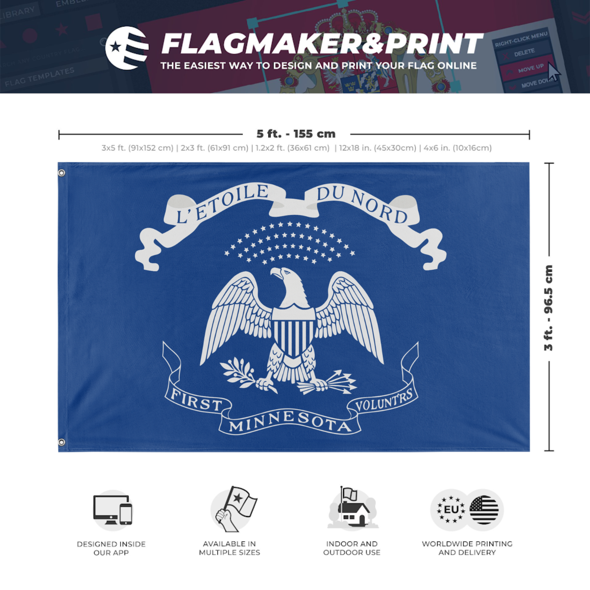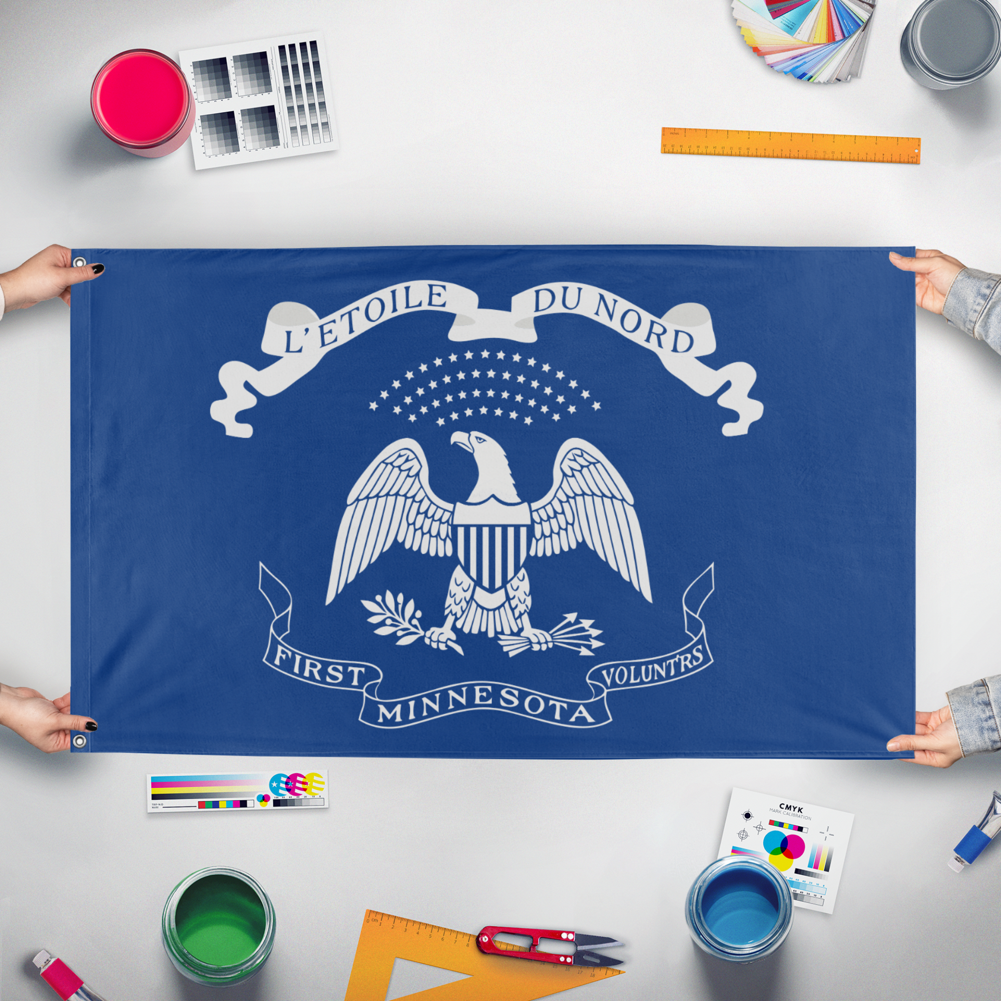 A modern recreation of the First Minnesota Volunteers flag. This flag gained popularity during the Minnesota Anti-ICE protests of 2026, and I received many requests to design and manufacture a sleek 'modernized' version of the flag with 50 stars. A pride version is also available.