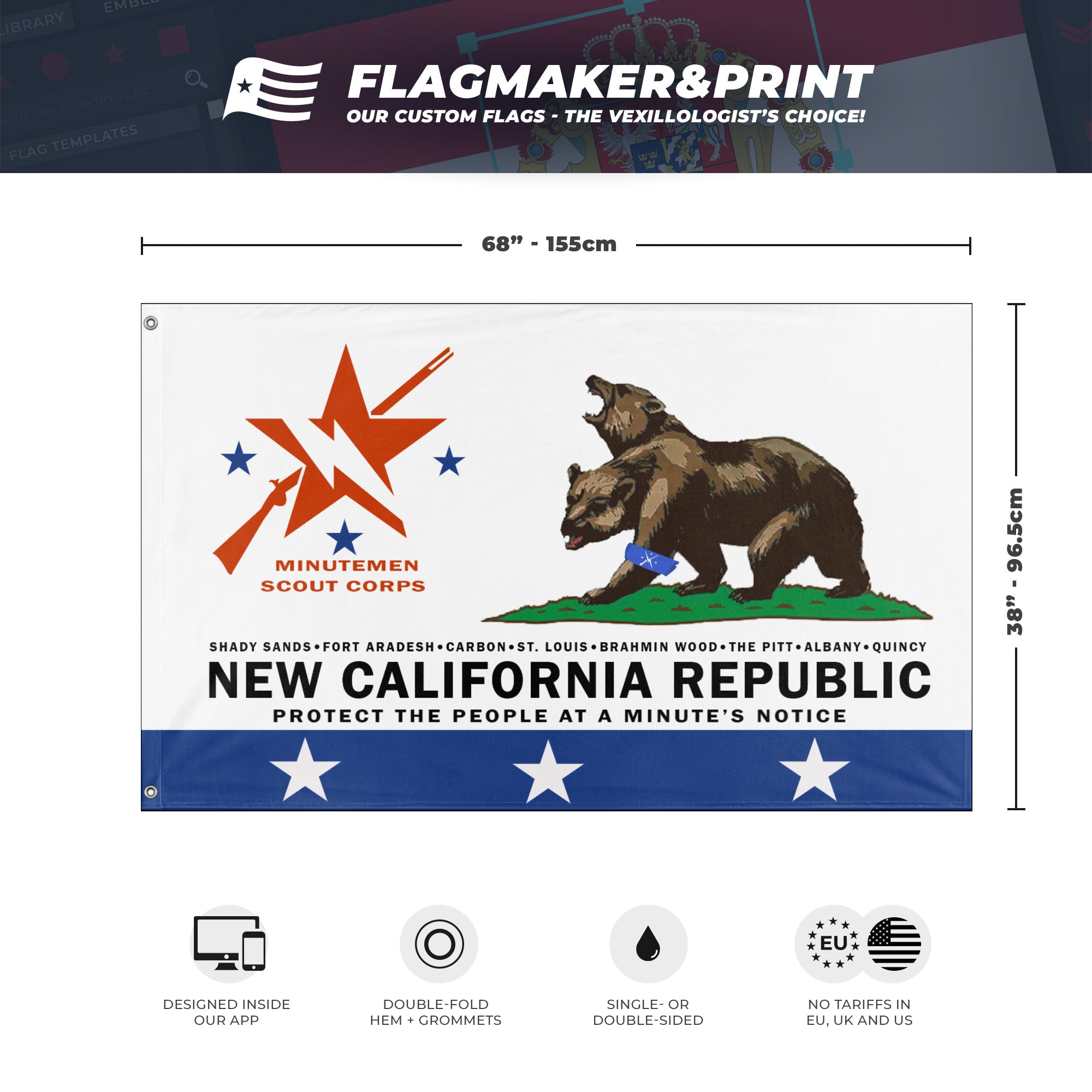 🎌 All our flags are 3x5ft, single - or double - sided, grommetted on the hoist side. If you have special requests, don't hesitate to reach out to us via our contact page!
