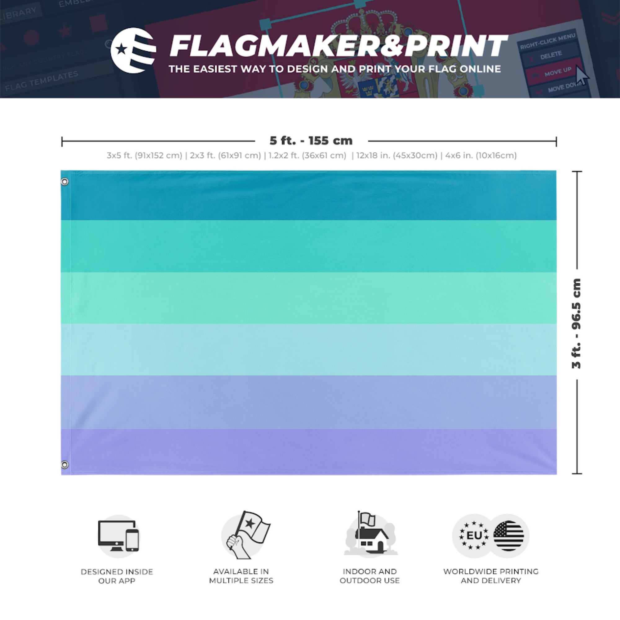 Our integrated flag maker app allows anyone to design and print their own flag. After finishing your design, you can print your flag in three easy steps.