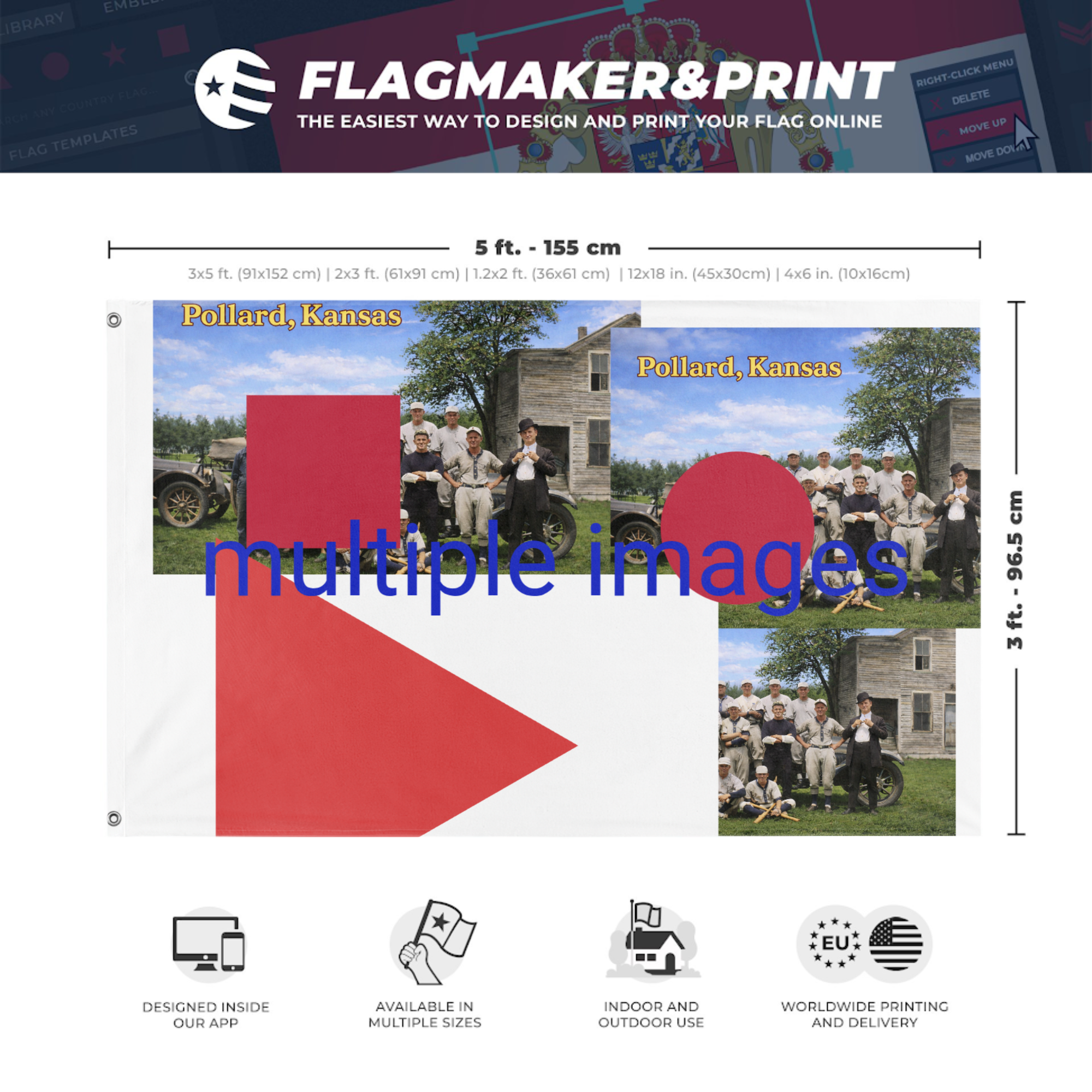 Our integrated flag maker app allows anyone to design and print their own flag. After finishing your design, you can print your flag in three easy steps.