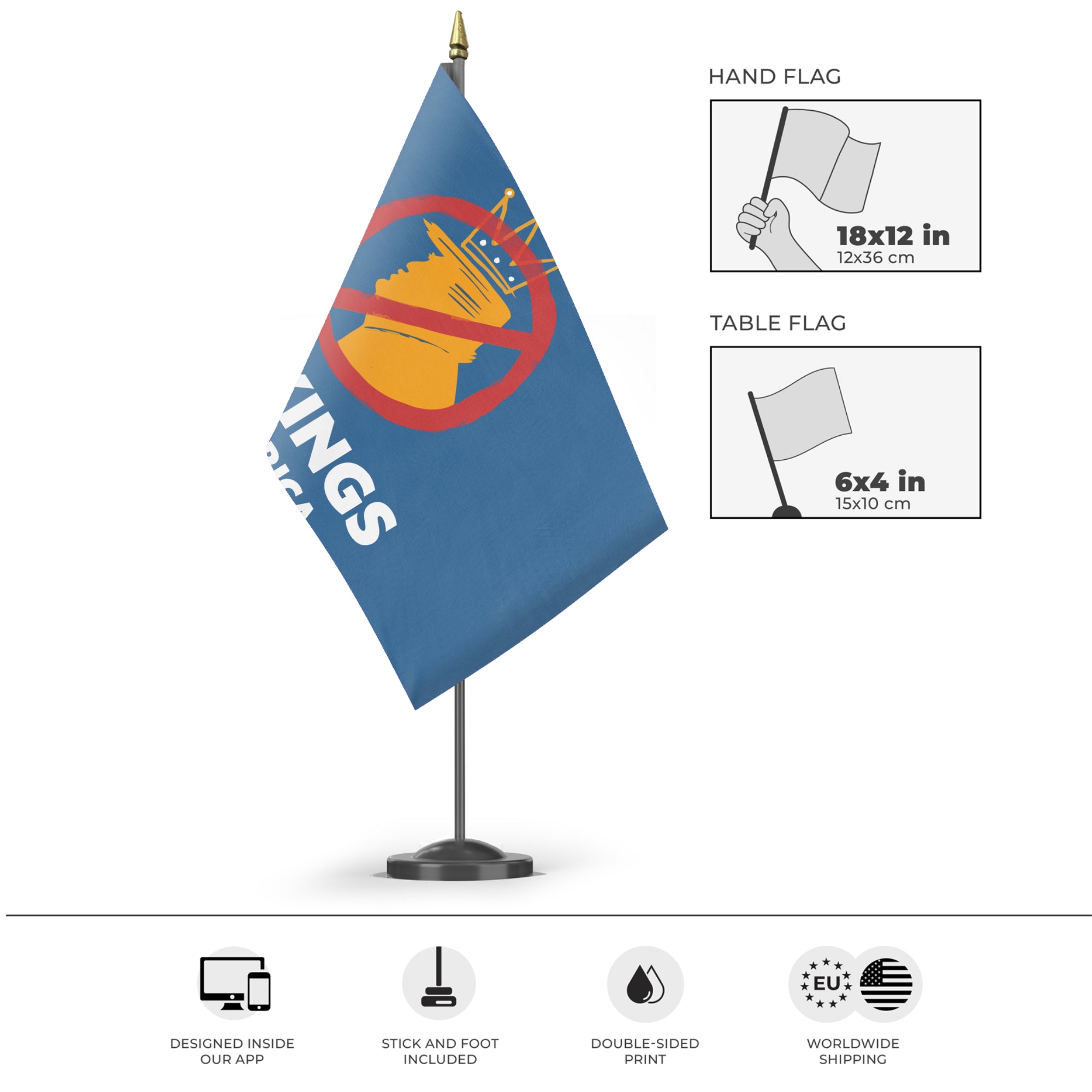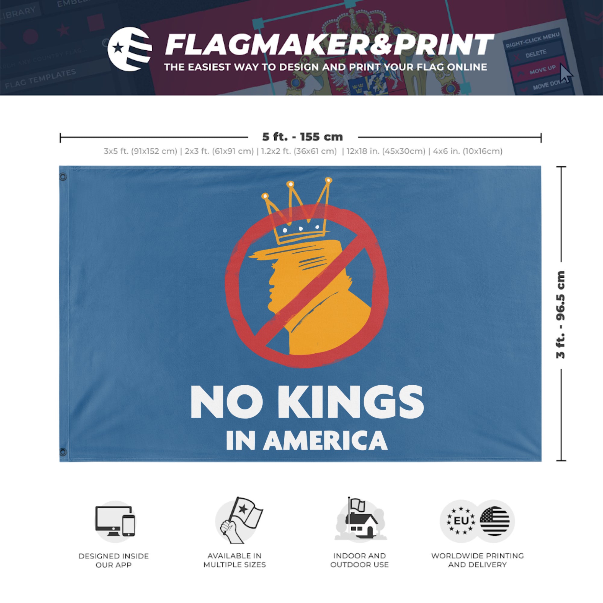✒️ The "No Kings In America" flag is a political protest banner that features a solid blue field. At its center is a graphic depicting an orange silhouette, identifiable as President Donald Trump, wearing a crown. This image is overlaid with a red "prohibited" or "no" symbol (a red circle with a diagonal slash). Below the graphic, the white, all-caps text "NO KINGS IN AMERICA" is displayed prominently. The flag's design directly communicates an anti-authoritarian message, equating the subject's political actions or aspirations with those of a monarch, which are fundamentally rejected. This flag is a key symbol of the "No Kings" movement, a series of large-scale, nationwide protests that emerged in the United States during 2025. Organized by a broad coalition of progressive groups, the movement protests what it describes as the authoritarian policies and democratic backsliding of the second Trump administration. The slogan and flag gained widespread visibility during major demonstrations, including the "No Kings Day" events on June 14, 2025. This date was chosen to contrast with a military parade and the president's 79th birthday, with organizers stating the protests served as a reminder that "America does not do kings."