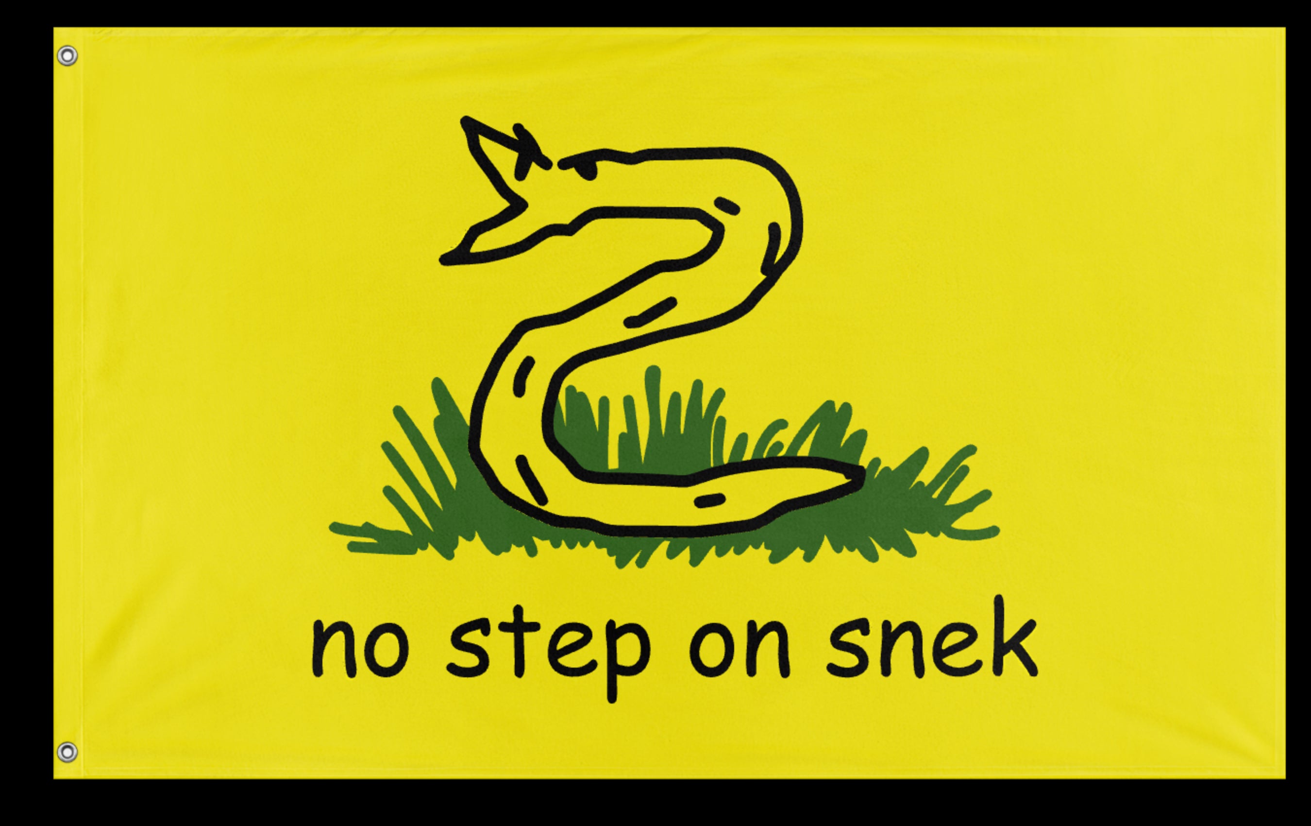 ✒️ The "No Step on Snek" flag is a humorous, internet-inspired parody of the Gadsden Flag, which features a coiled rattlesnake and the phrase "Don't Tread on Me." In this satirical version, the snake is crudely drawn and the caption is intentionally misspelled as "No Step on Snek," mimicking internet meme language. Originating from online communities such as Reddit and 4chan around the mid-2010s, the flag playfully mocks overly serious or aggressive libertarian and anti-government sentiments while still referencing the themes of personal liberty and resistance to oppression. It has since become a popular meme and is often used to express ironic patriotism or lighthearted defiance.