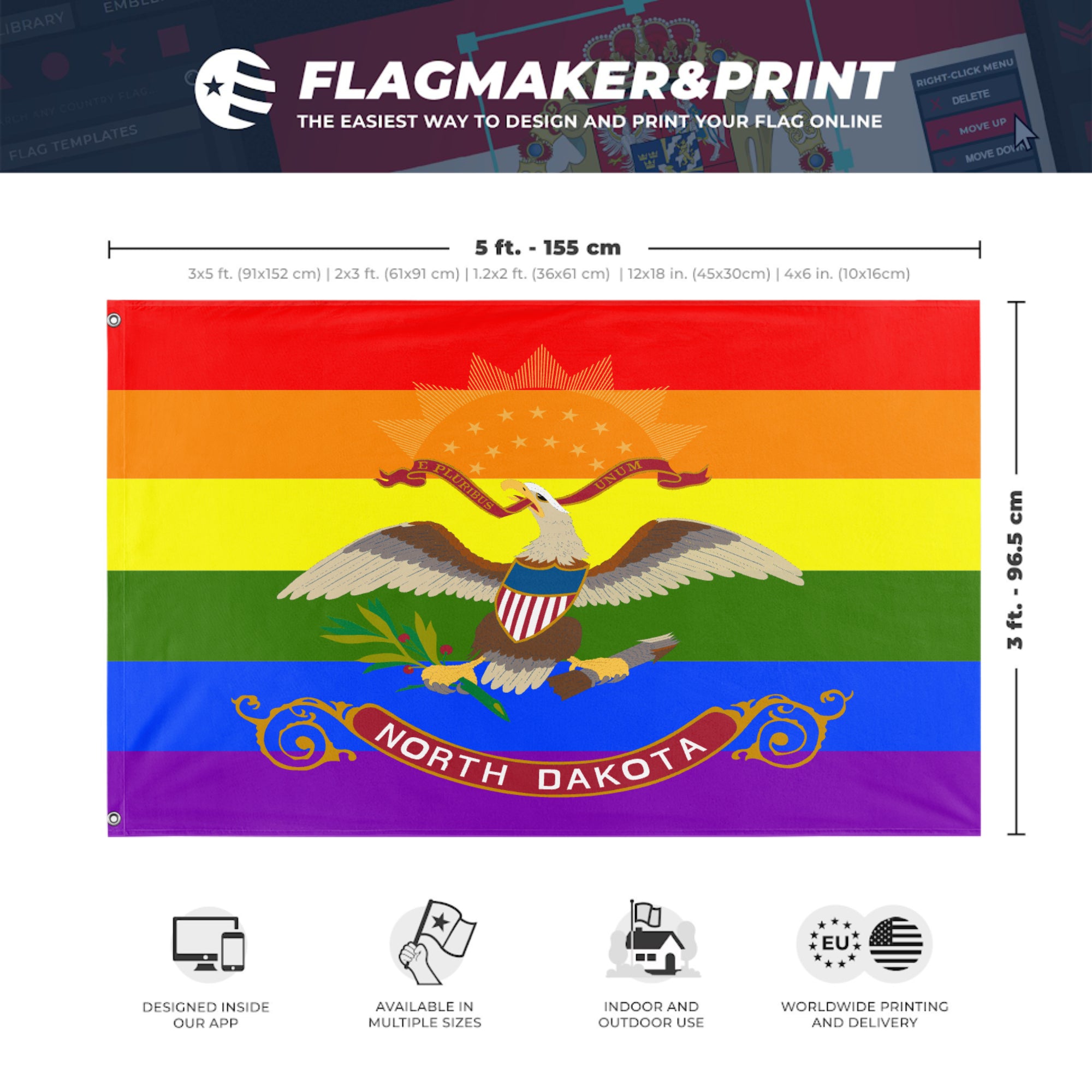 Our integrated flag maker app allows anyone to design and print their own flag. After finishing your design, you can print your flag in three easy steps.